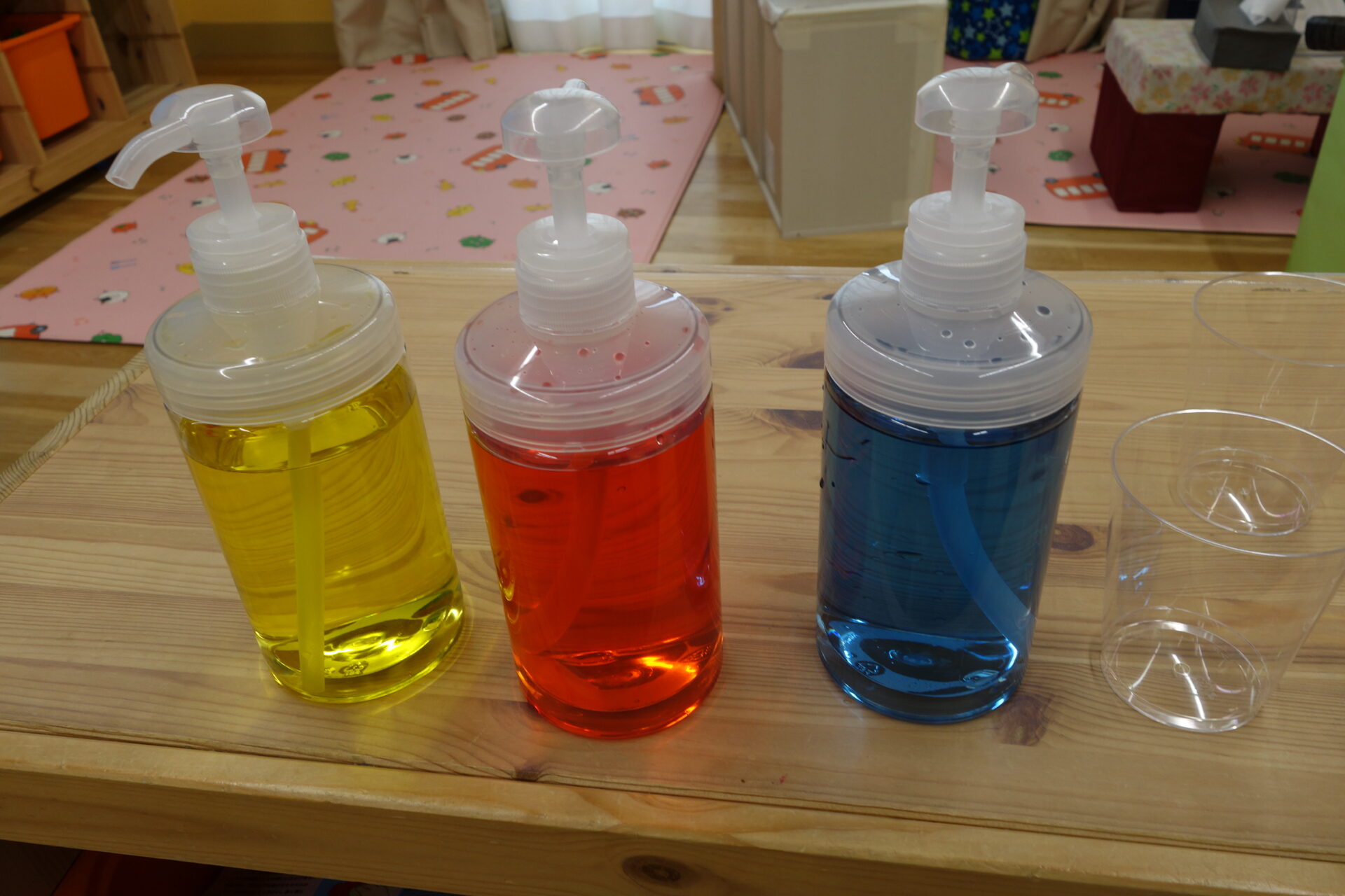 そこで、今日はいつもとは違い、色水遊びをすることにしました。