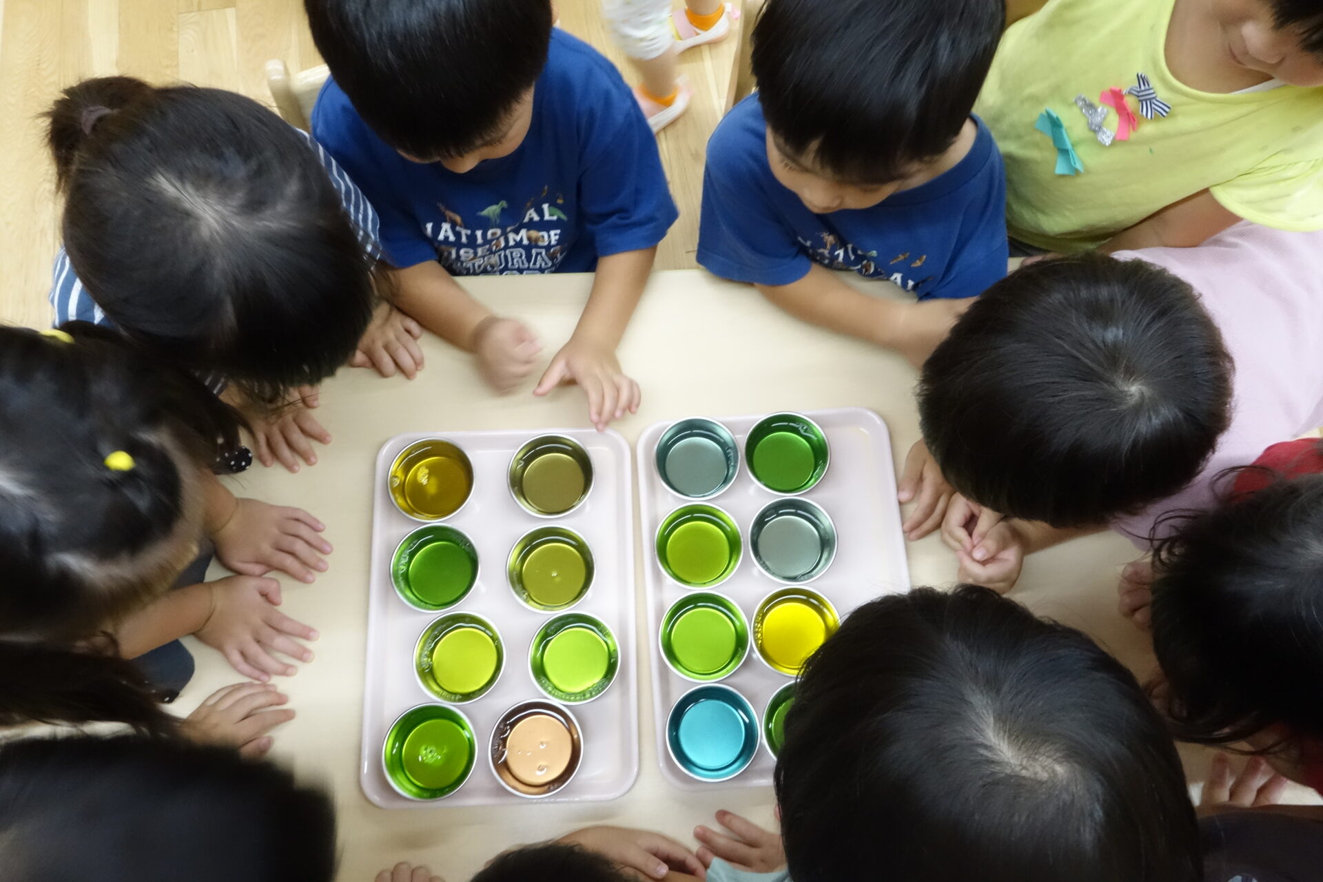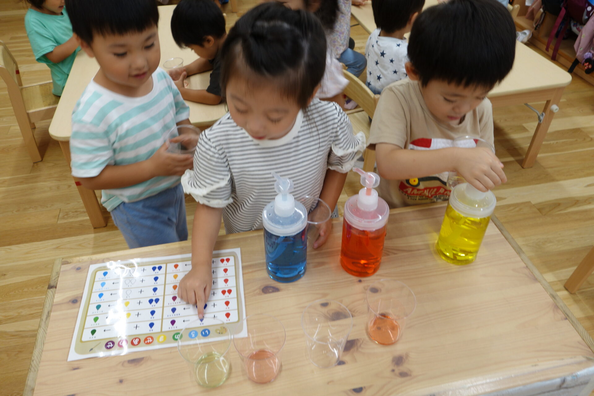 「好きな色を2回だけコップに入れていいよ。」と伝えると、自分達で選んで入れていきます。「紫になった!」「私のは緑になったよー!」と一人ひとり違う色ができたことにびっくりしている様子でした。