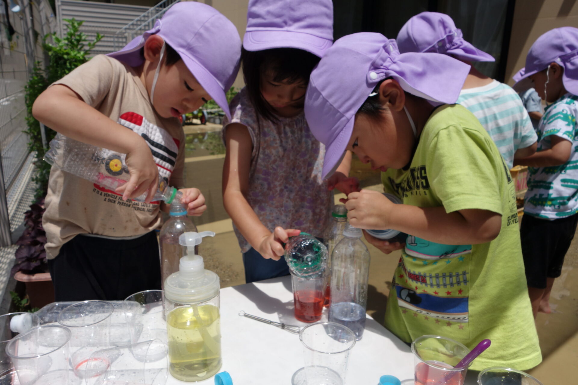 楽しかったから、お外にも持って行ってお外でもやってみよう!ということになり、用意して園庭にでました。園庭ではペットボトルも使ってたくさん色水を作り、何回もいろいろな色を混ぜて楽しんでいました。とっても真剣です!