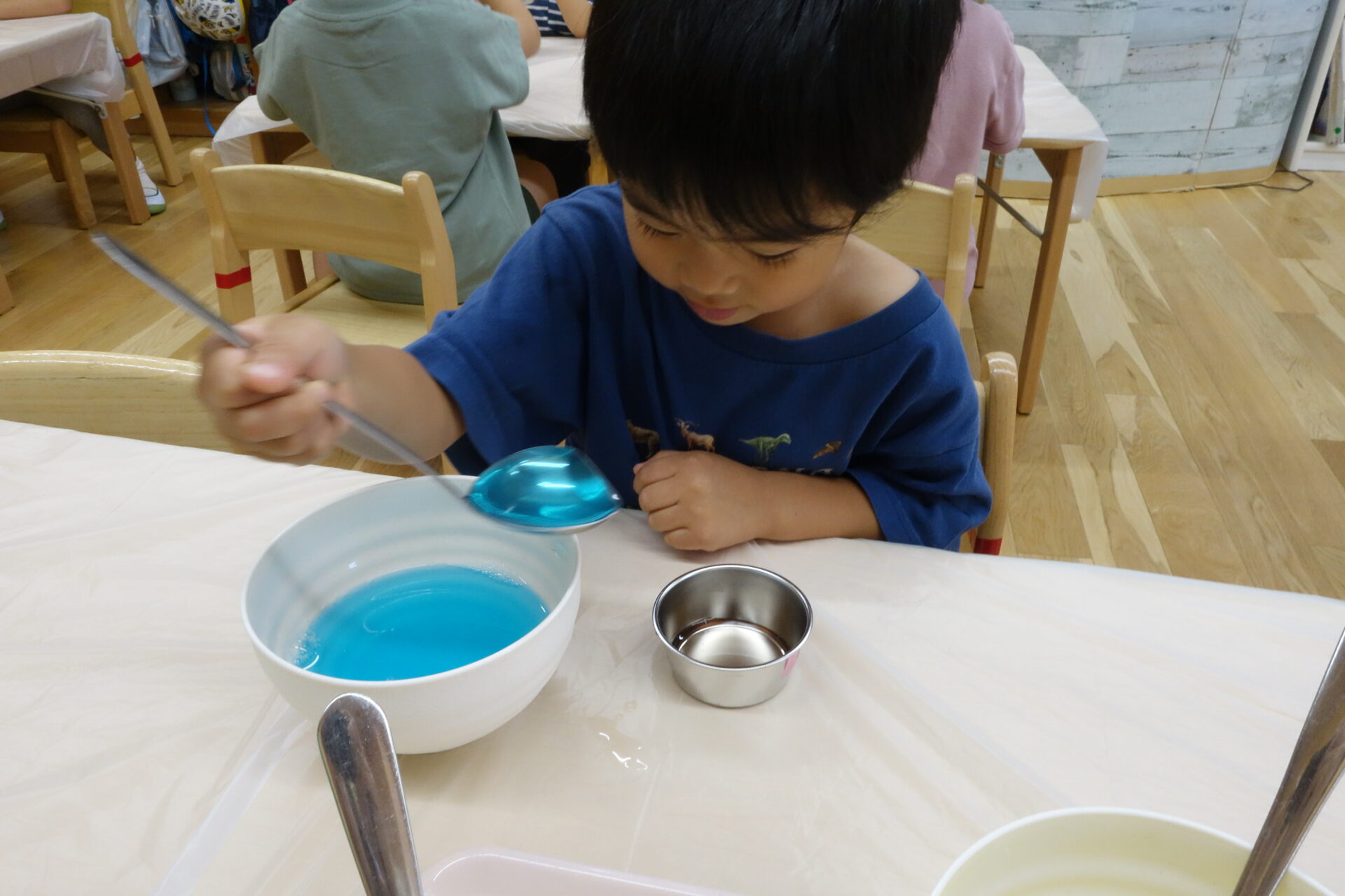 今日はおやつのゼリー作りに挑戦しました。いろんな色のゼリー液を混ぜて自分のオリジナルカラーのゼリーを作ります。