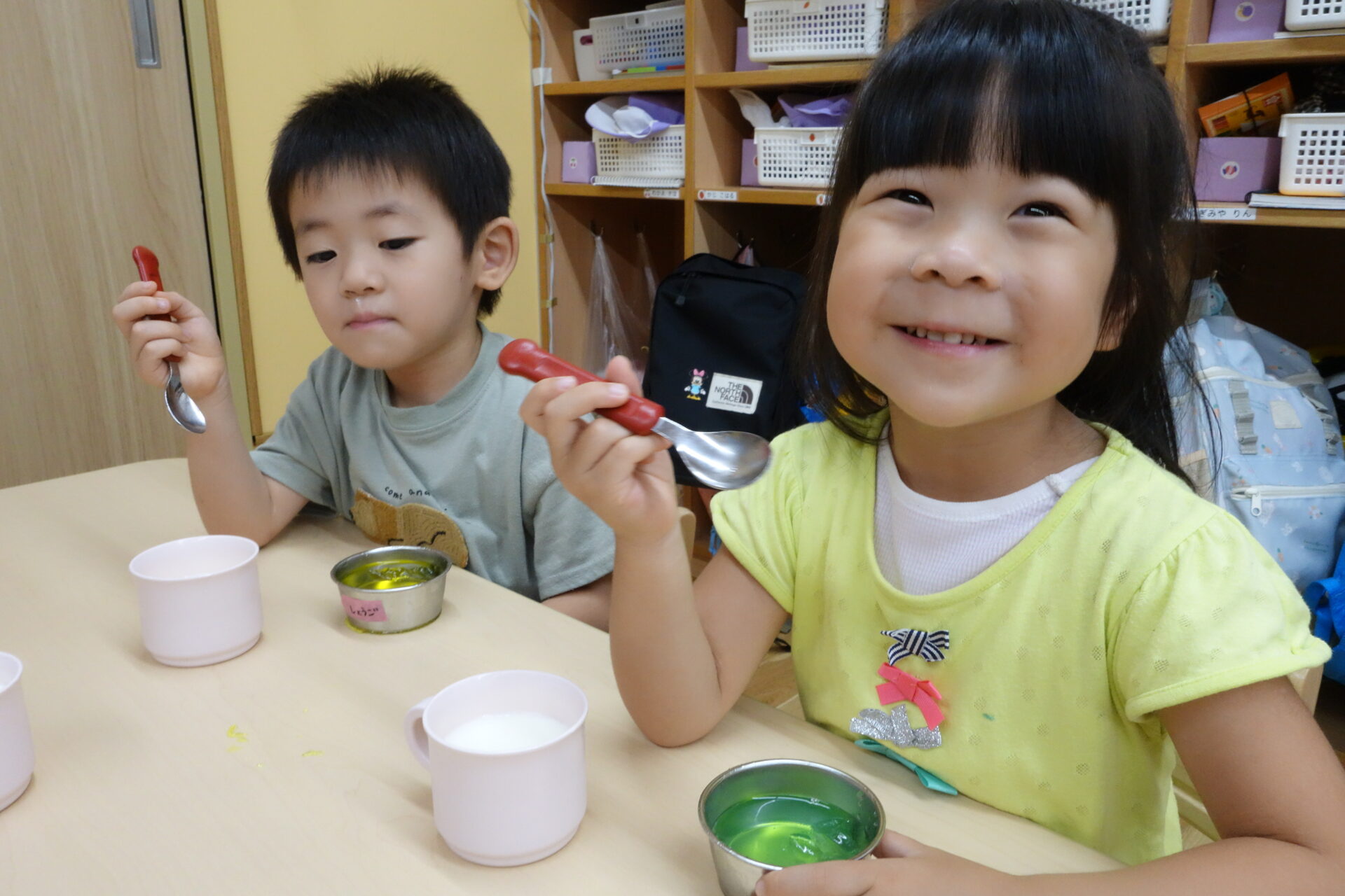 そしておやつの時間!みんなが作ったゼリーを食べます。「本当に固まってる!すごい!」と言いながら食べる前にスプーンで確認する姿がかわいかったです。