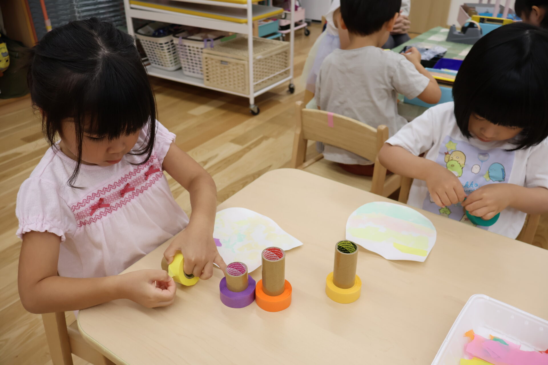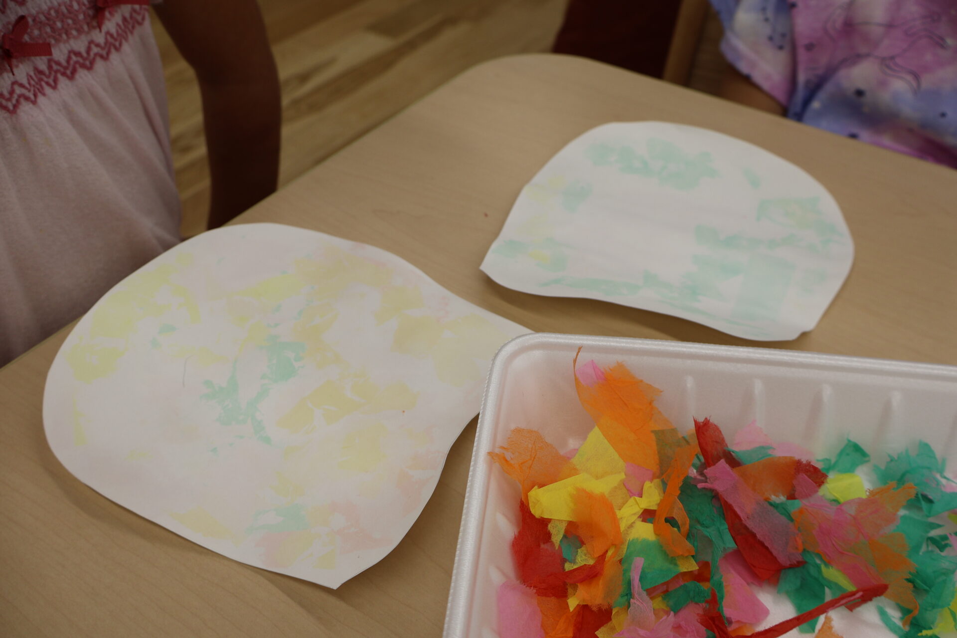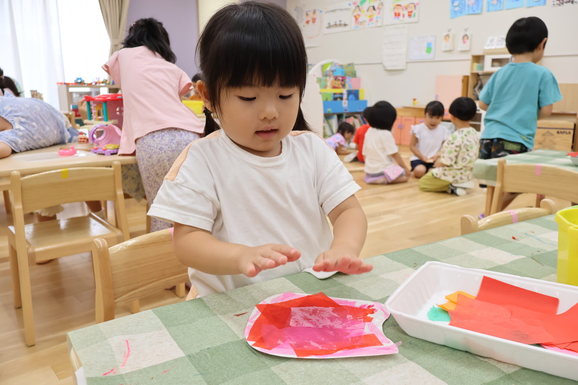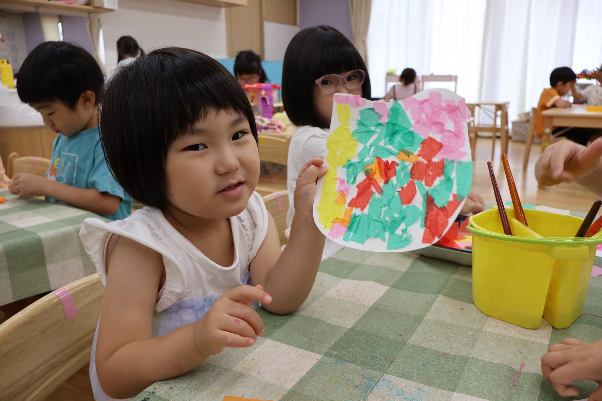 色を重ねて貼ってみたり、細くちぎって貼ってみたりと様々な貼り方を楽しむ子ども達でした😊