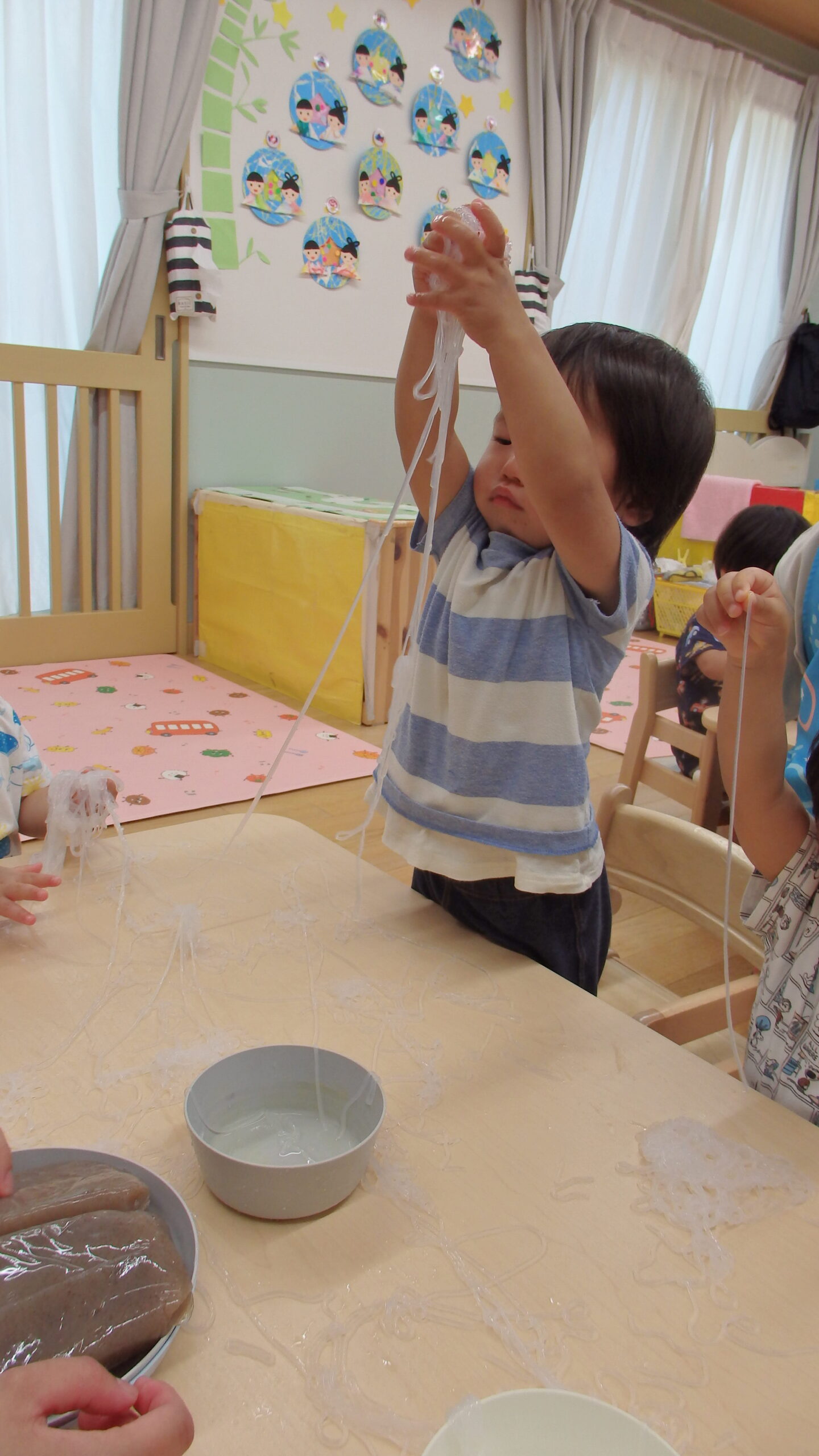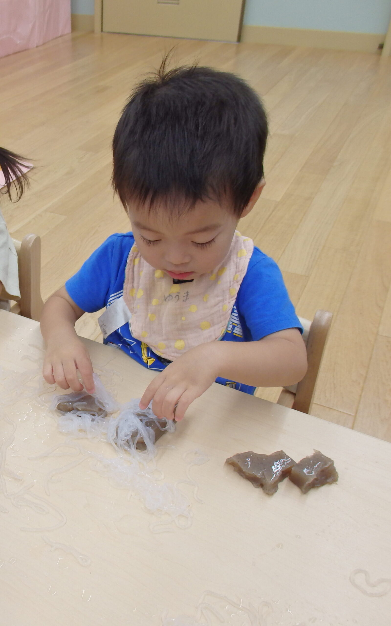 夏の感触あそび♬ ~こんにゃく・しらたき編~(1歳児)