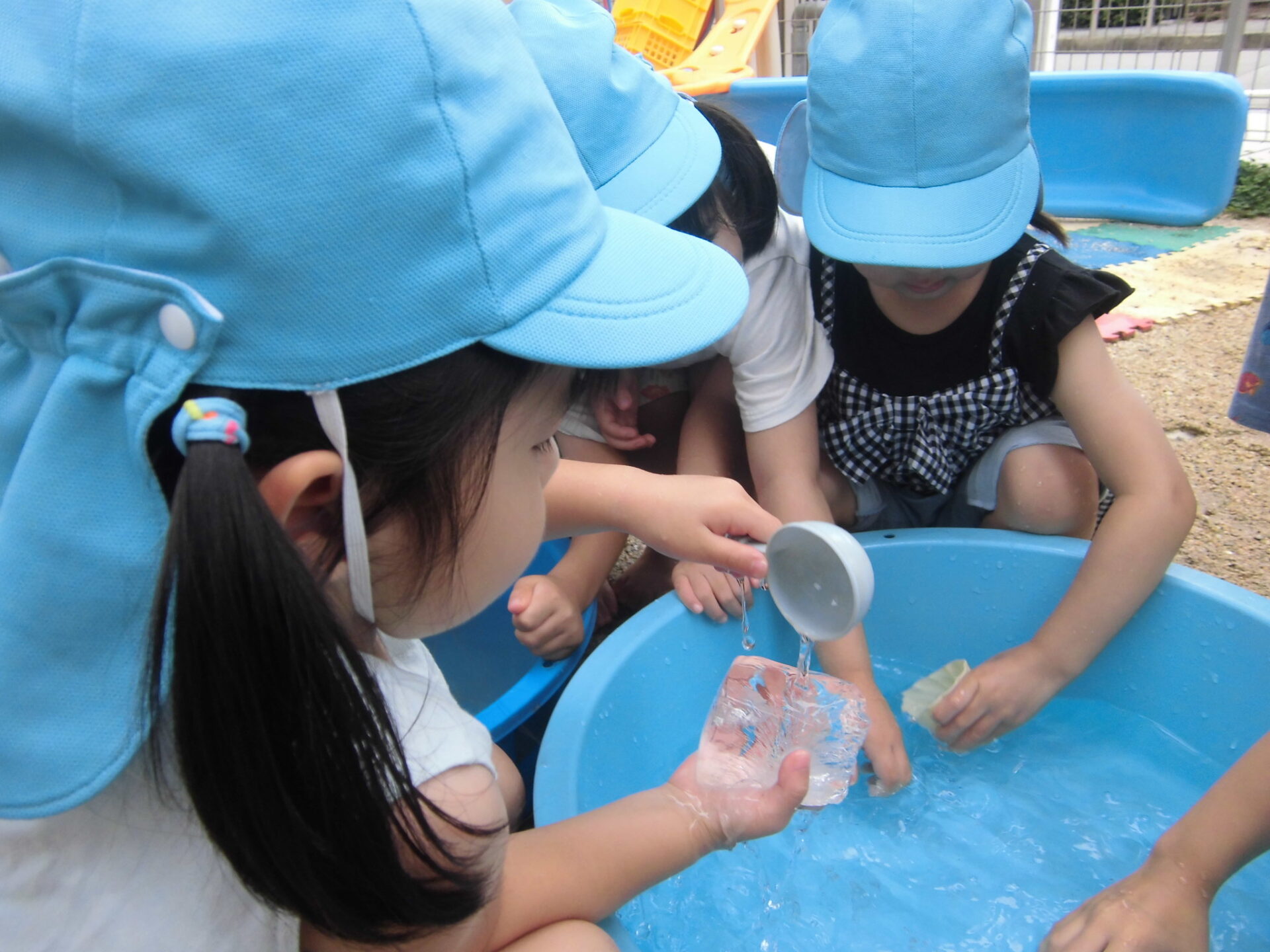 氷遊びでは、氷を触って冷たさを楽しんだり、カップに入れてお店屋さんごっこを楽しんでいます。