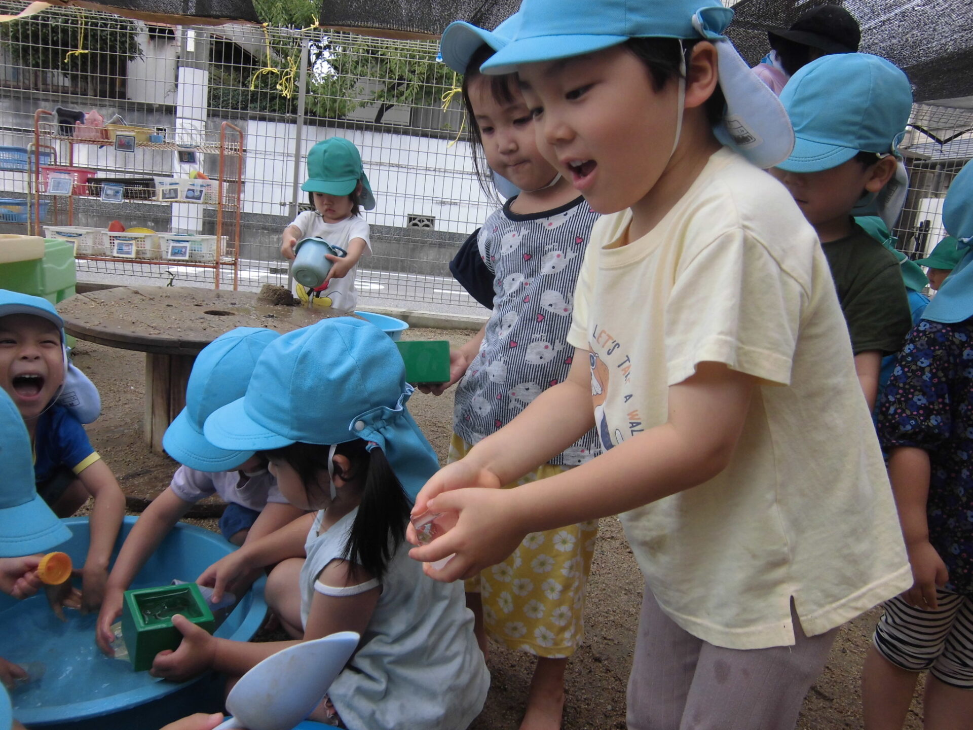 水遊びをする日には、「今日、水遊びの日だよね!」と登園してすぐに保育者に確認して、早く遊びたいと話しています。