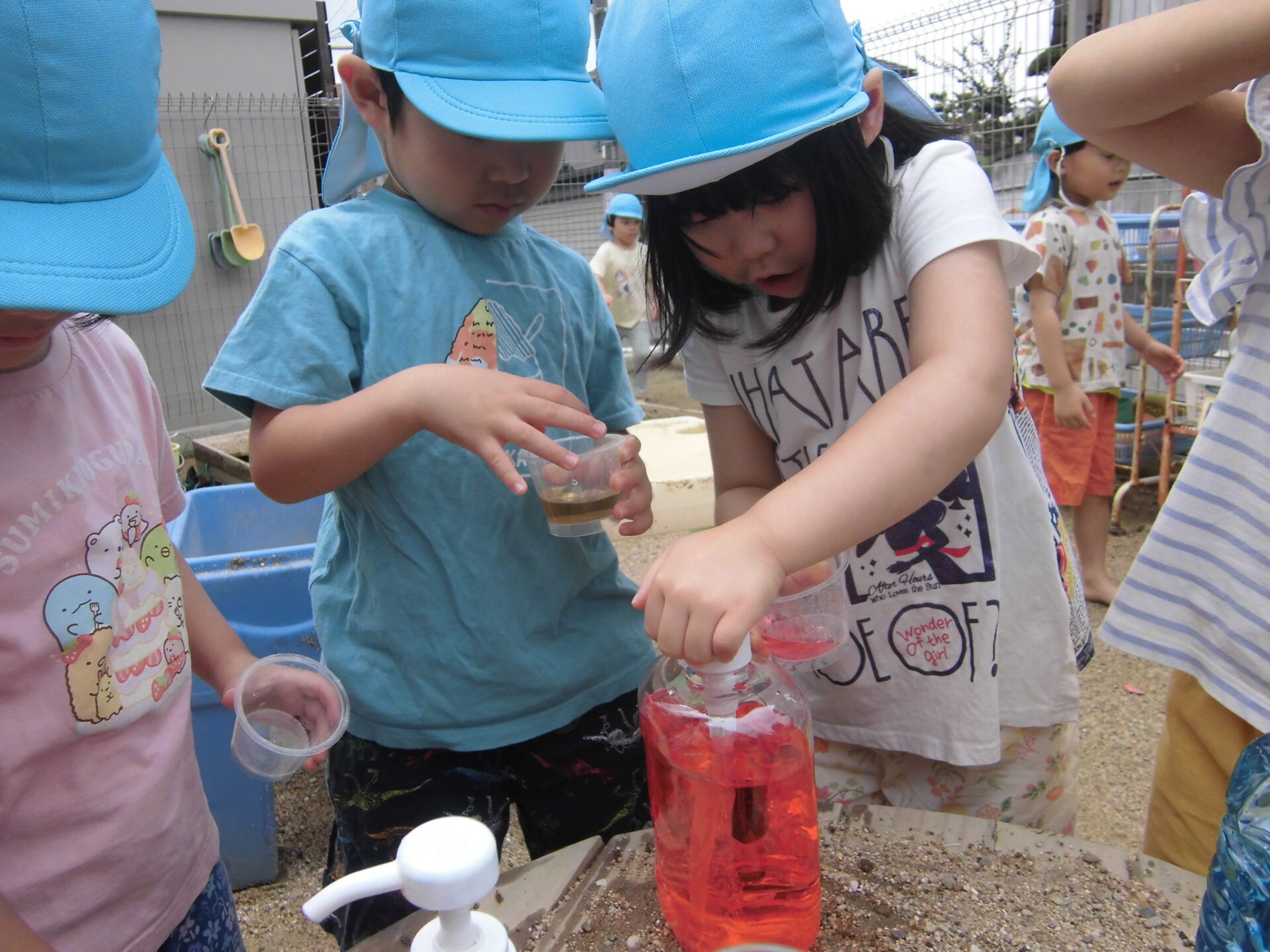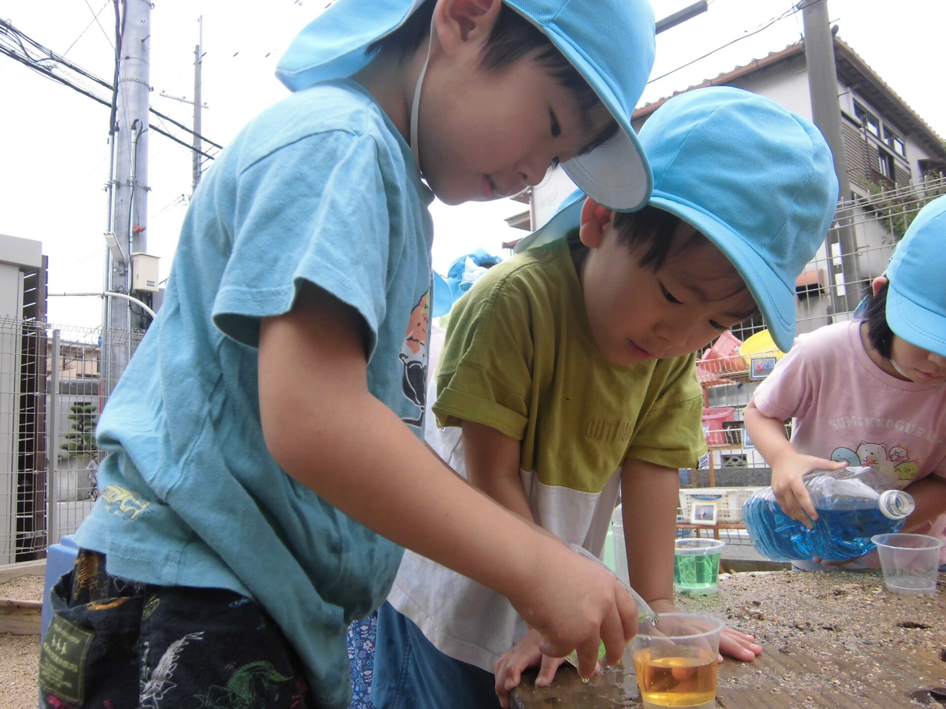 ボトルの中に入っている三原色の色水を、好きなカップに入れて混ぜて遊んでいます。