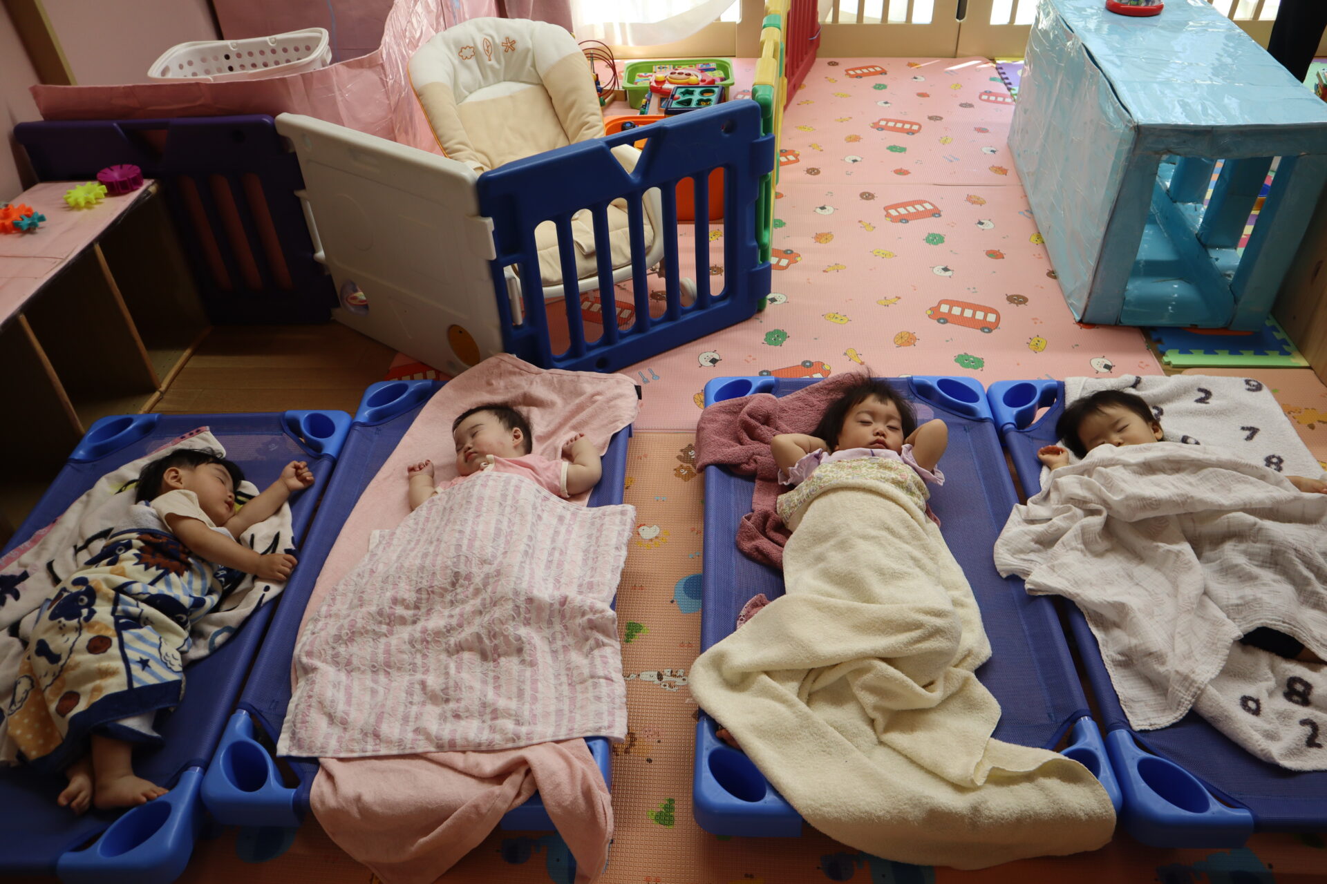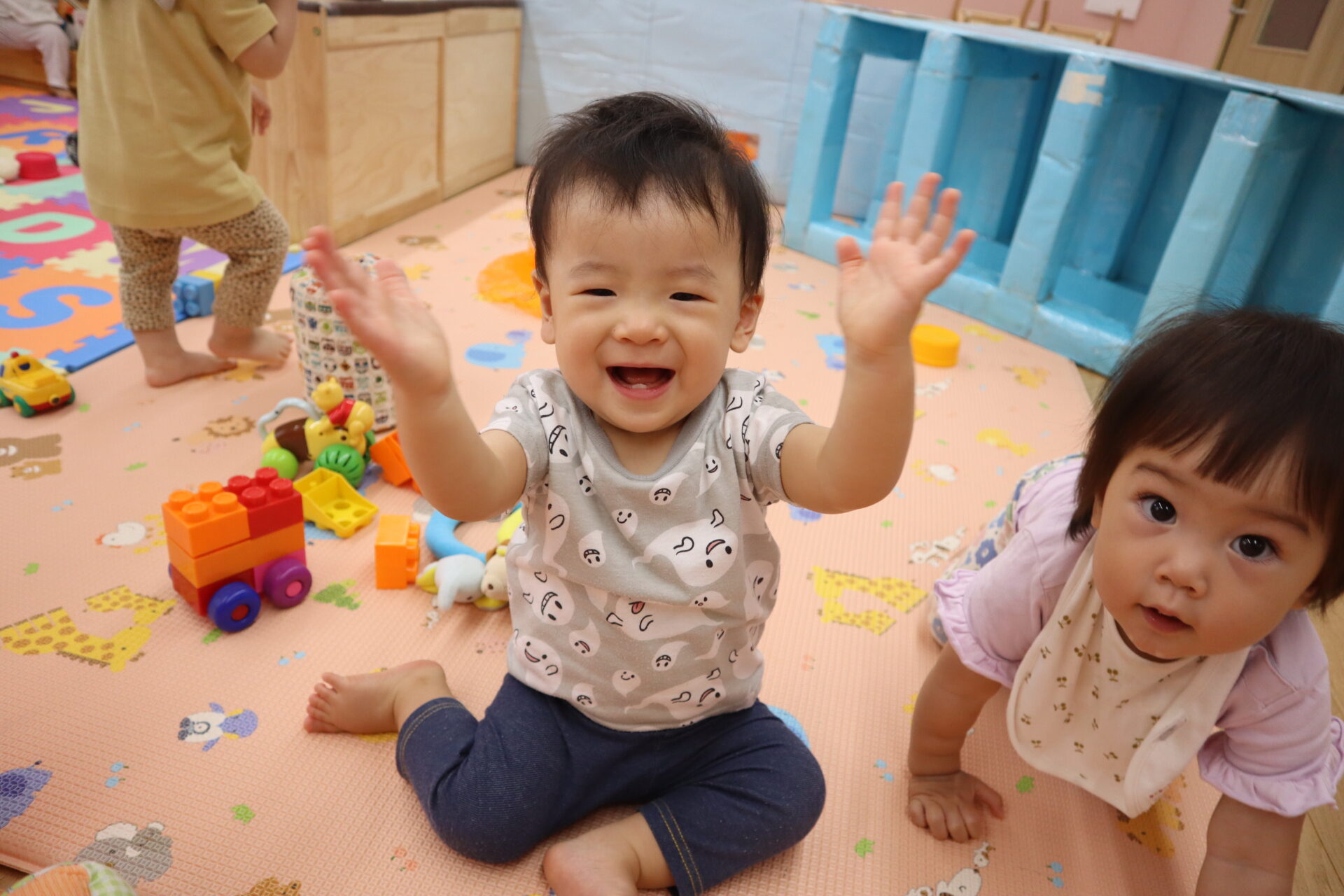 お昼寝から起きておやつを食べたら、またたくさん遊んで楽しく過ごしています。