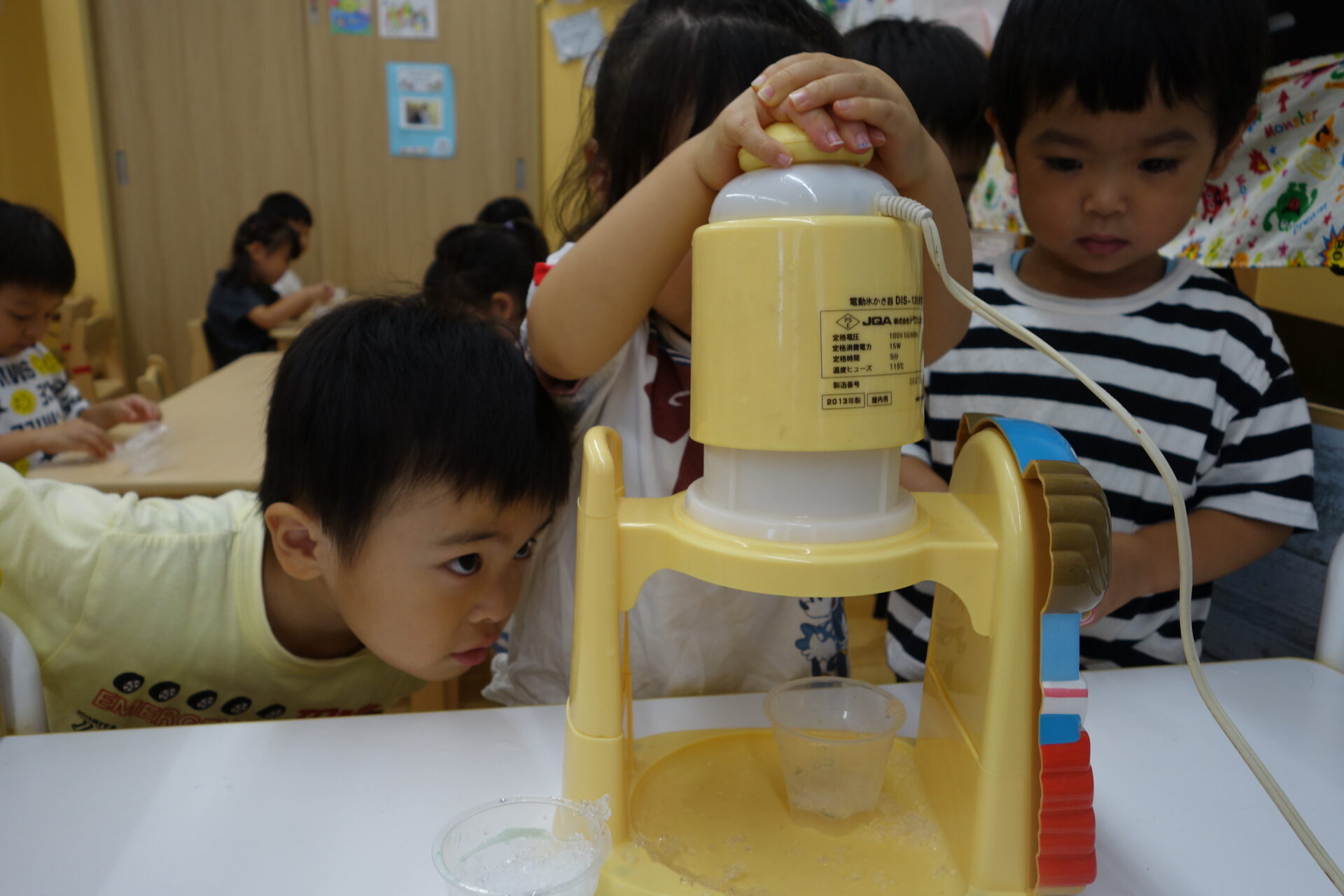 製作する前にまず、みんなでかき氷機を使ってかき氷を作ってみました。