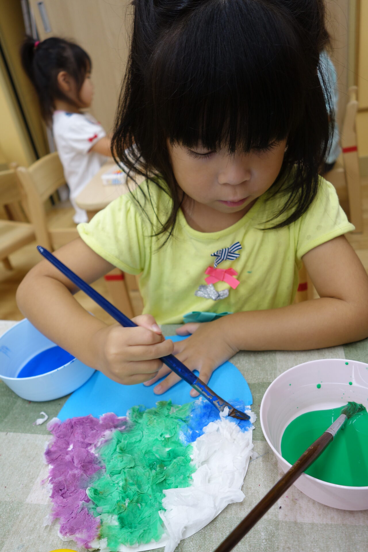 次にのりを付けた部分に小さくちぎったティッシュを貼ってい見ます。