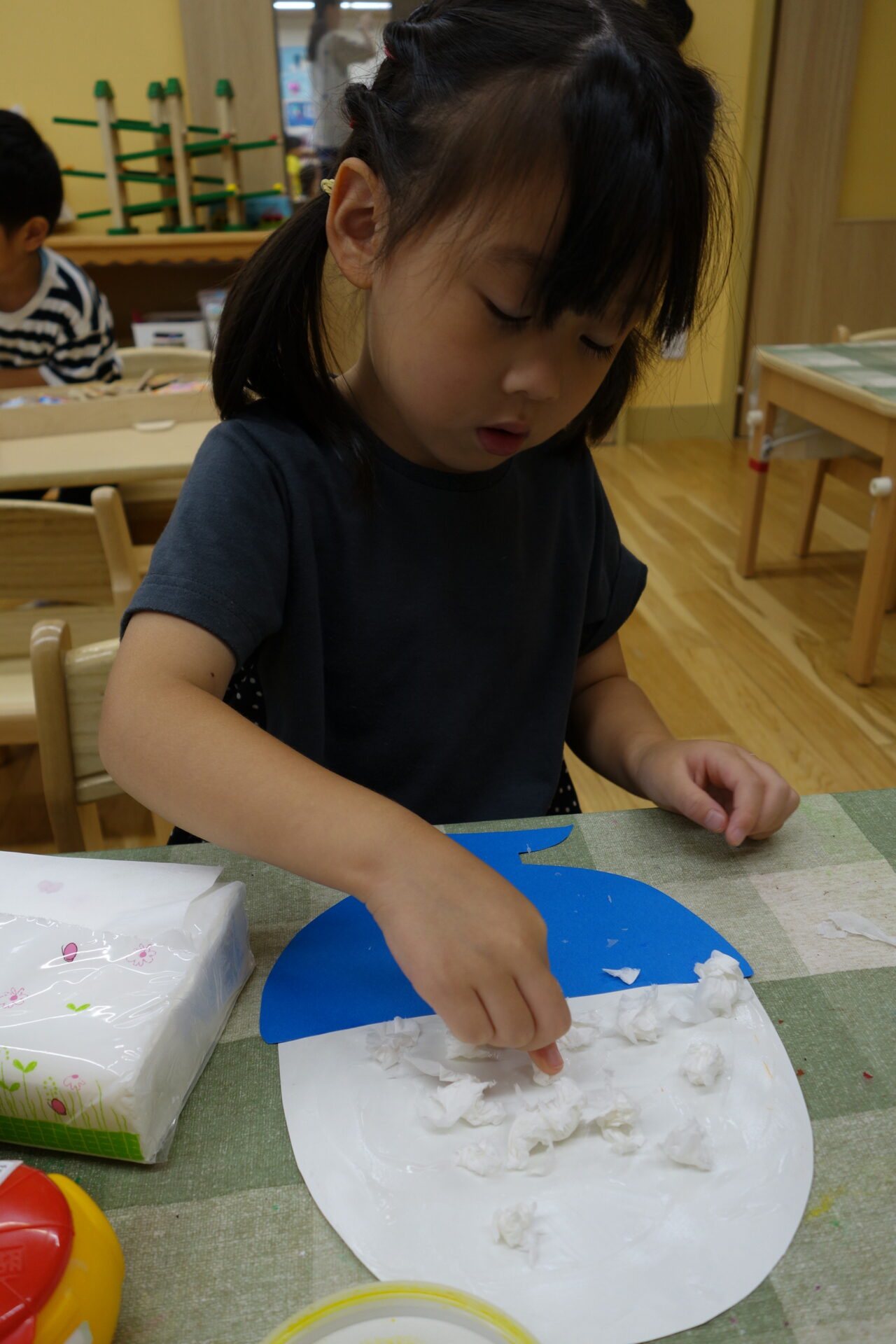 指先を使って上手に小さく丸めて貼っていました。