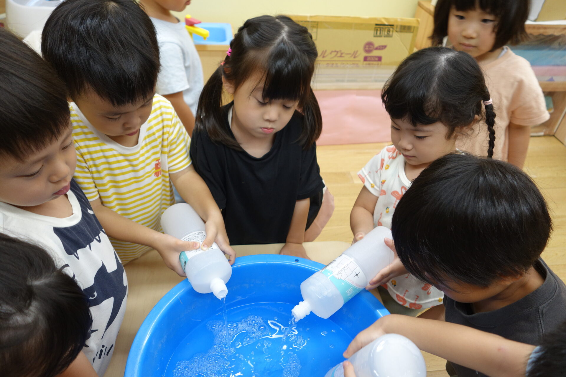 水を入れる係と洗濯のりを入れる係に分かれて作っていきます。
