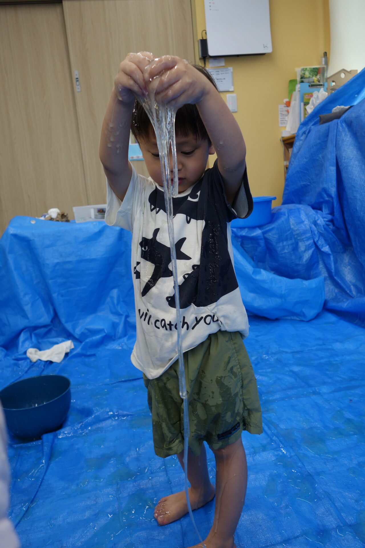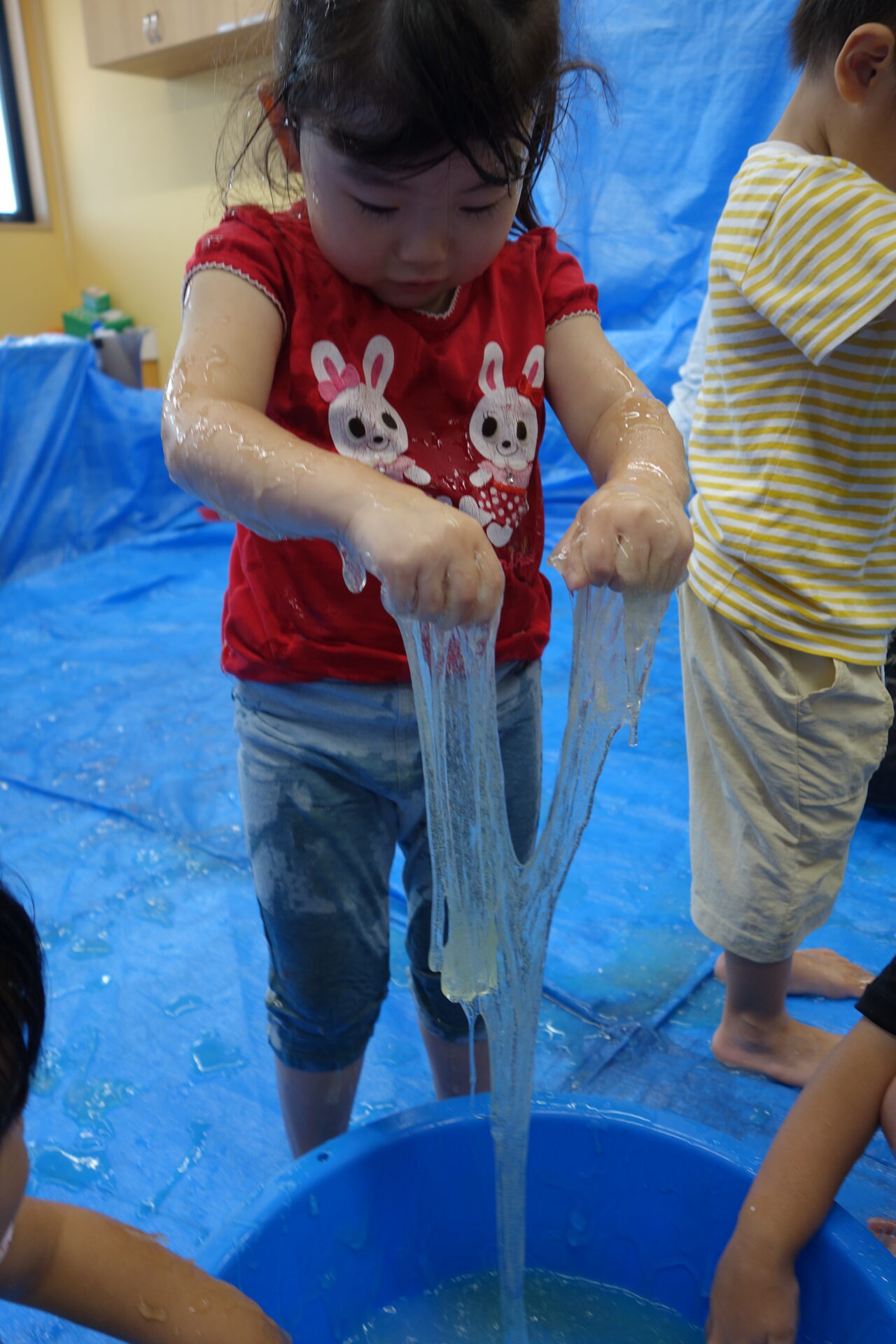 子ども達の目がキラキラ!真似っこしてどんどんスライムが伸びていきます。