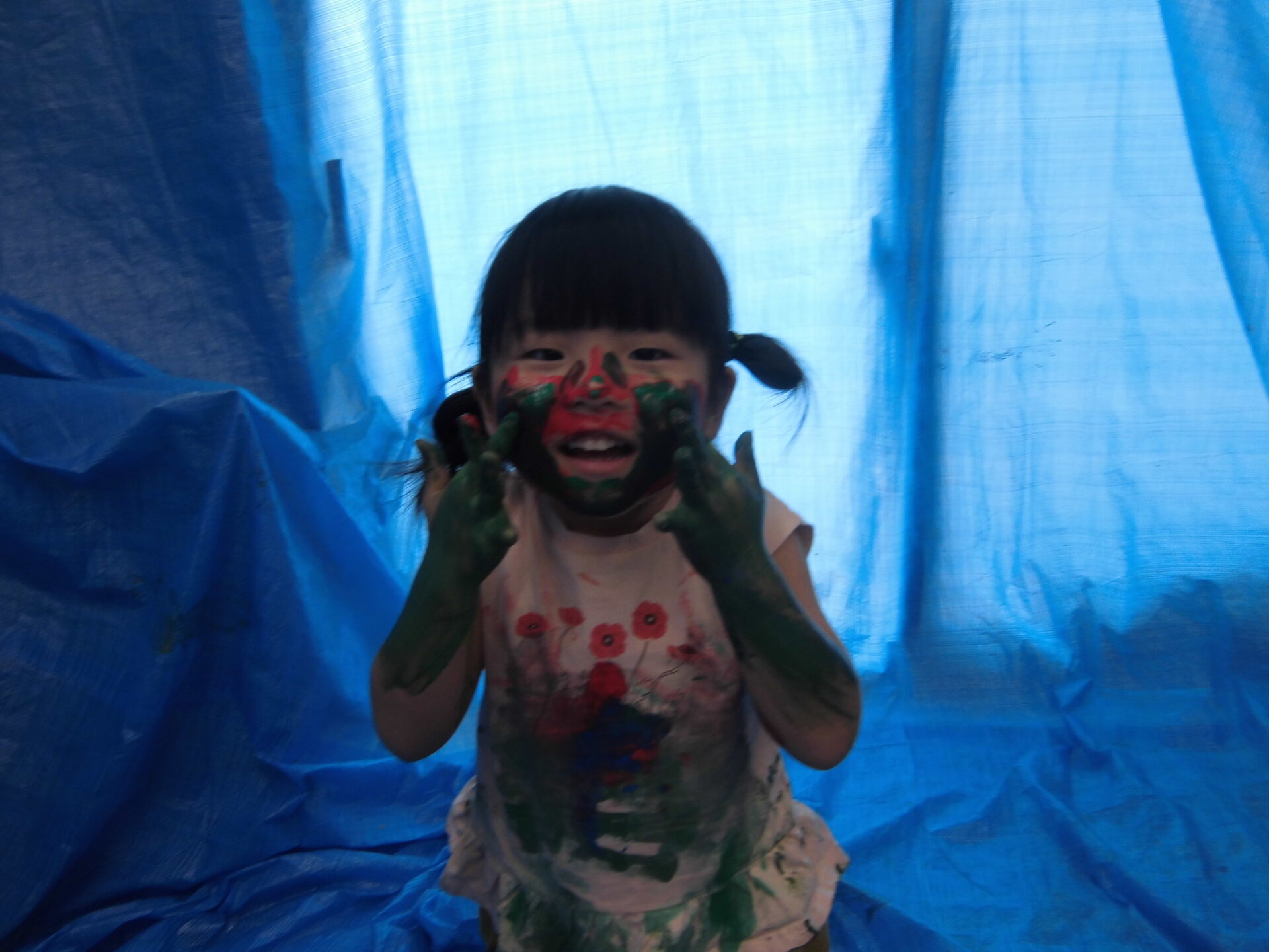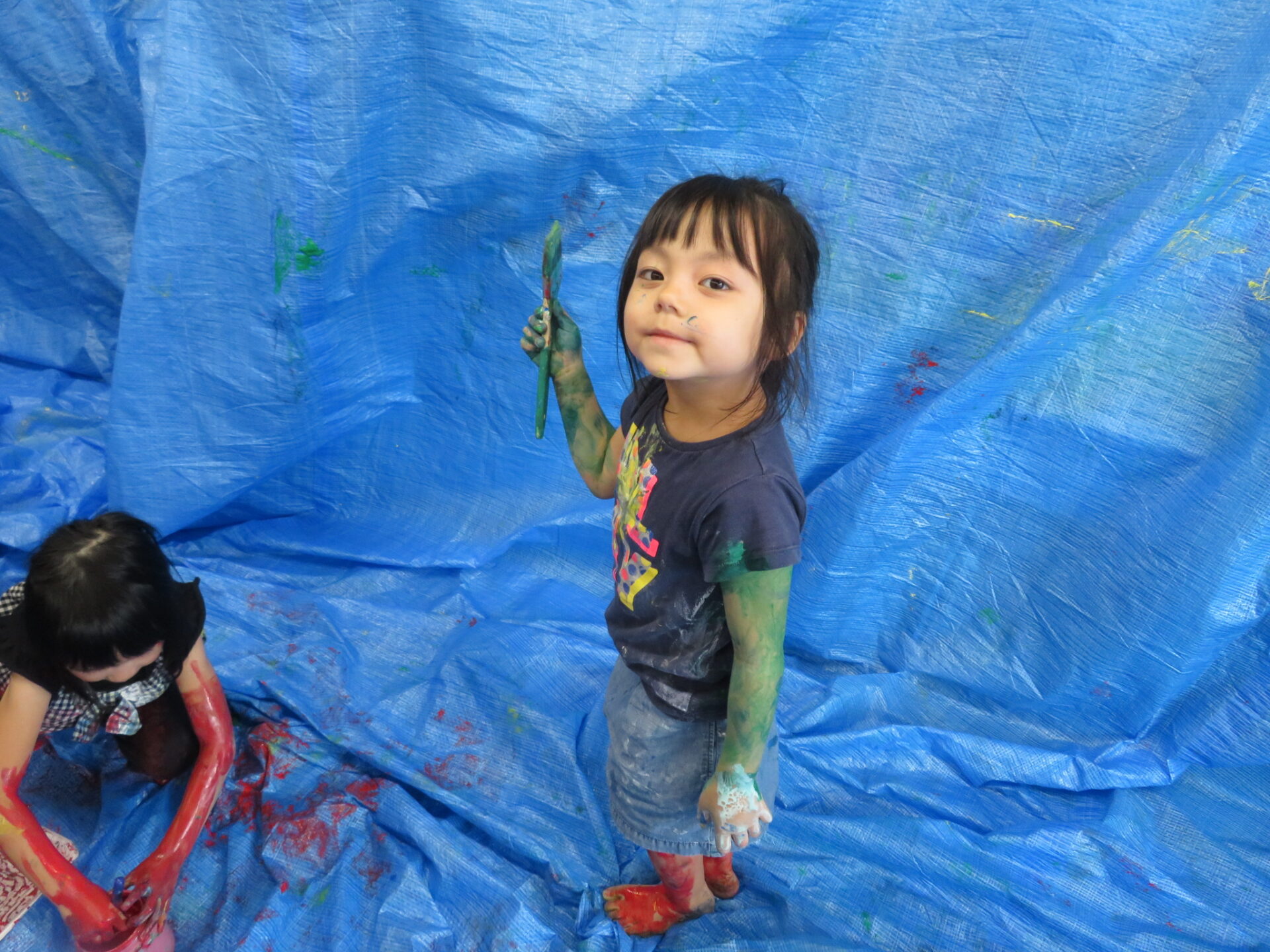 「ここにも描いていいの?」と、ブルーシートをキャンバスに見立てて刷毛を持ってお絵描きしていました。
