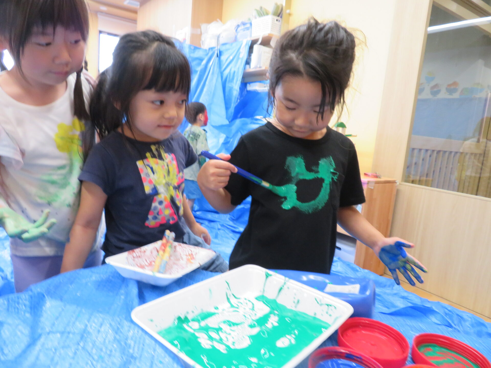 「色々な色を混ぜてみよう!」と次々腕に色を重ねていき、新しい色の発見を楽しんでいました!