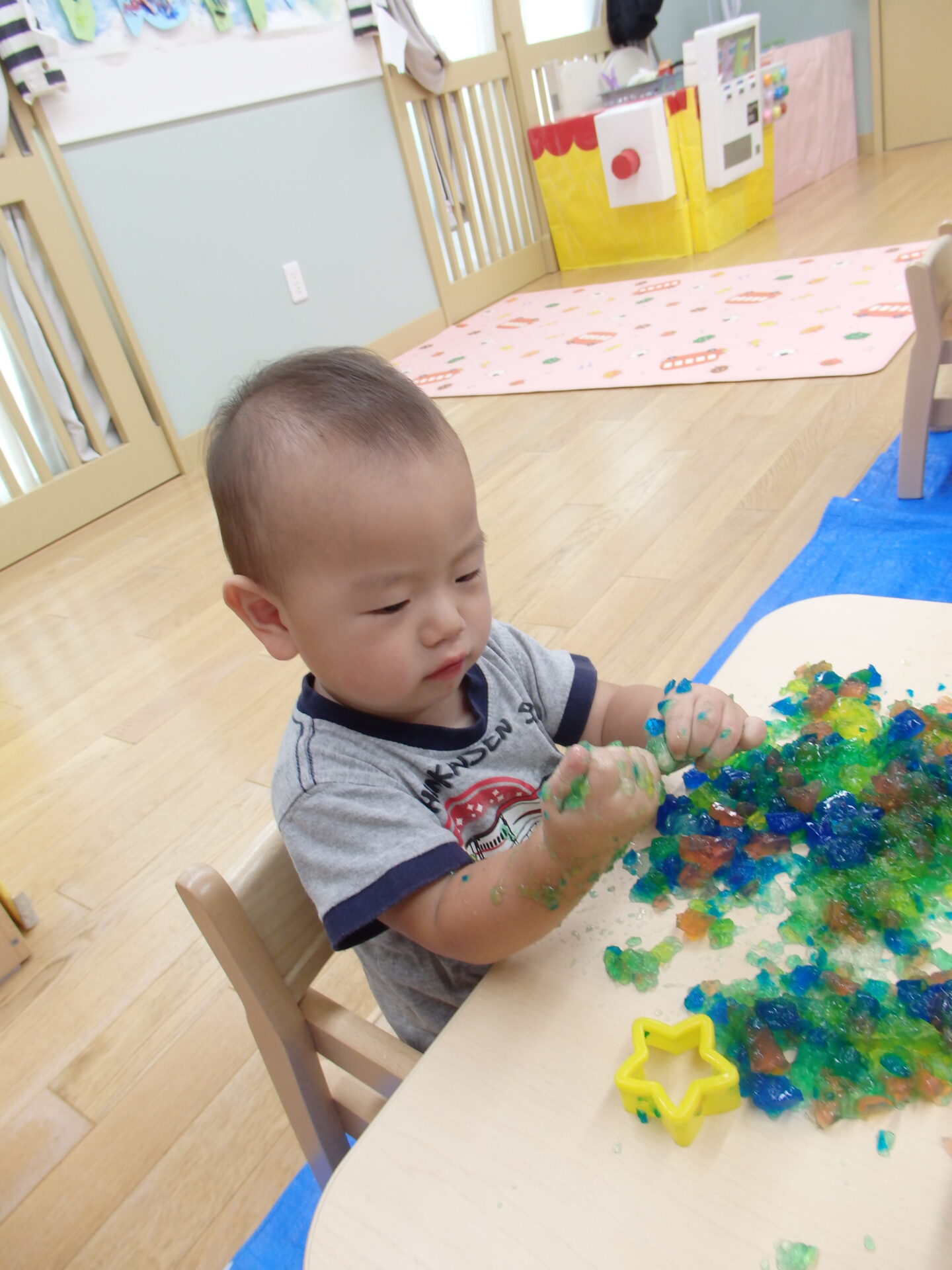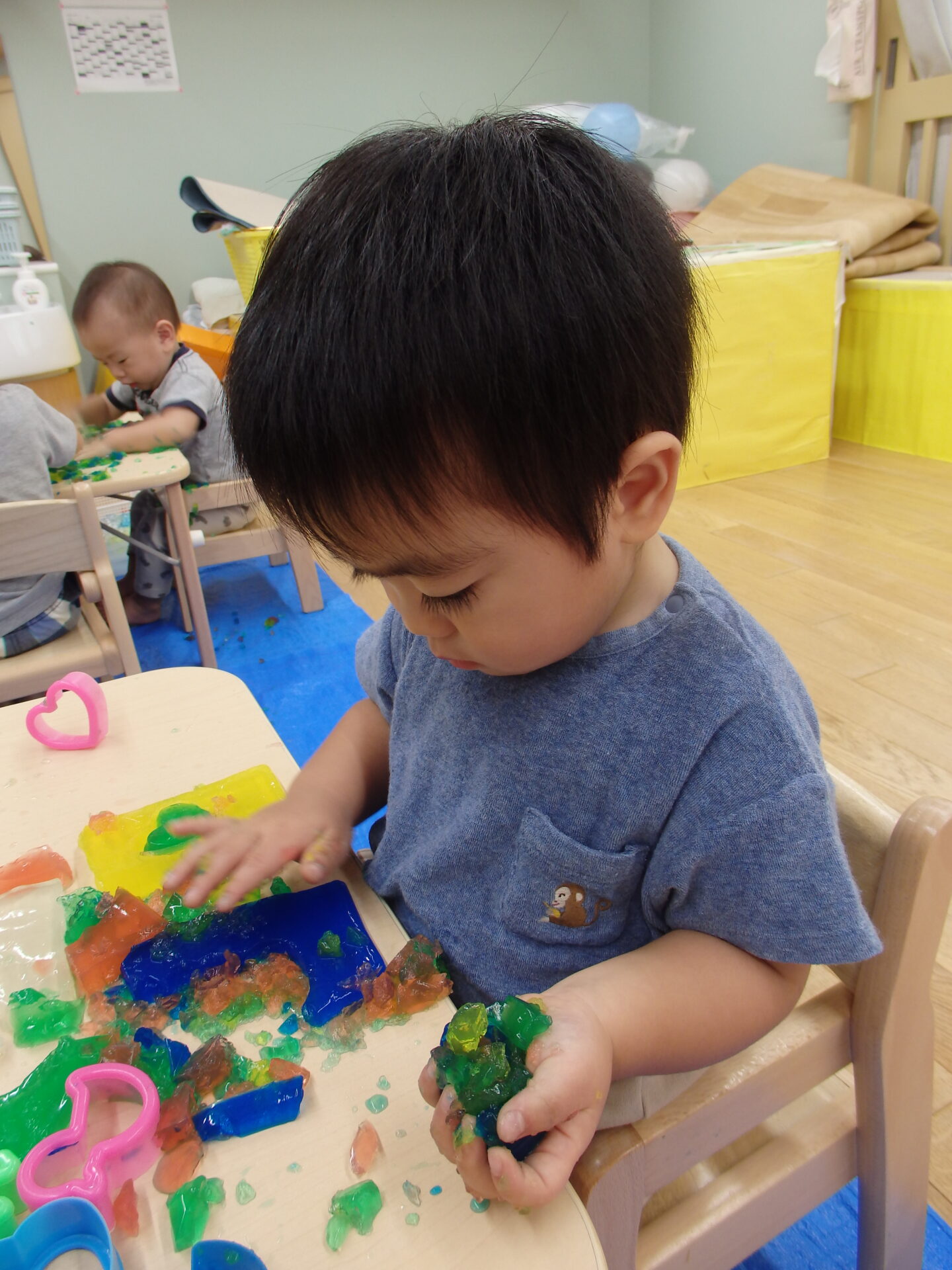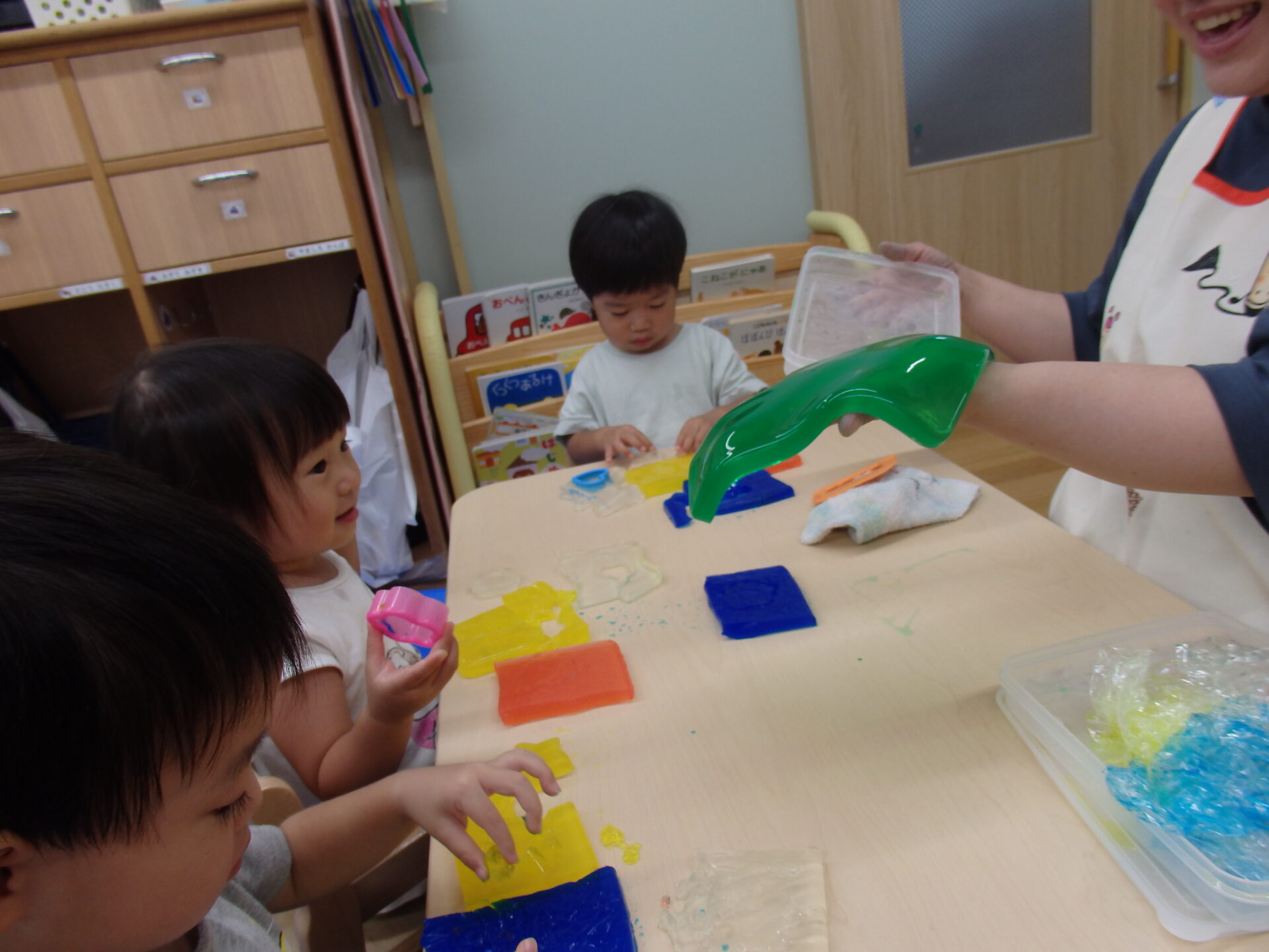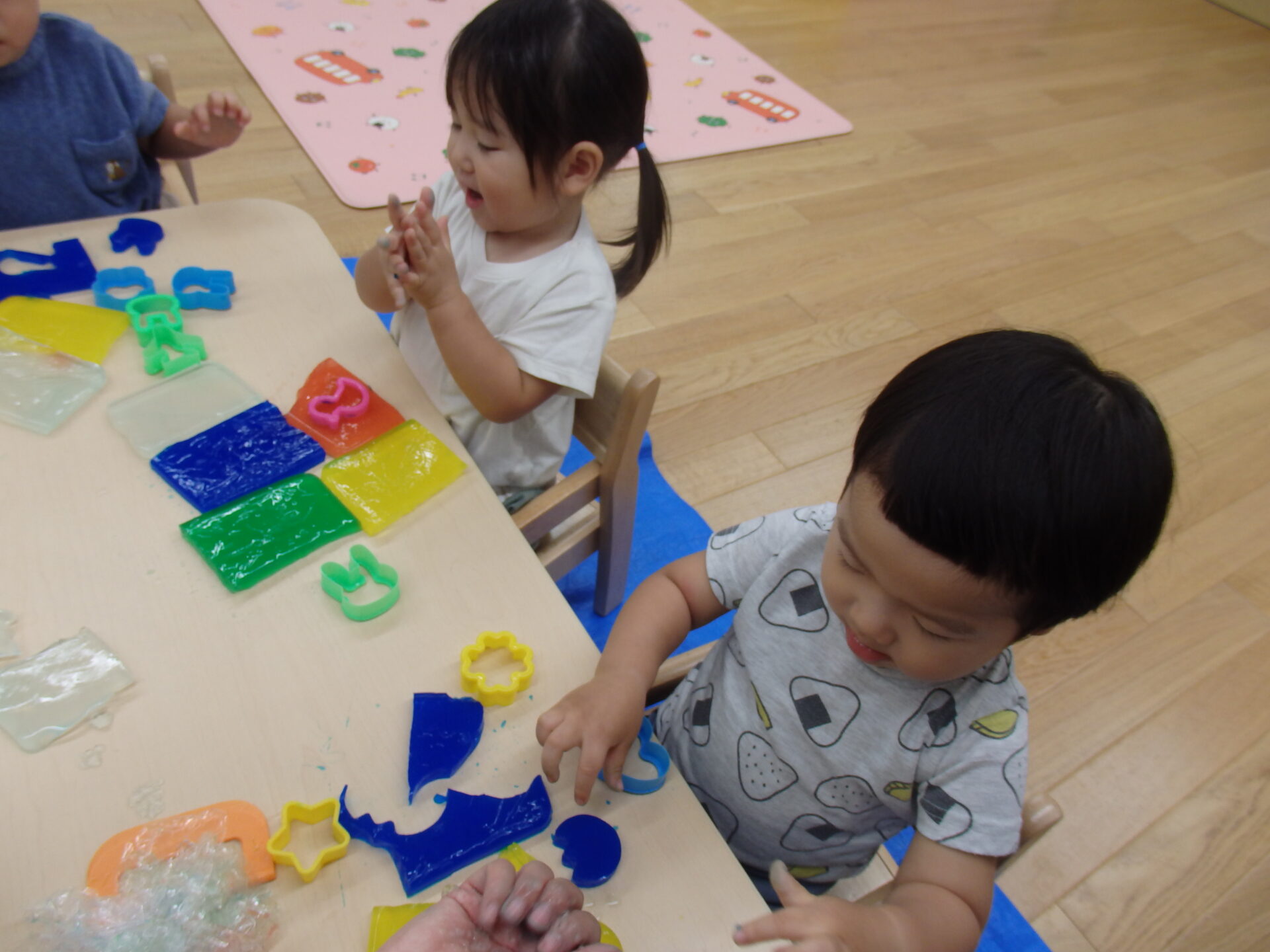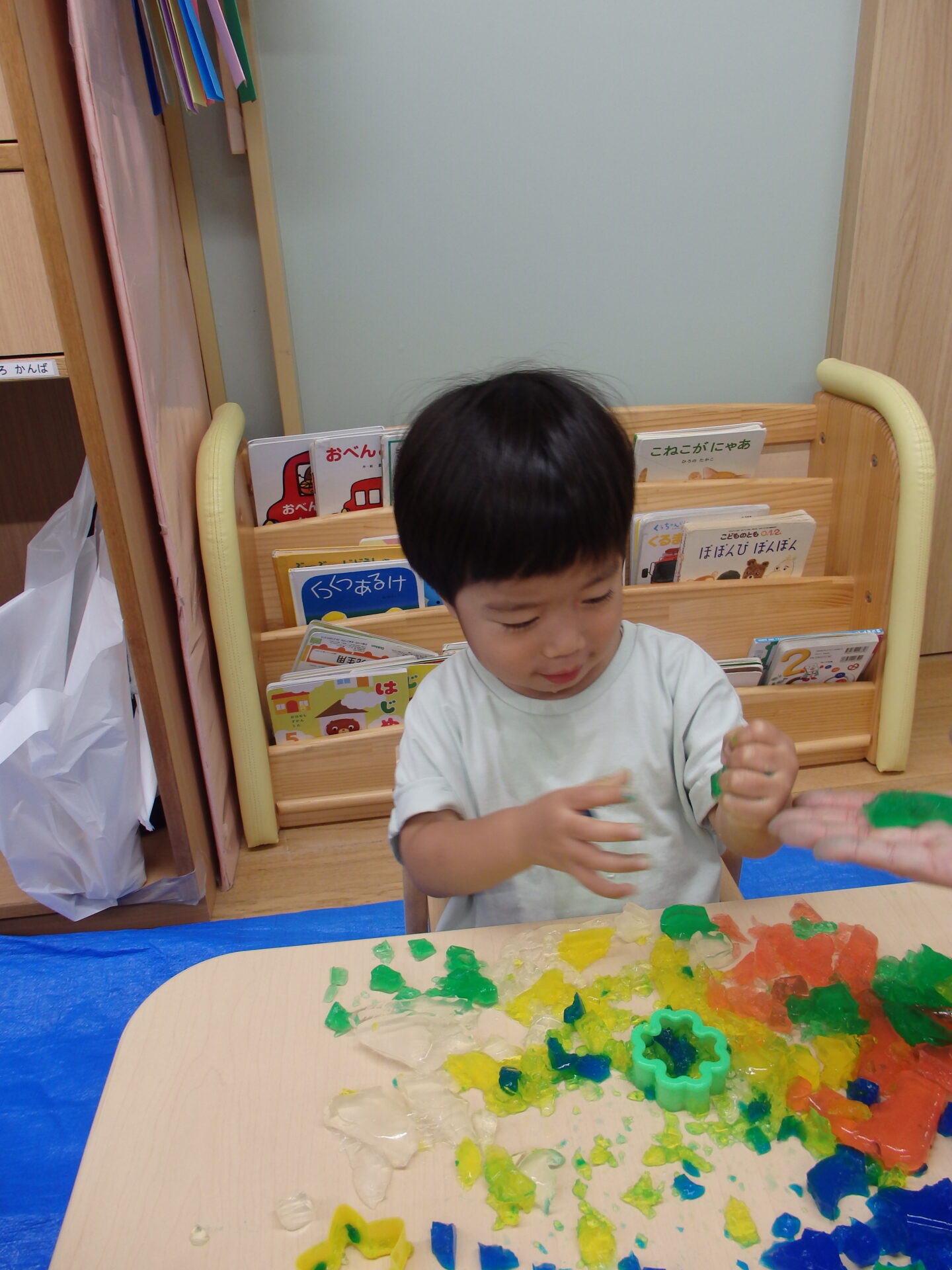 その後もひたすら握ったり集めてすくったりと、レインボースライムの感触を味わっていた子ども達です♬