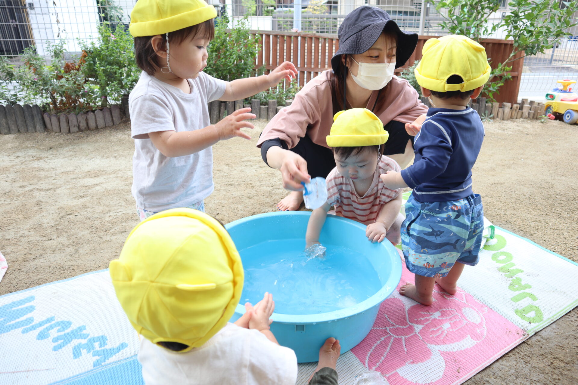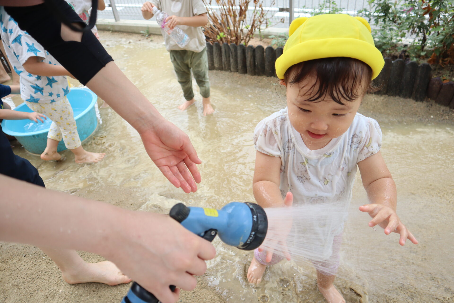 水遊びが始まった時には、顔が濡れると泣いていた子も、今ではピカピカの笑顔を見せてくれるように