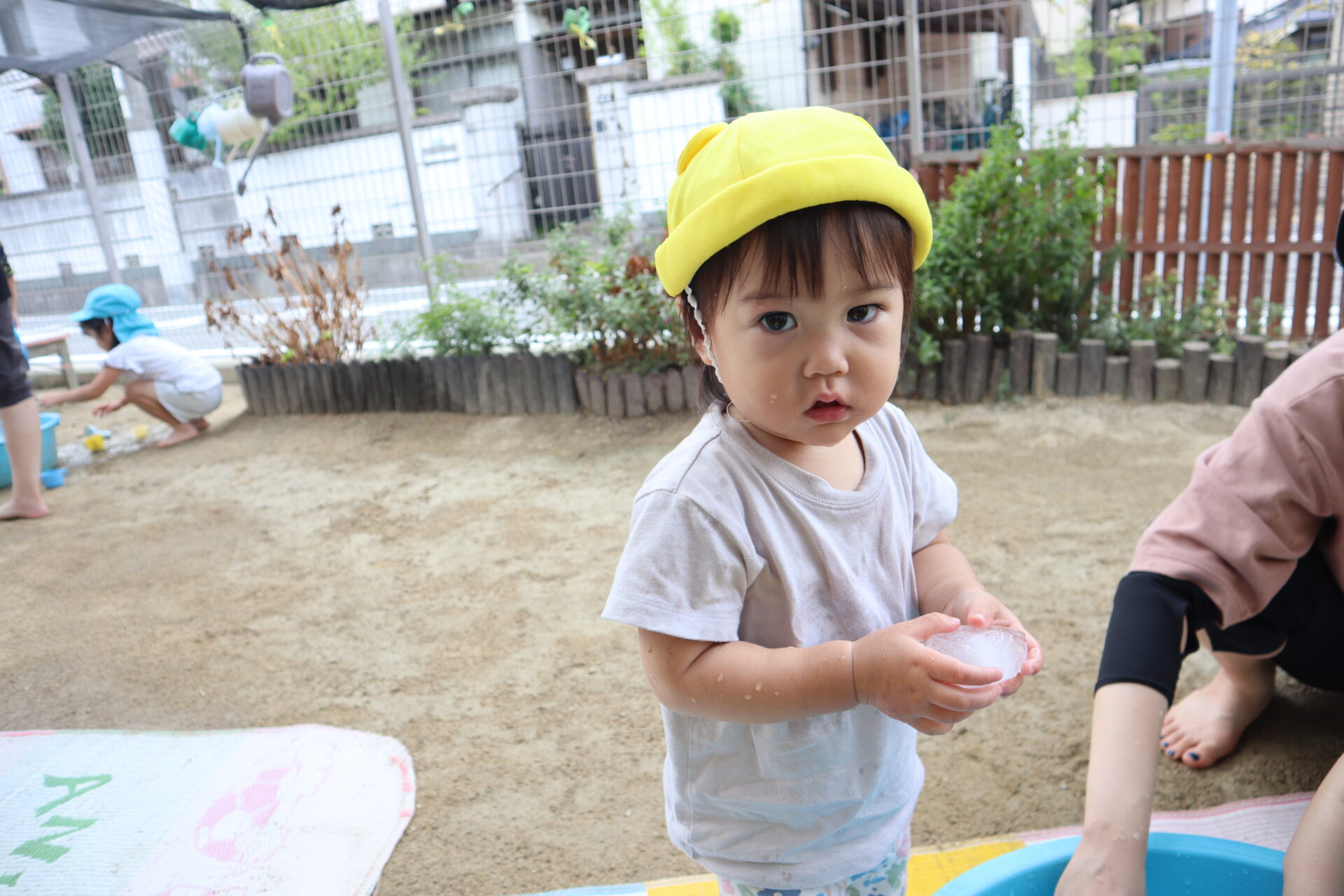 水を触った時の気持ちよさや、氷や泡など様々な感触を楽しんでいます。