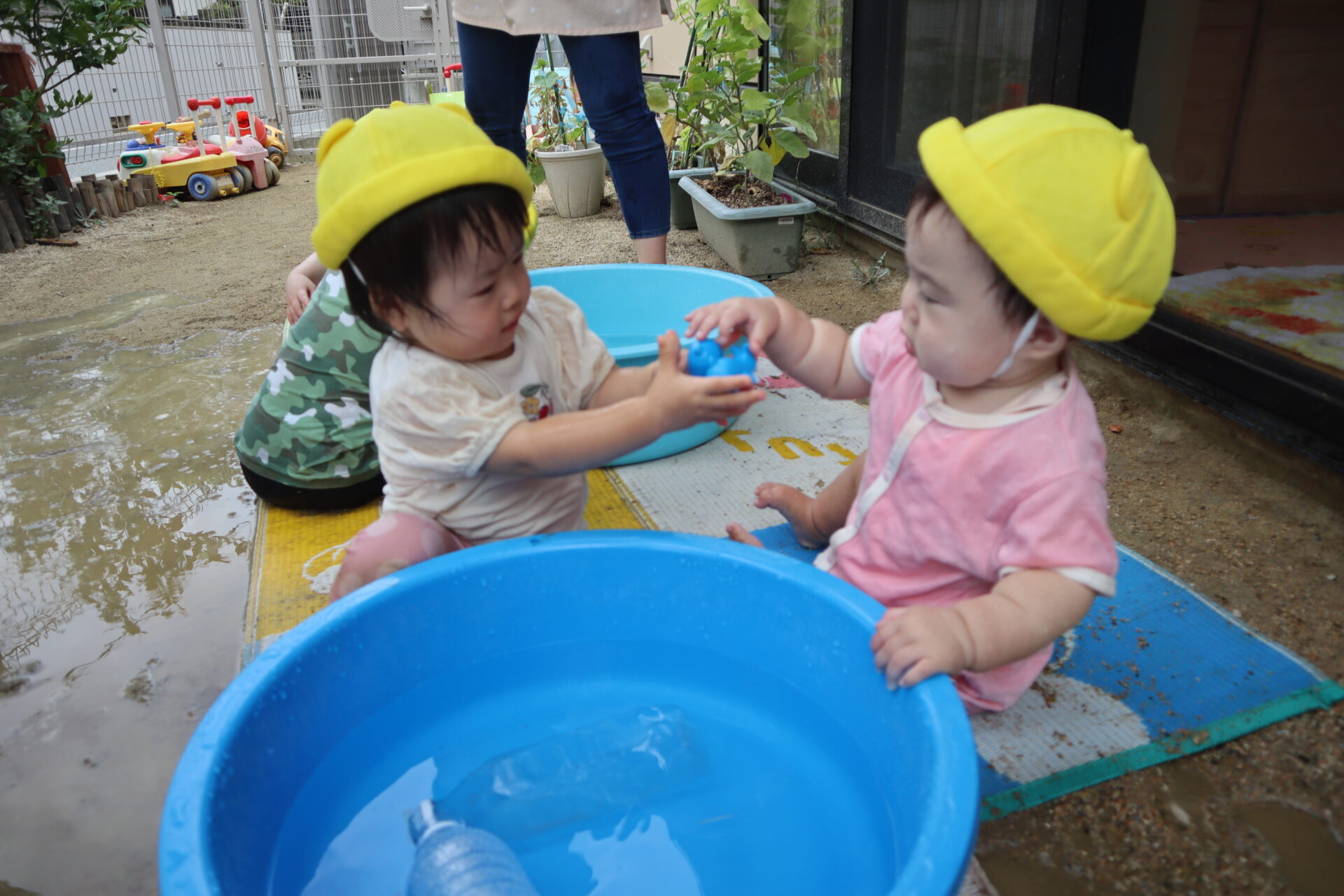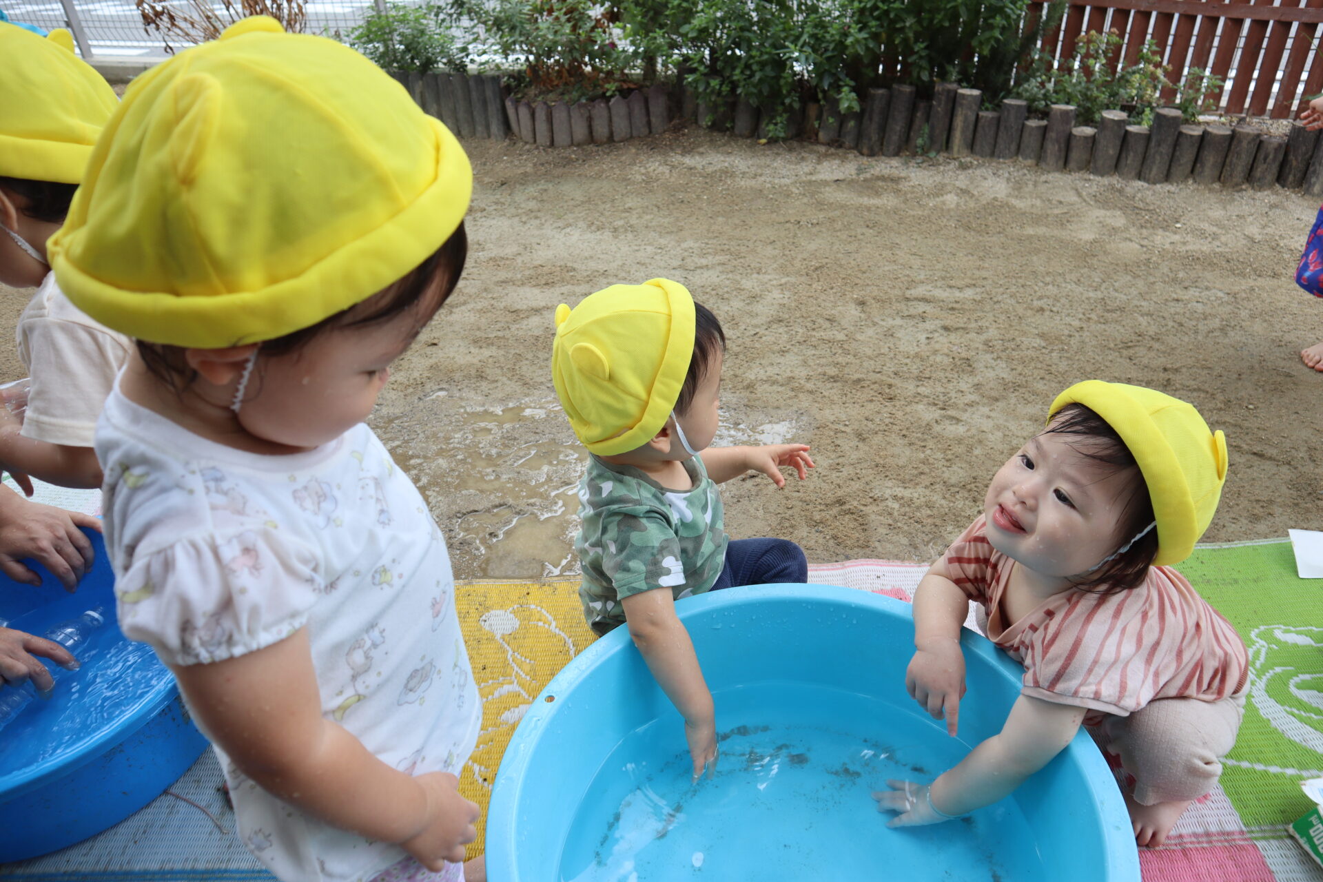 初めて水遊びを経験したうみ組の子ども達。園庭遊びとはまた違う刺激を沢山得たと思います。