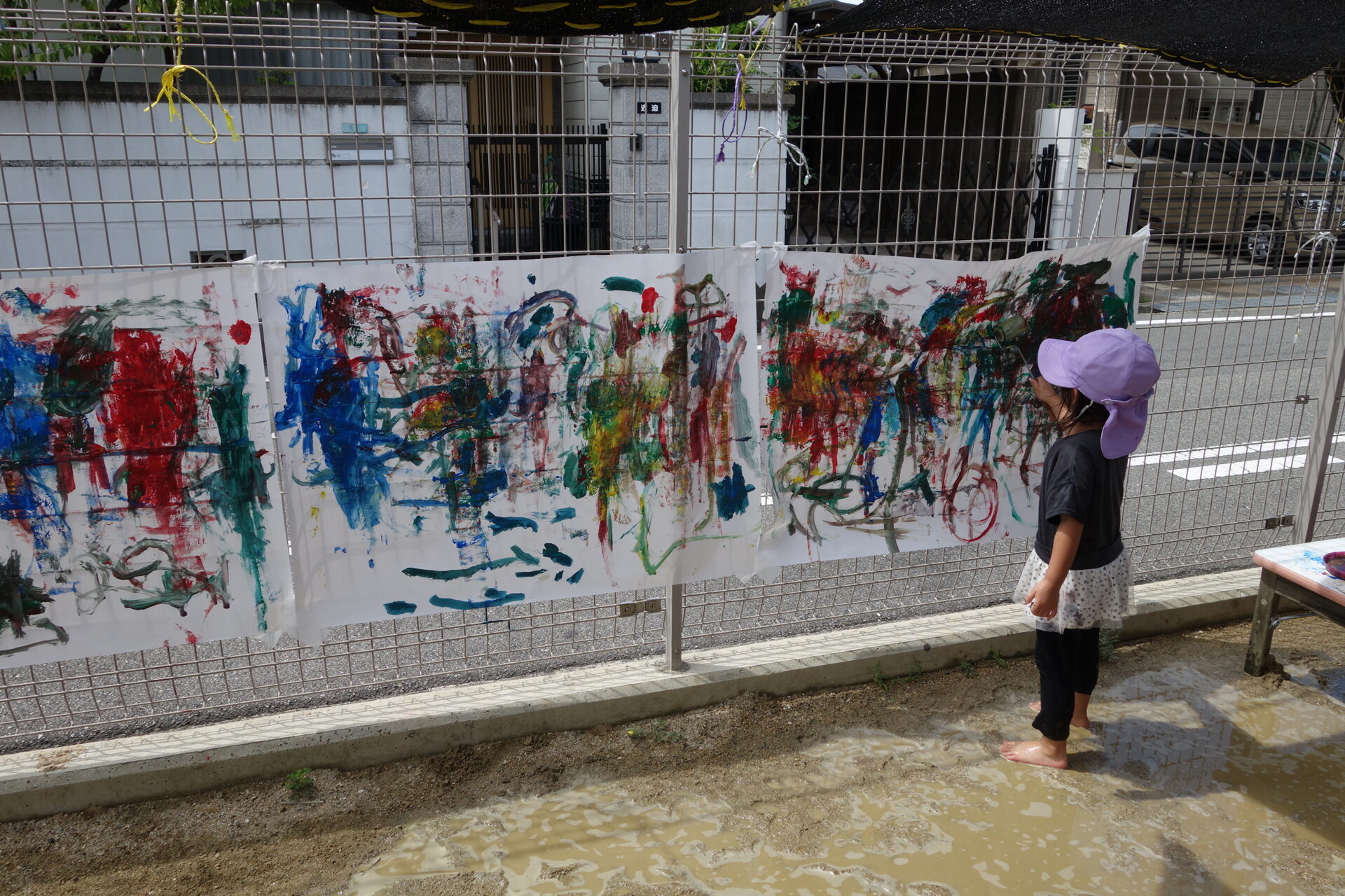 園庭のフェンスに大きい紙を貼っていると、