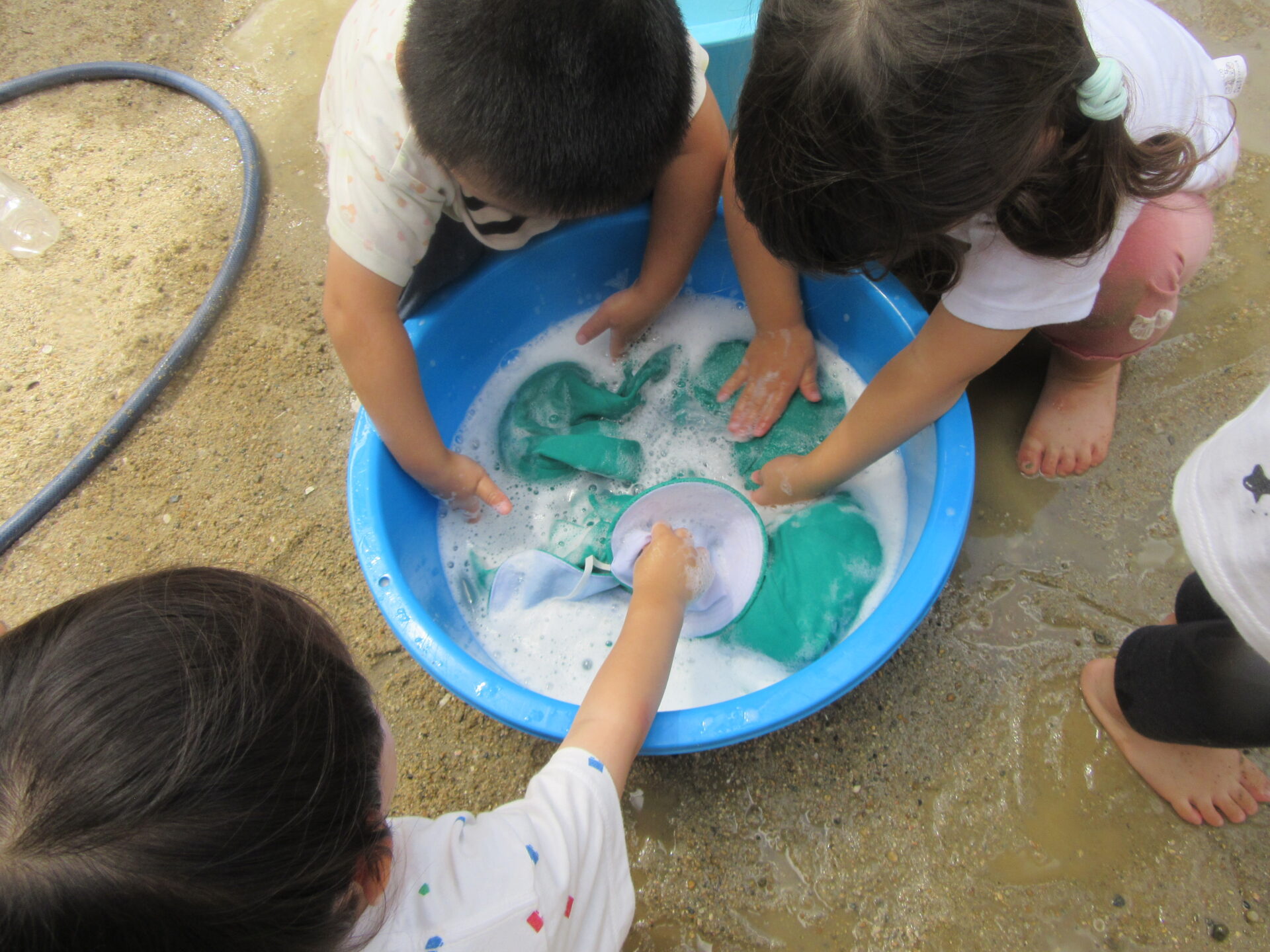 「今日はアワアワして遊ぶよ!」と声を掛けると「やった~!」と大喜びでした。泡でコップやタオル、カラー帽子などを洗ったり、泡をブクブク吹いて遊びました!