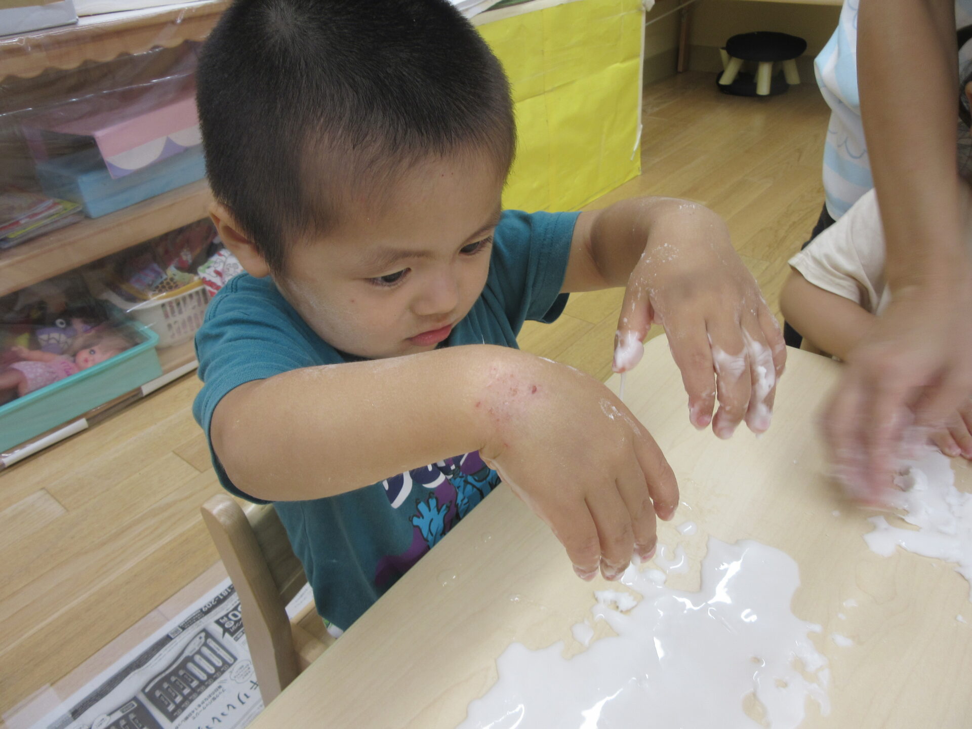 スライム遊びではたくさんのスライムを作り、全身ヌルヌルになりながら遊びました。終わった後に「ぬるぬるで気持ちよかったな~」と友だちと話すほど楽しかったようです!