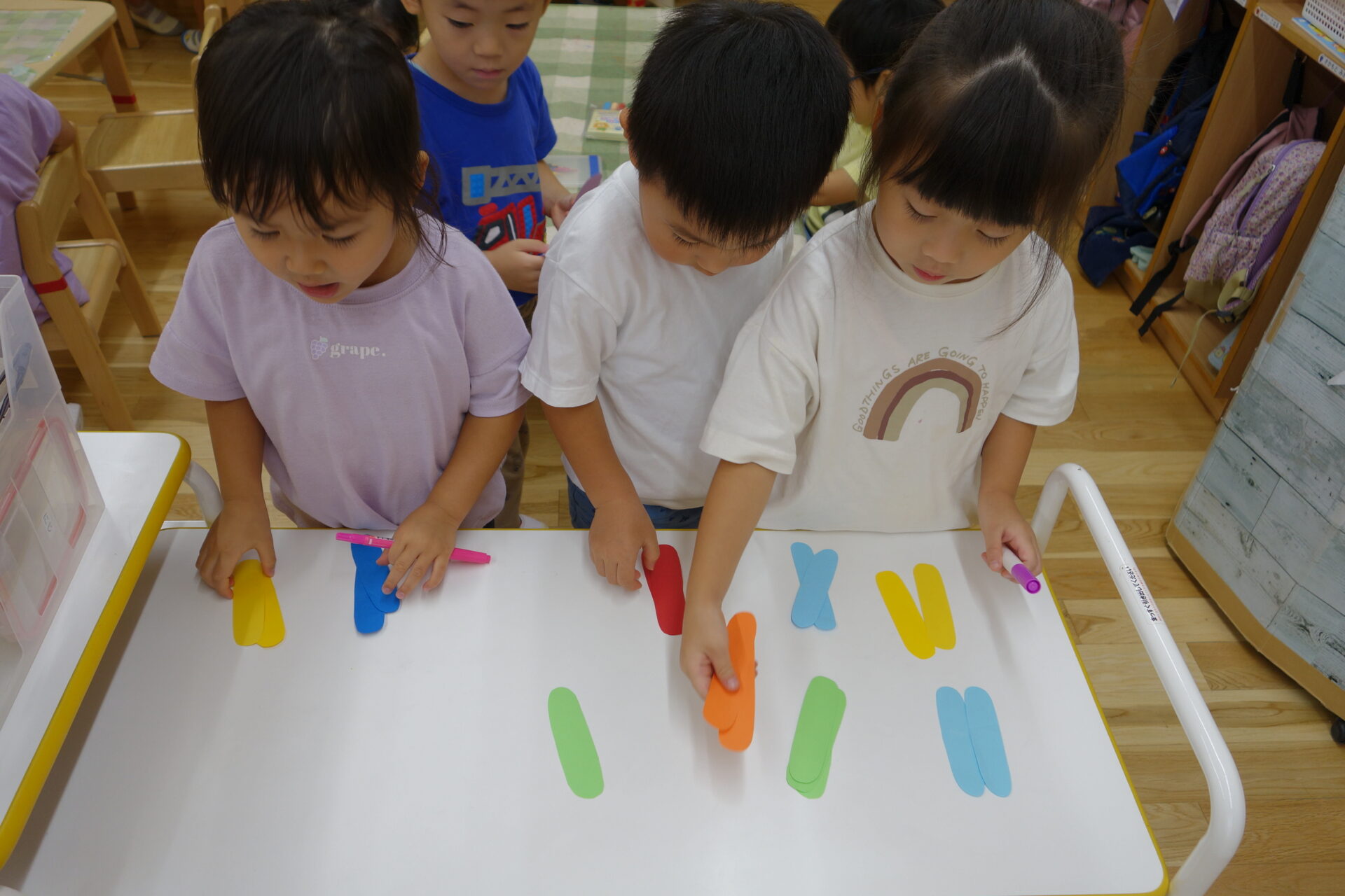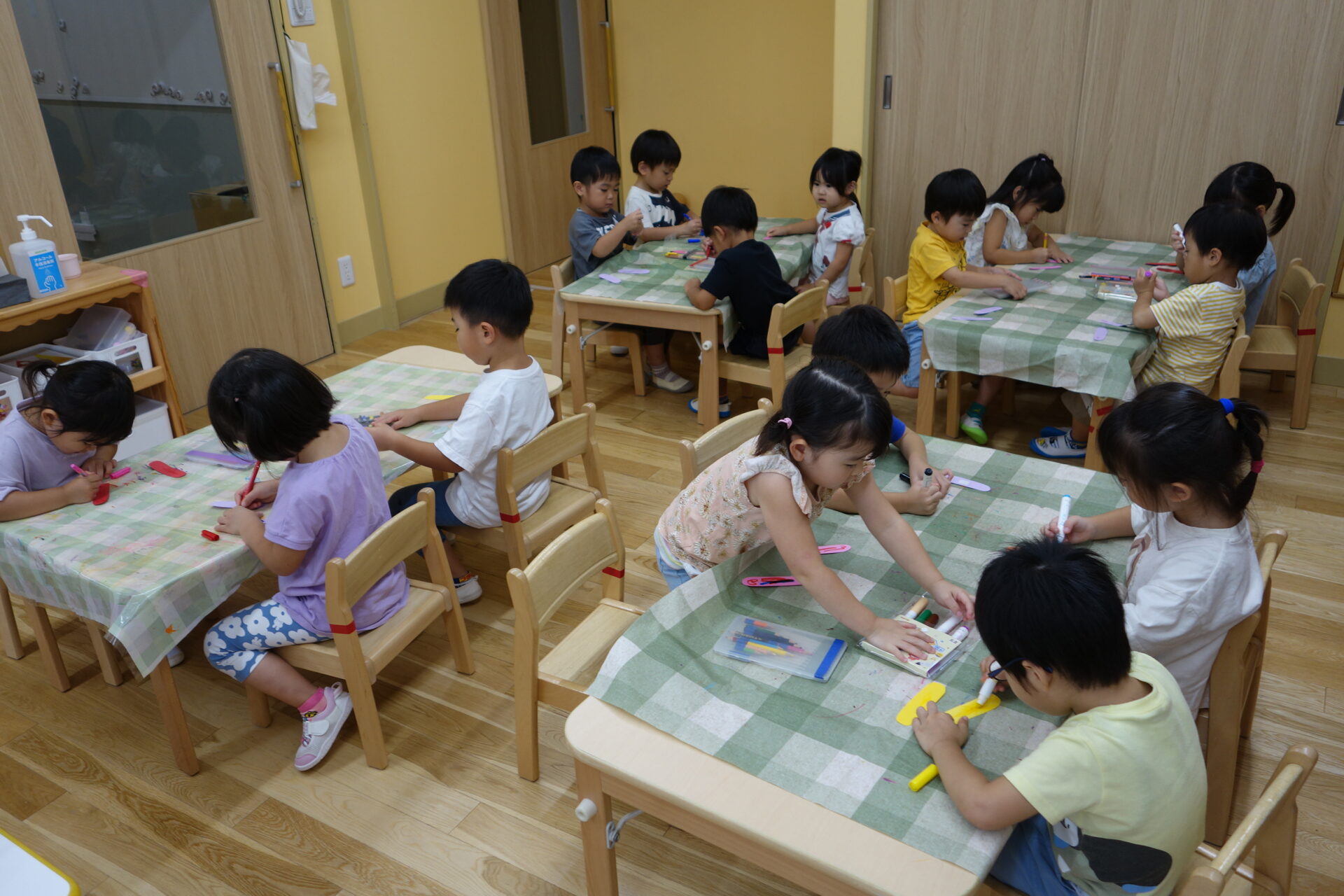 マーカーと色鉛筆は机ごとに1~2個用意しました。