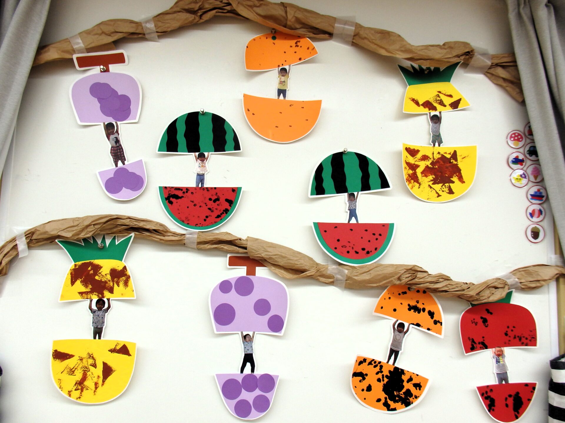 今月のだいち組のお部屋では、おいしそうな果物とともに可愛いミニサイズの子ども達が彩りをつけてくれています🍍
