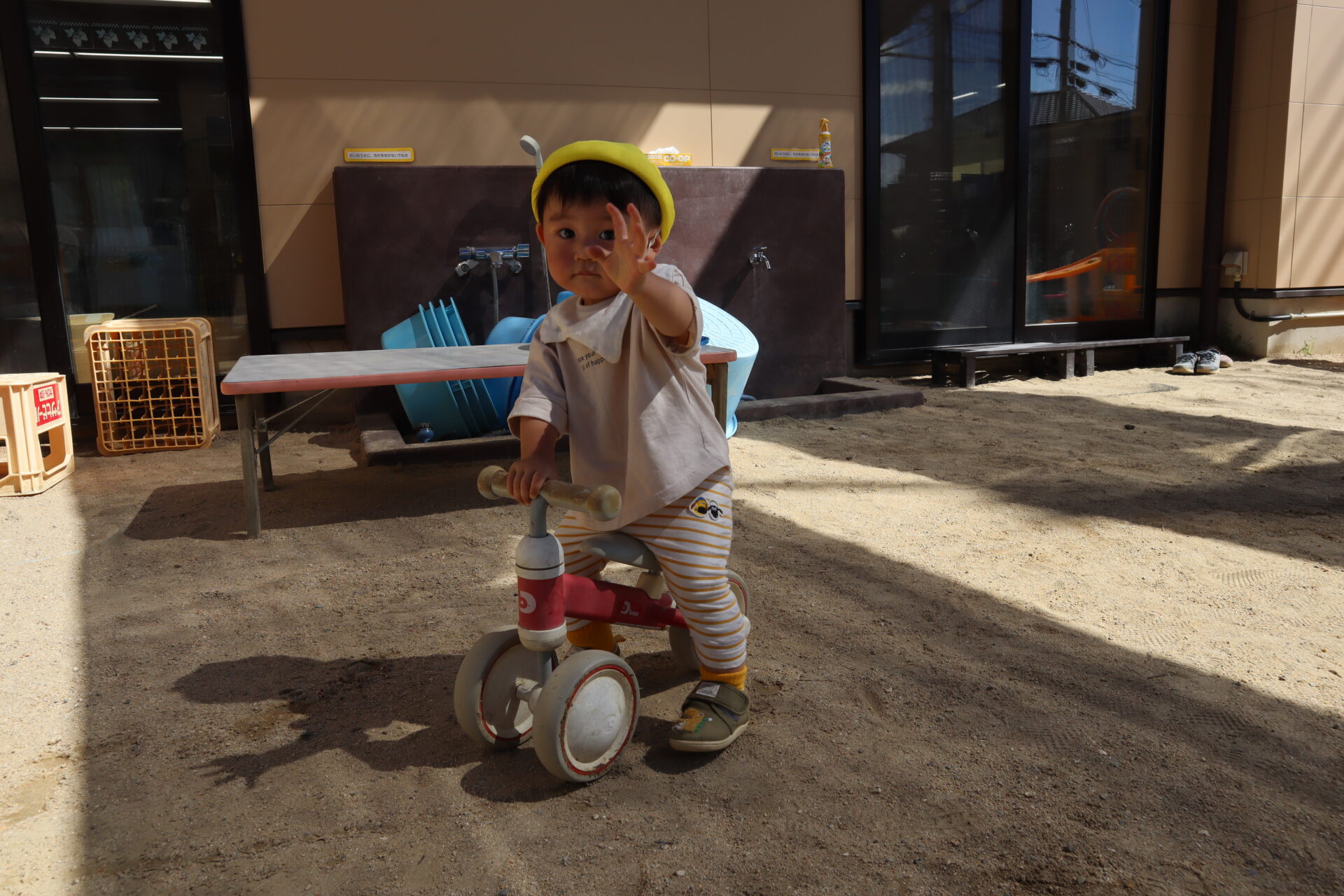 三輪車に乗り「行ってきます!」と保育者に手を振り、散歩に出掛けていました😊