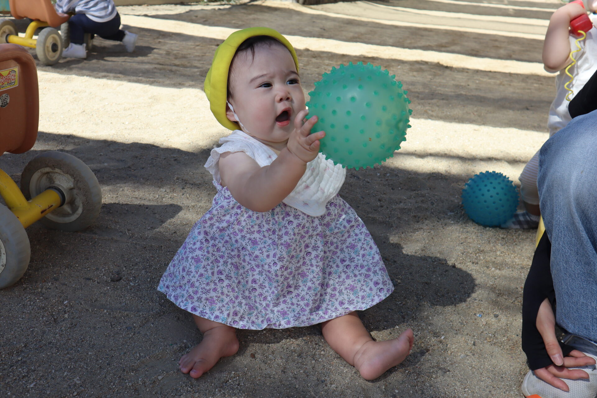 8月いっぱいで水遊びも終わり、久しぶりに0歳児クラスは園庭に出てゆったりと遊びました。