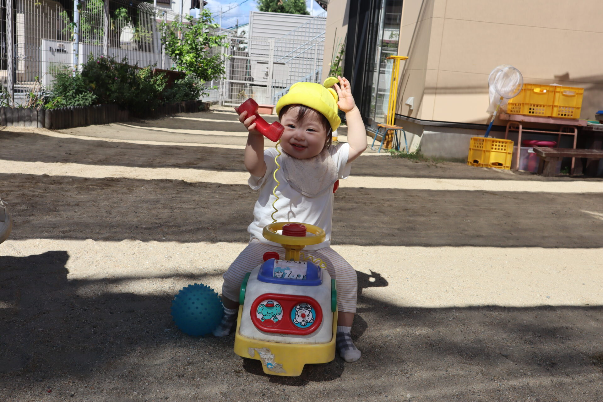 保育者が「もしもし」と言うと、笑顔で手を振ってくれました!