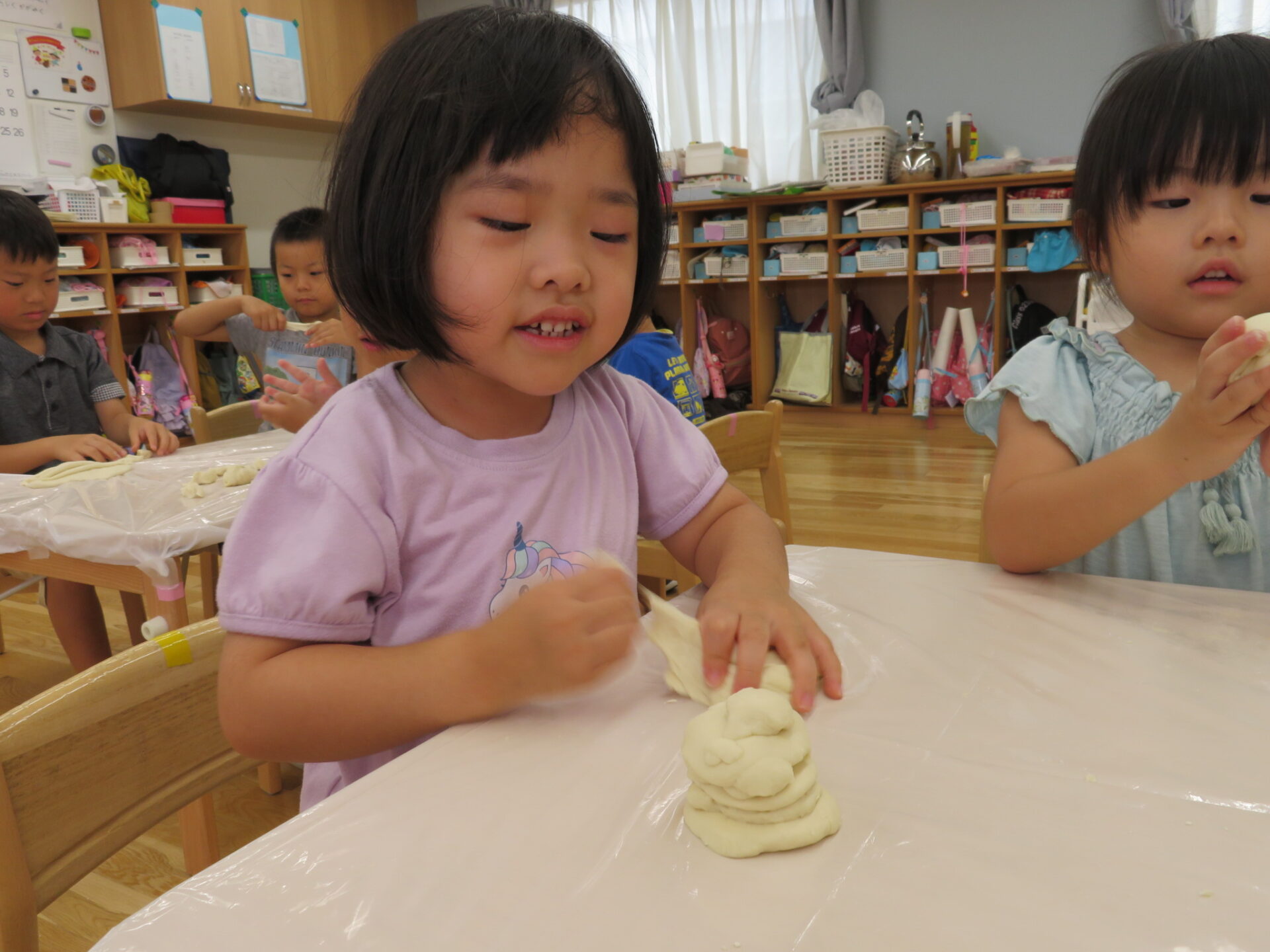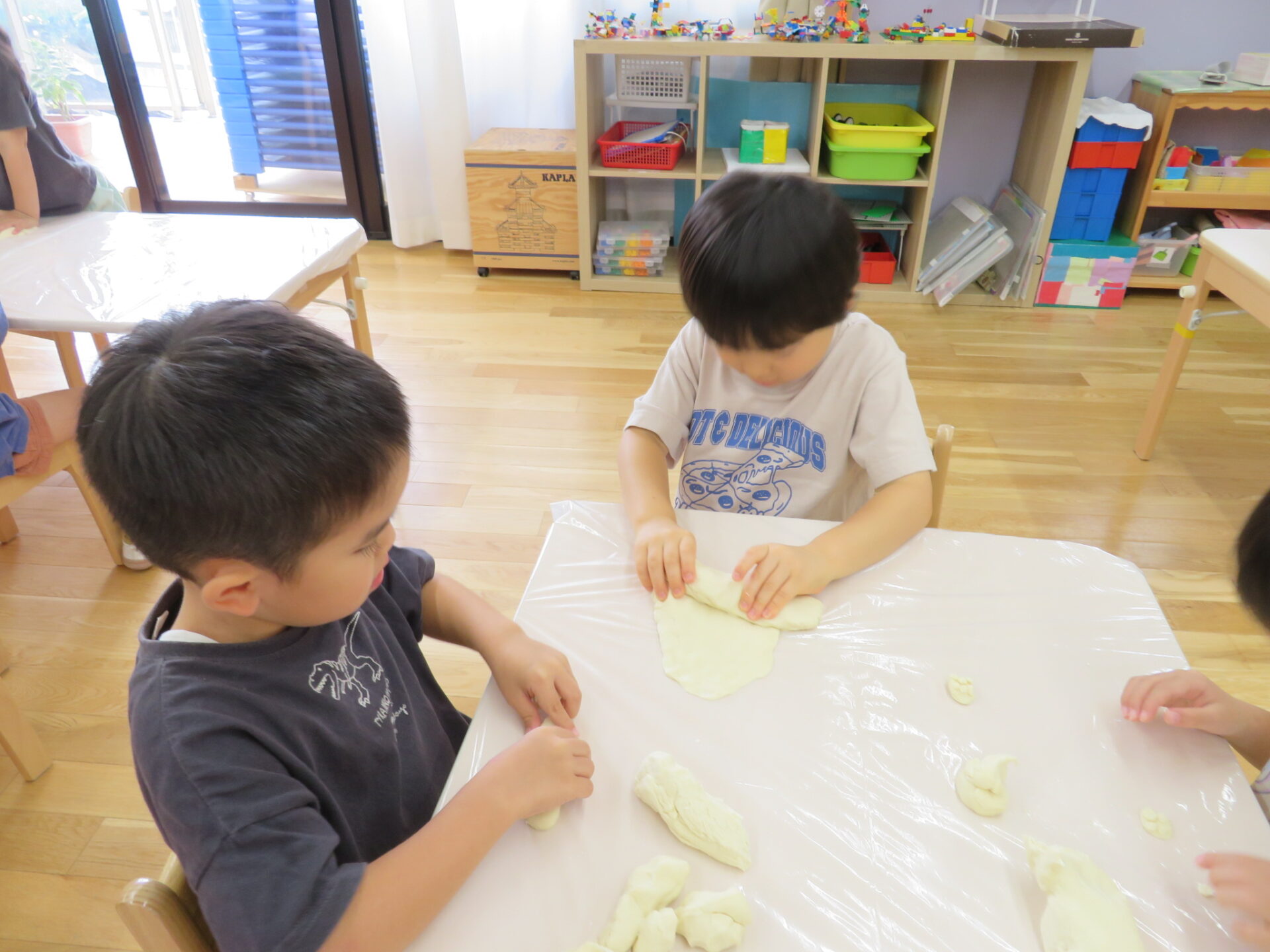 5歳児が平たくした小麦粉粘土をくるくると巻いていると、その横でその様子を見ていた4歳児も真似をしてみます。