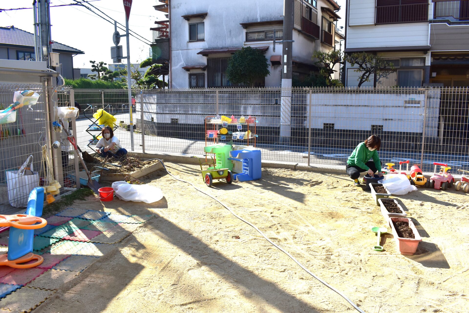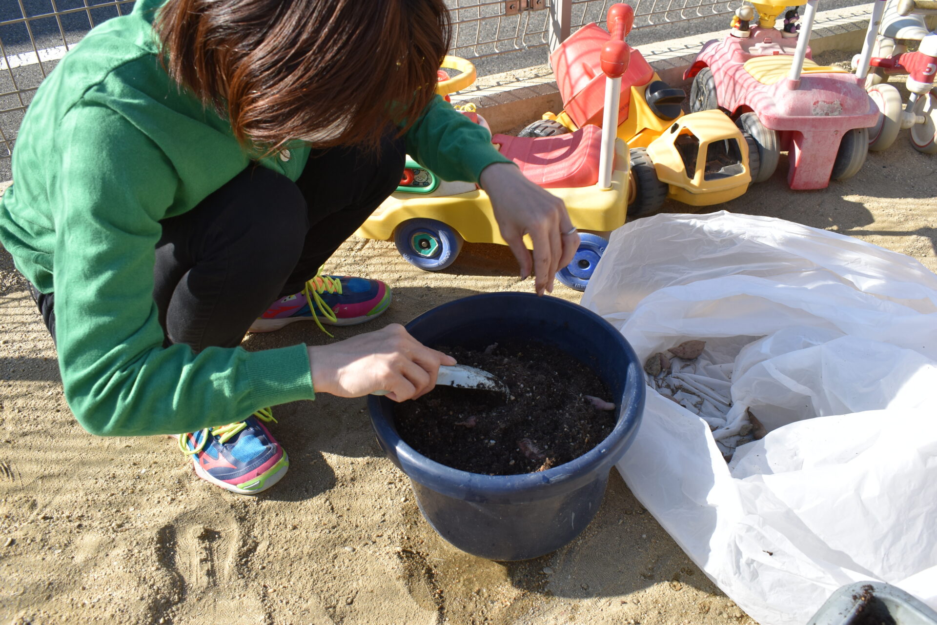 園長が園庭に出てきて、こちらは0歳児用に、スッと抜ける芋ほりプランターを作っていました。