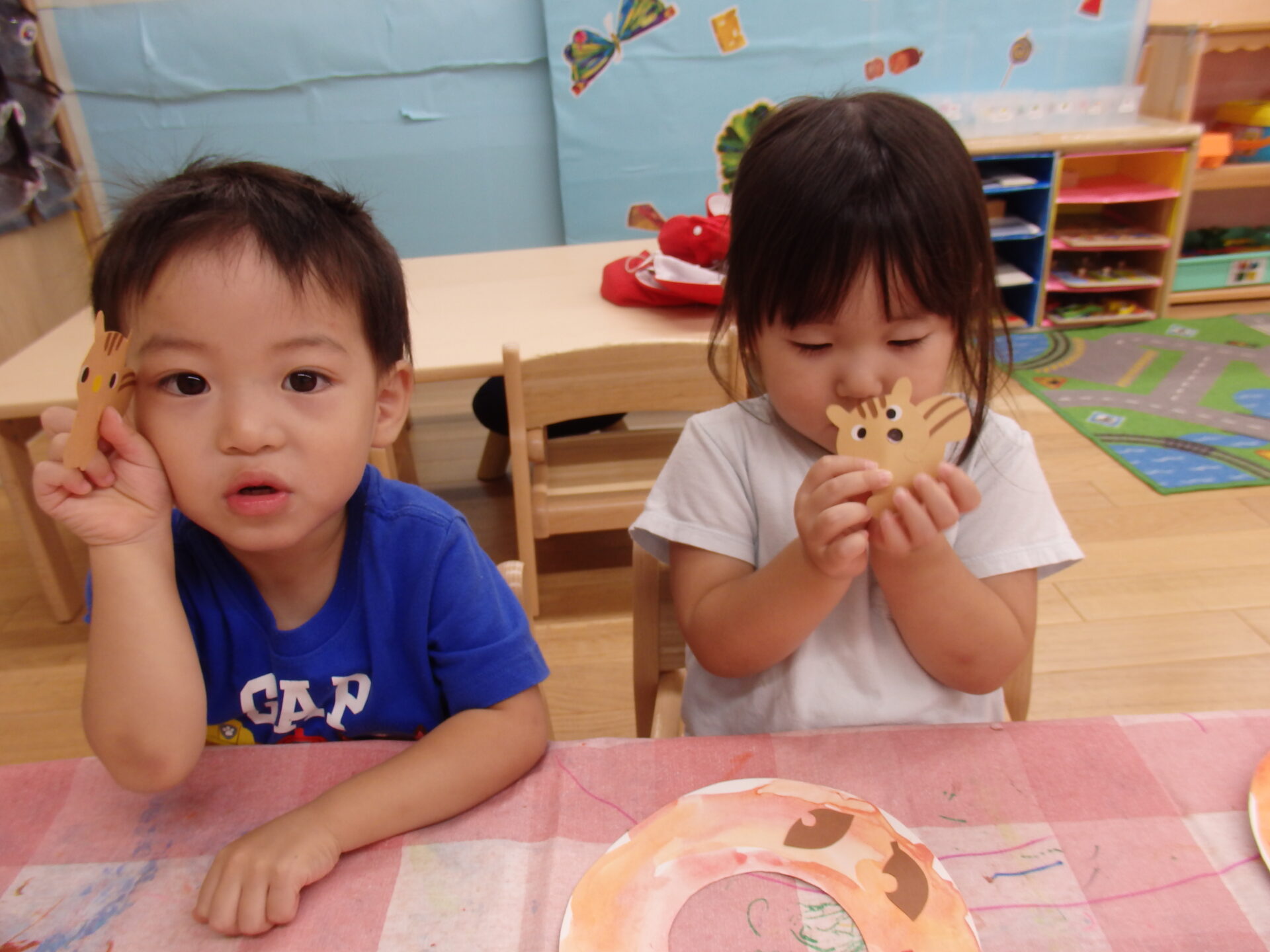 自分で目や鼻を貼ってあげると愛着が湧いたのか、完成後は「〇〇ちゃんのリスちゃん可愛いでしょう~♡」とカメラに向かって見せてくれました。
