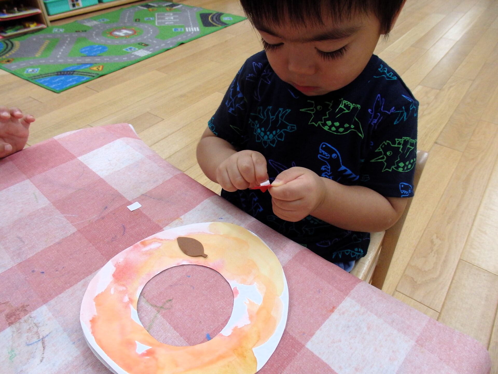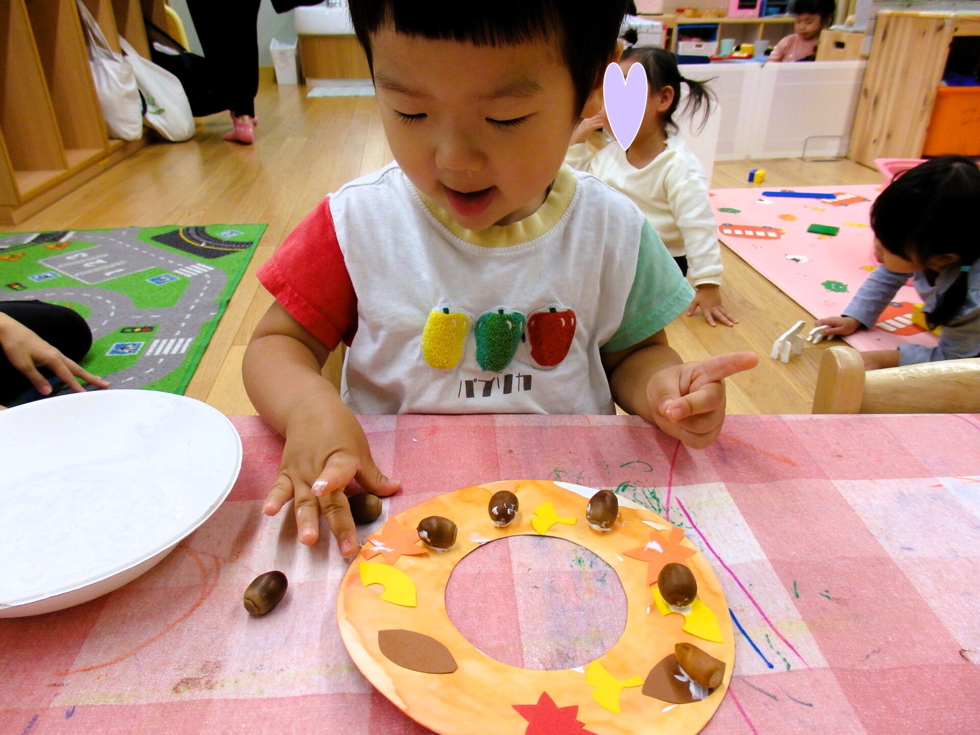最初は、指にボンドがつくとなんとも言えない表情を見せていた子ども達ですが、慣れてくるととても上手に指先でどんぐりをつまみ、ボンドをつけてから貼り付けていくことができていました!