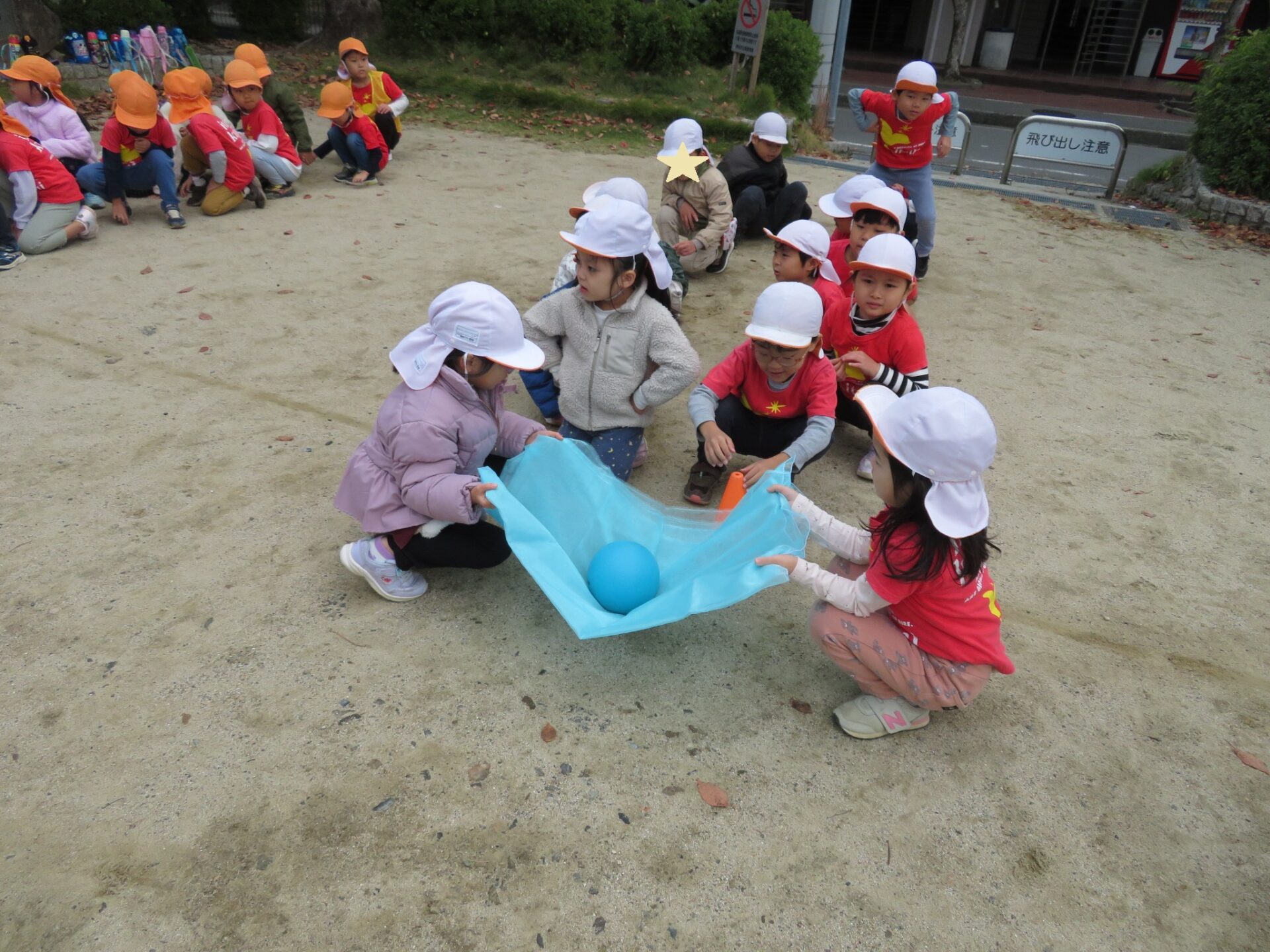 オーガンジーという薄い布の上にボールを乗せて、伊丹くじら保育園のお友だちと協力して運び、次のペアに繋いでいきます。