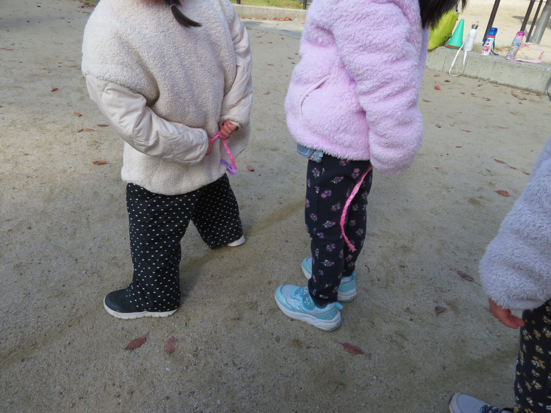 編んだすずらんテープに洗濯ばさみがくっついた『しっぽ』を装着して行う『しっぽ取り』ゲームです。
