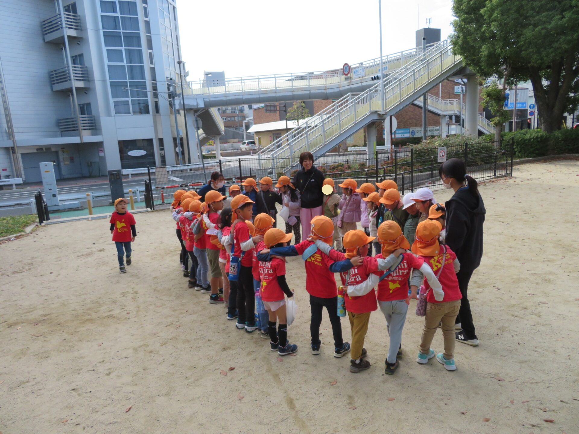 それぞれの園の端にいたお友だち同士がくっつきあい、ひとつの大きな円になりました。