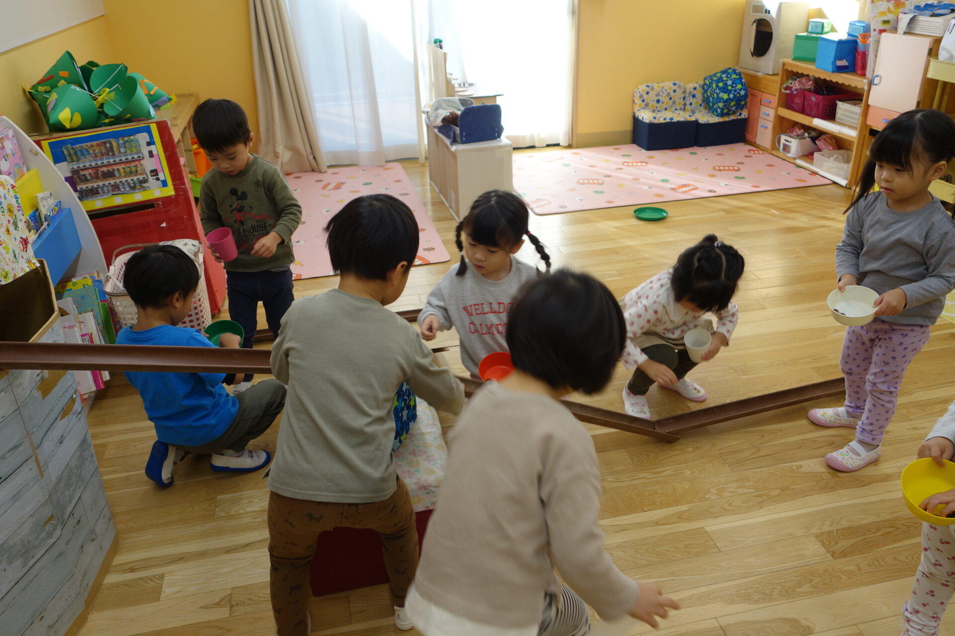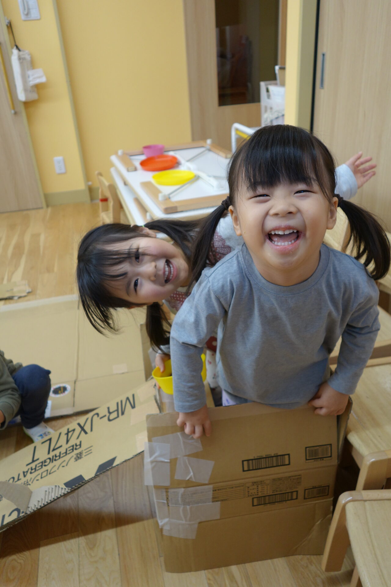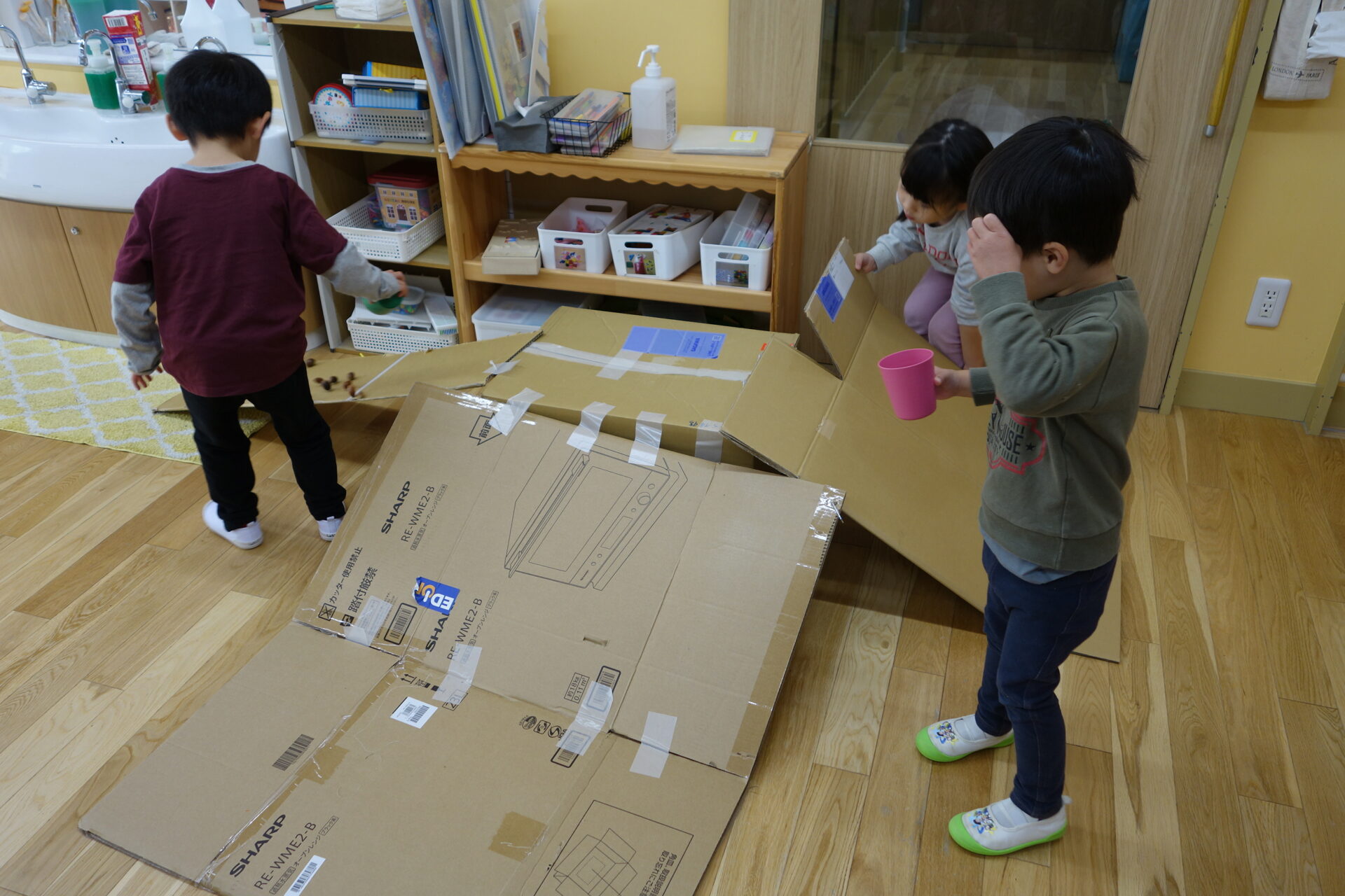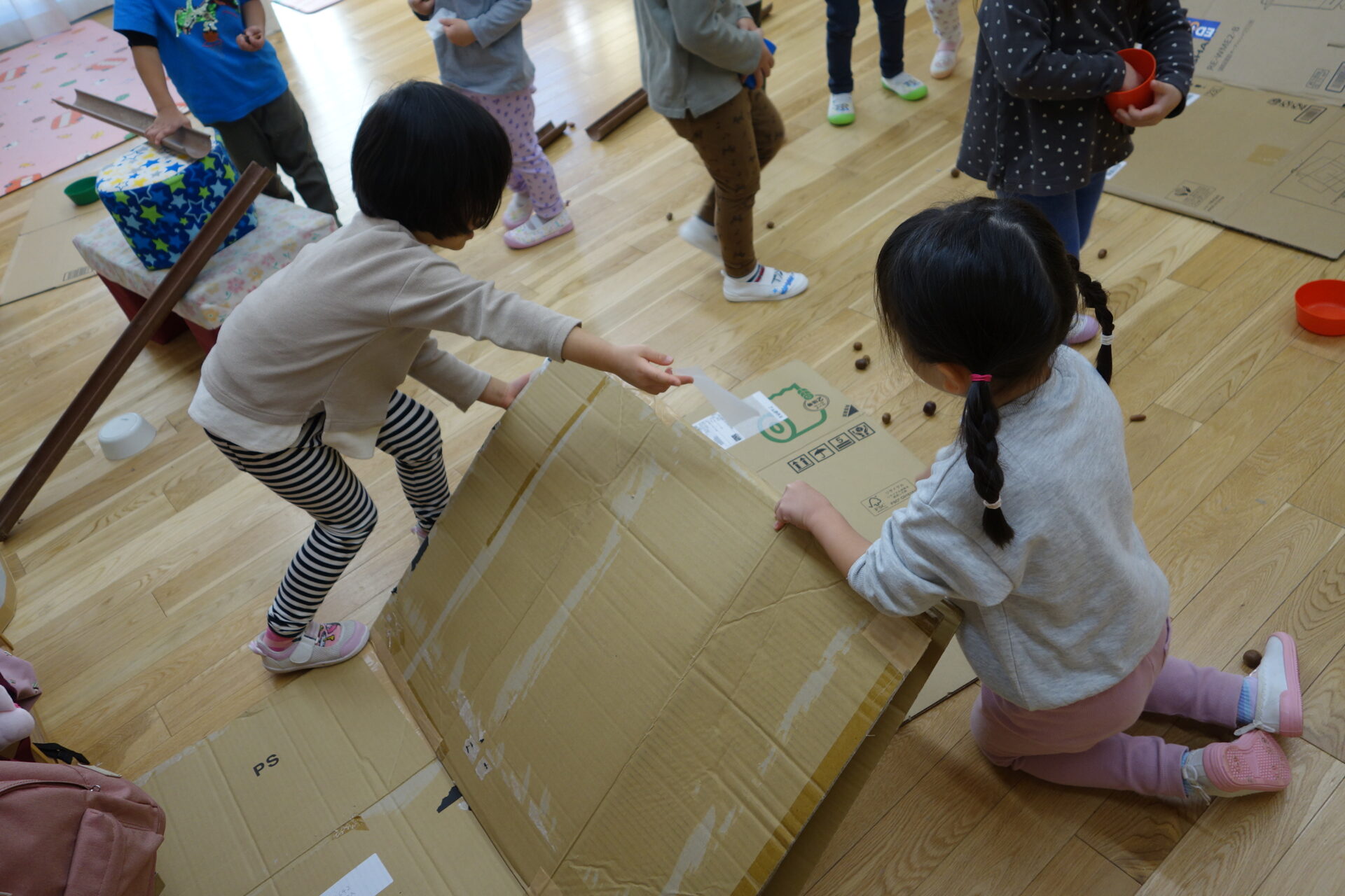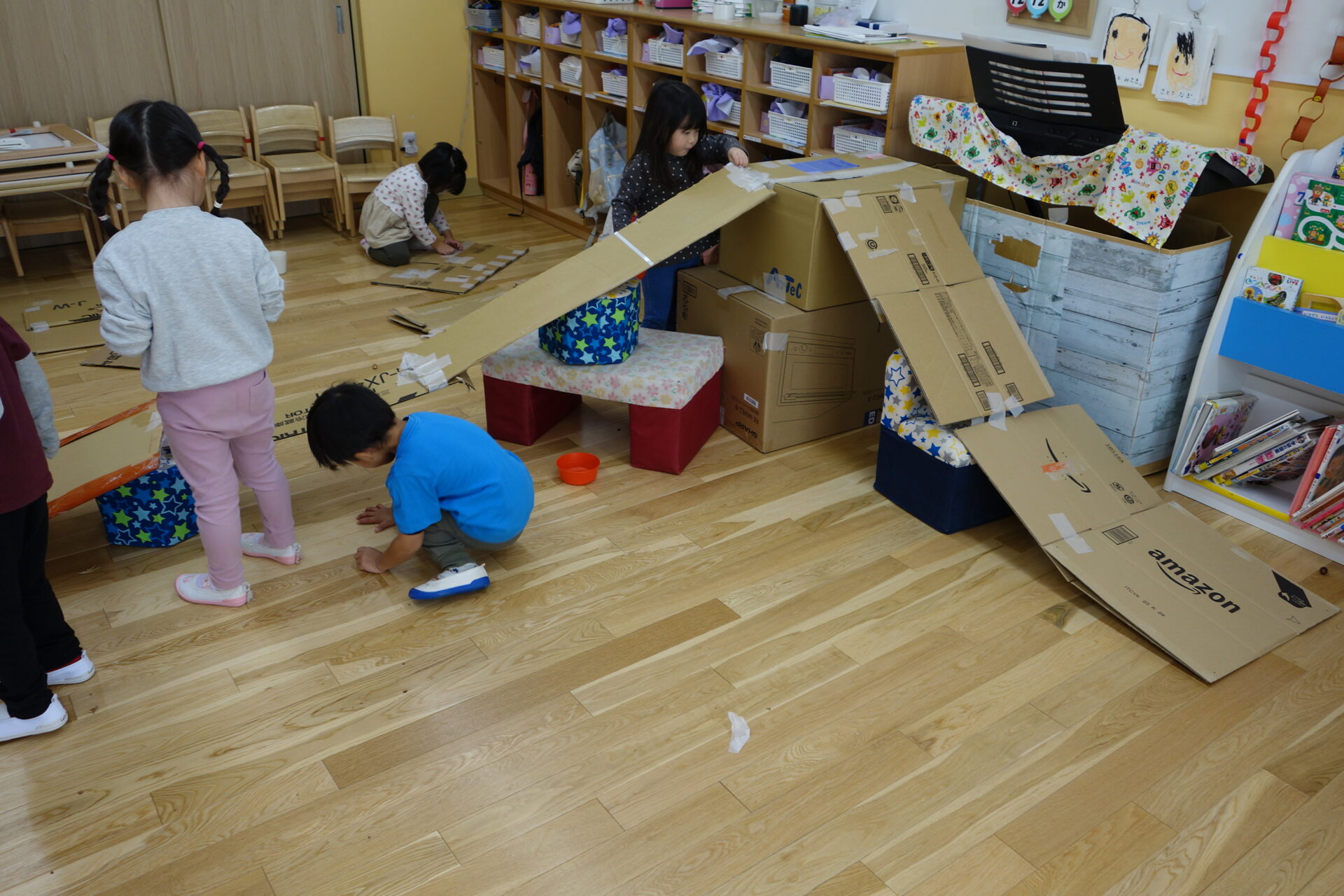 お友だちと協力しながら、テープを貼って滑り台を作っていきます。