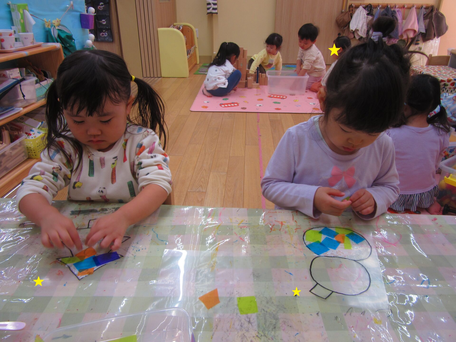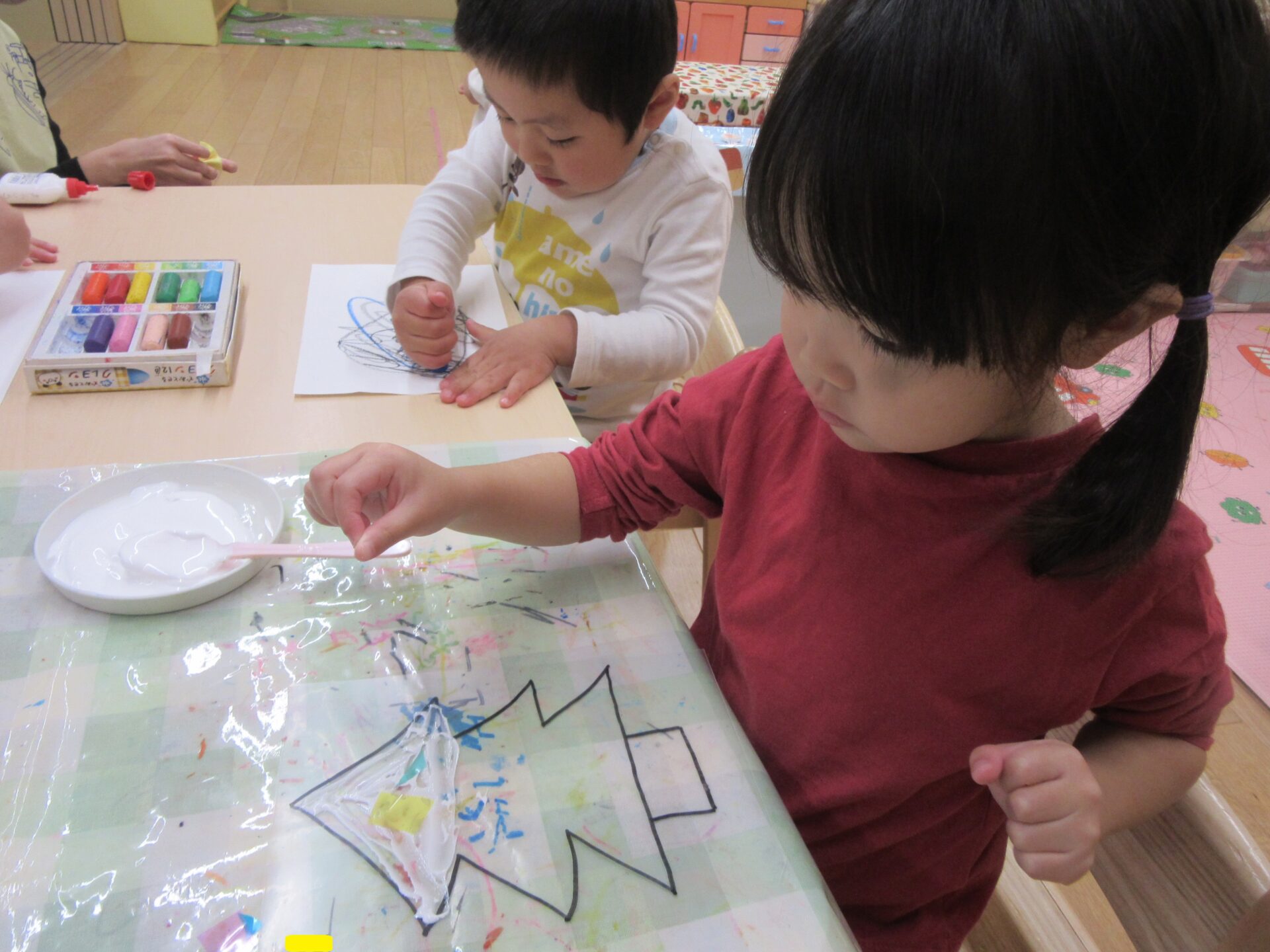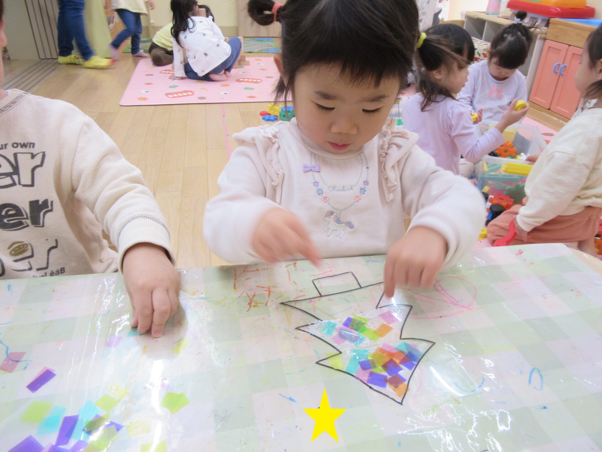 「どの色にしようかな?」と悩みながらも丁寧に貼っています。中には、ボンドが見えなくなるまで埋め尽くすように貼る子や手にボンドがくっつき苦戦しながら貼る子もいました!