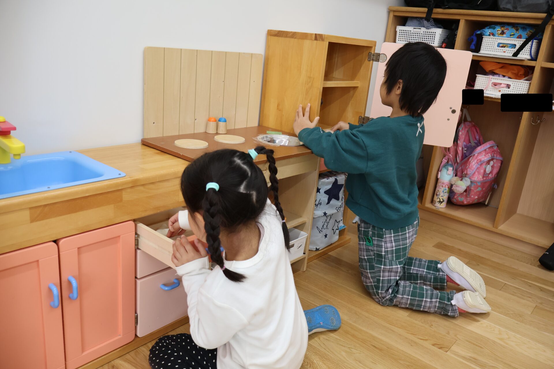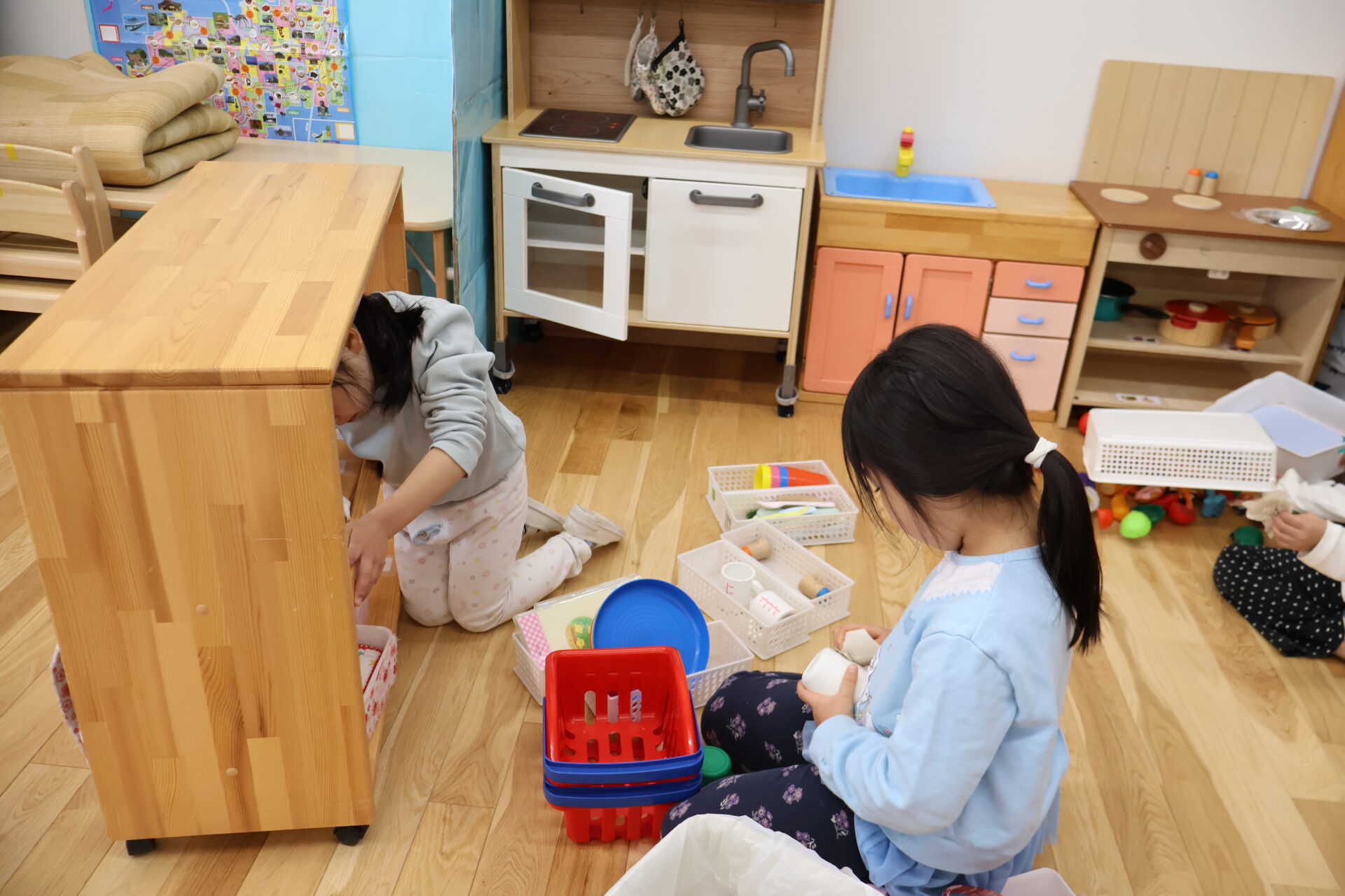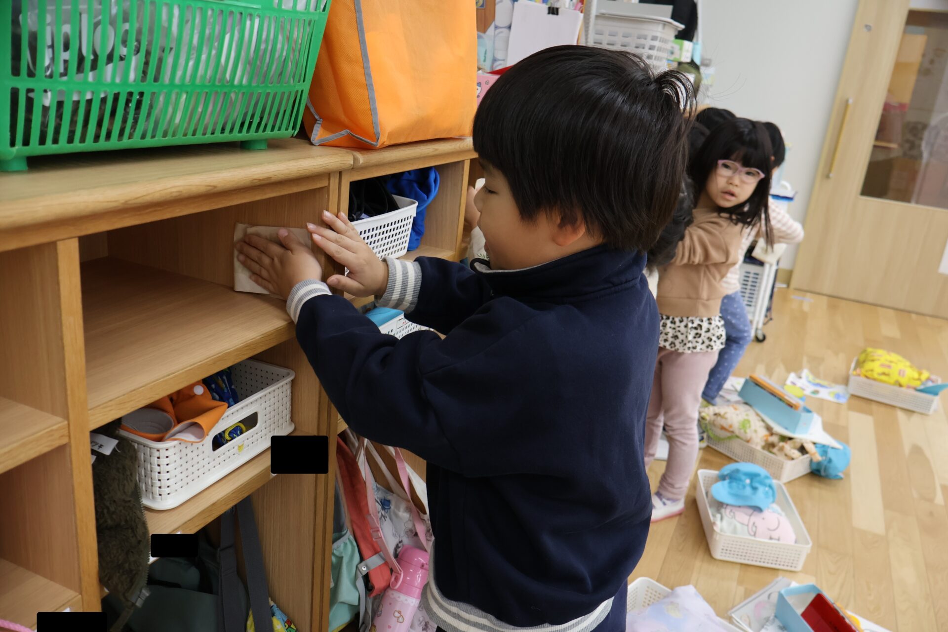 「おままごとも拭いていい?」と掃除できそうな場所を見つけては、引き出しの中や玩具のカゴもお掃除していきます。