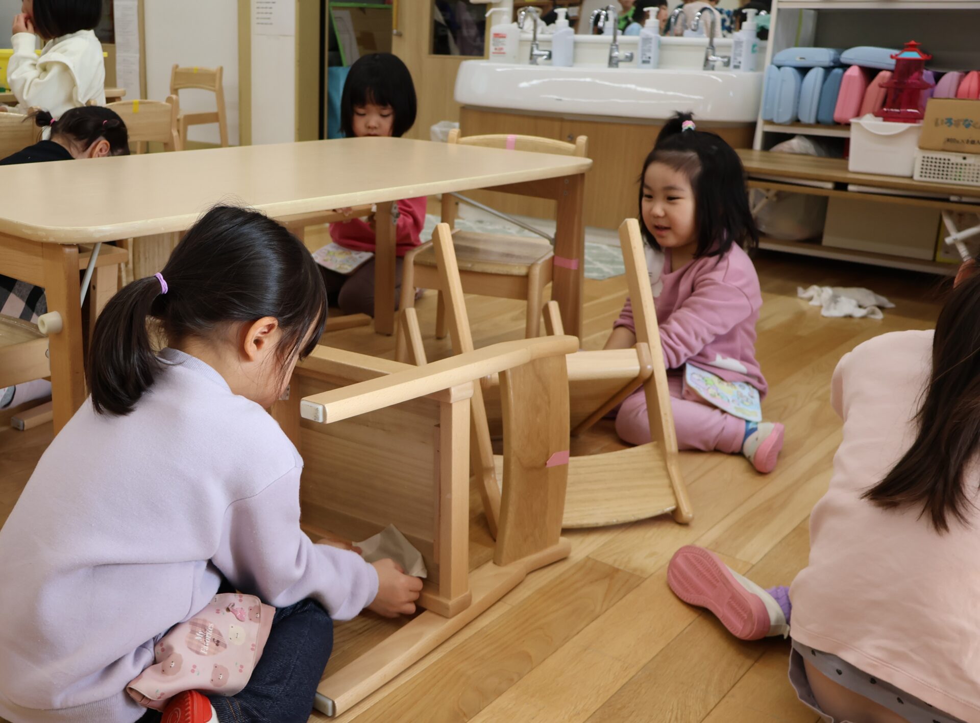「ここも拭いておこう!」と椅子の脚だけでなく、裏側まで丁寧に拭いていましたよ。