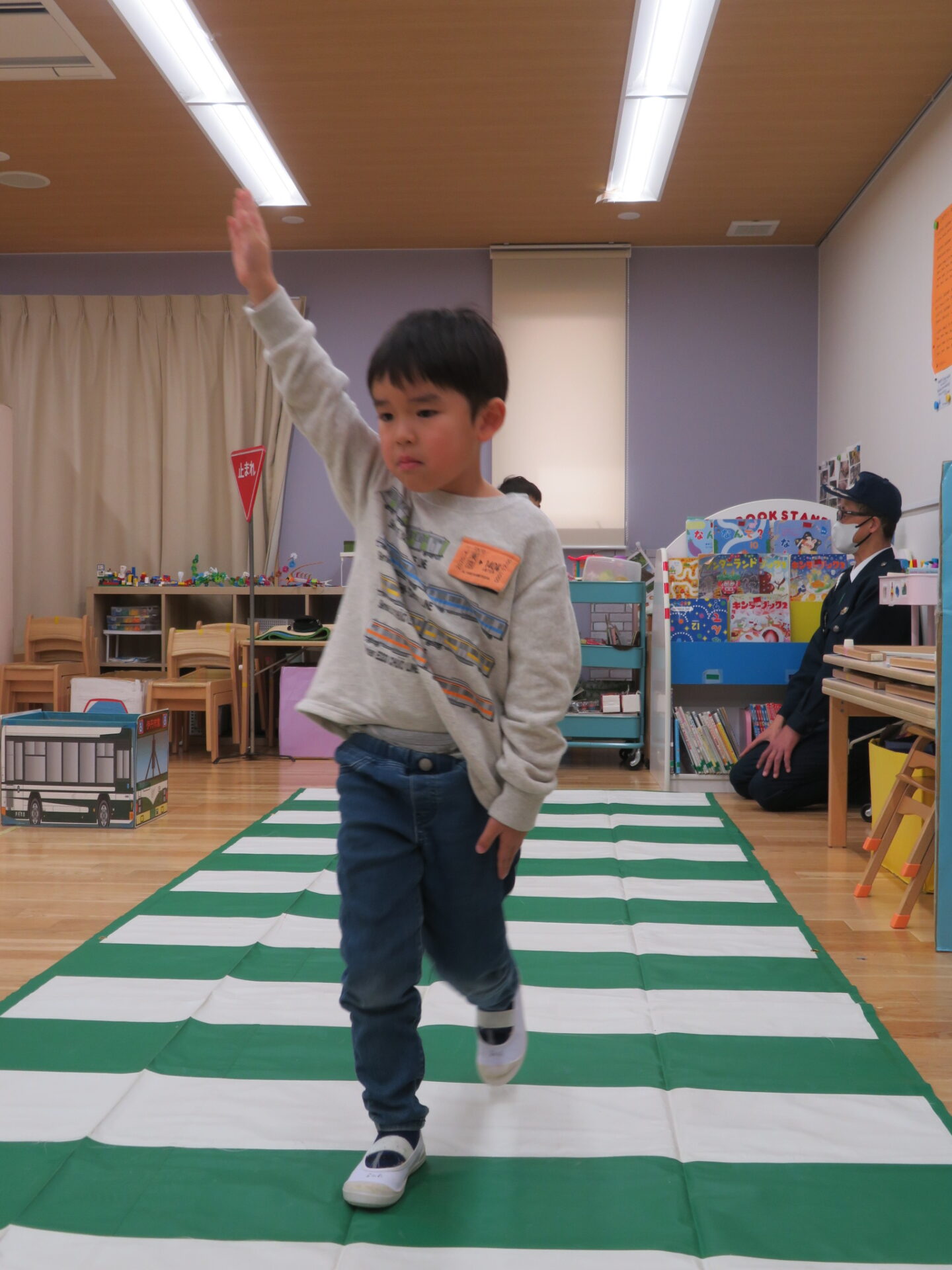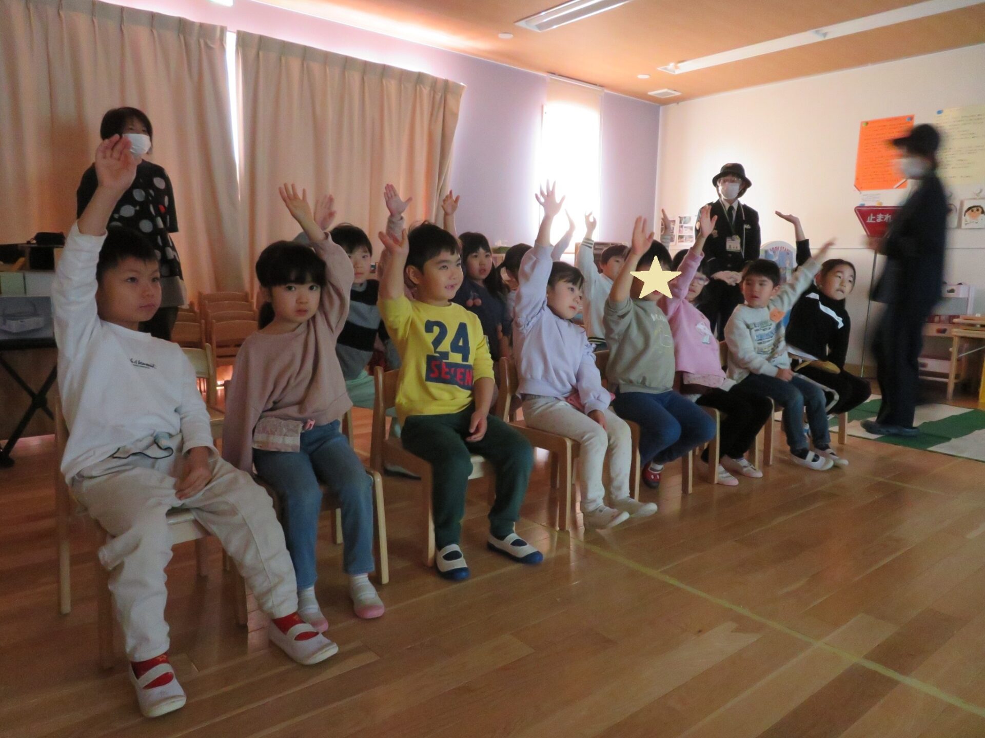お散歩の時に保育士から掛けられる言葉や、家庭で掛けられている言葉を思い出し警察官からの質問に手を挙げ、