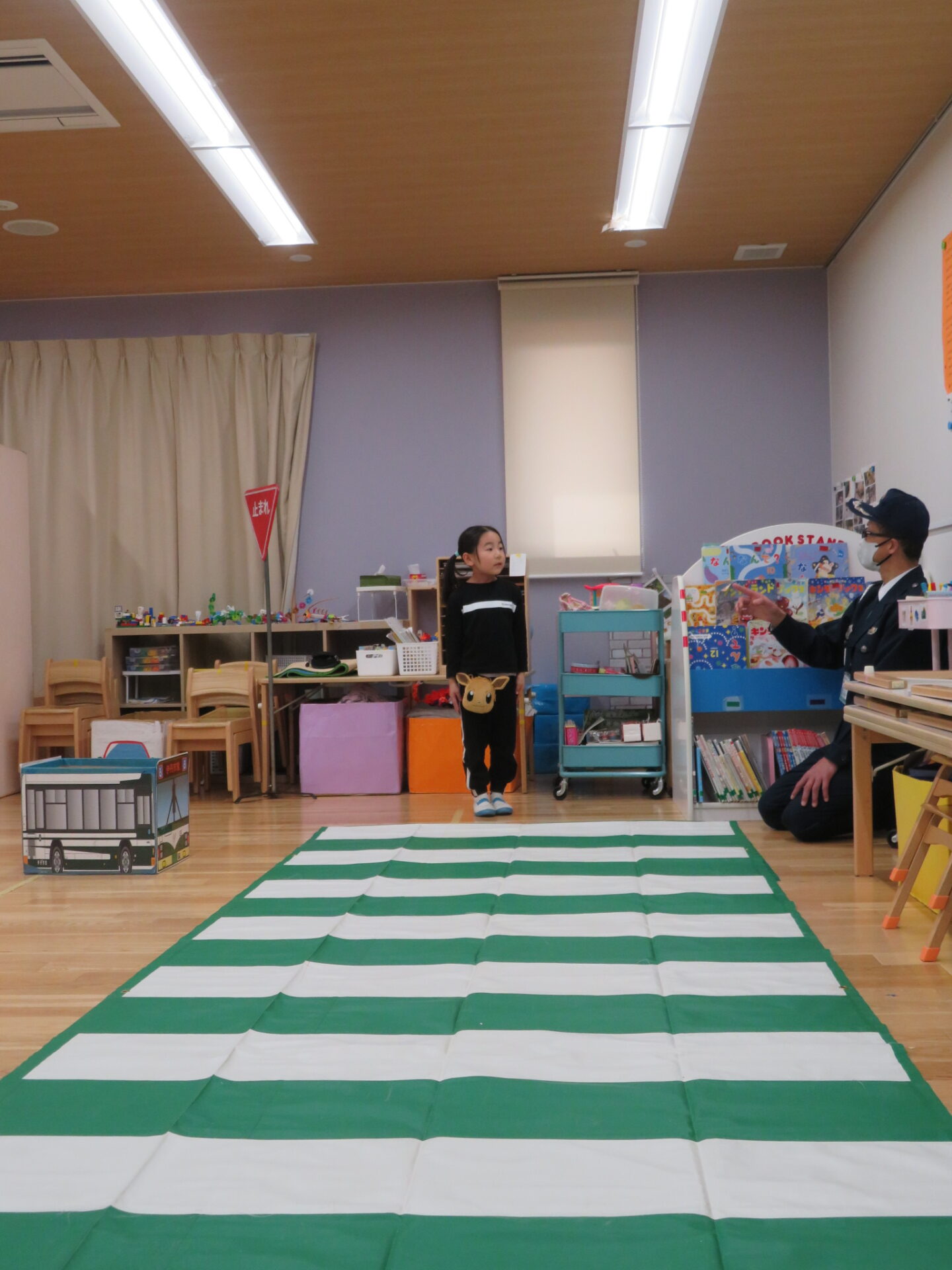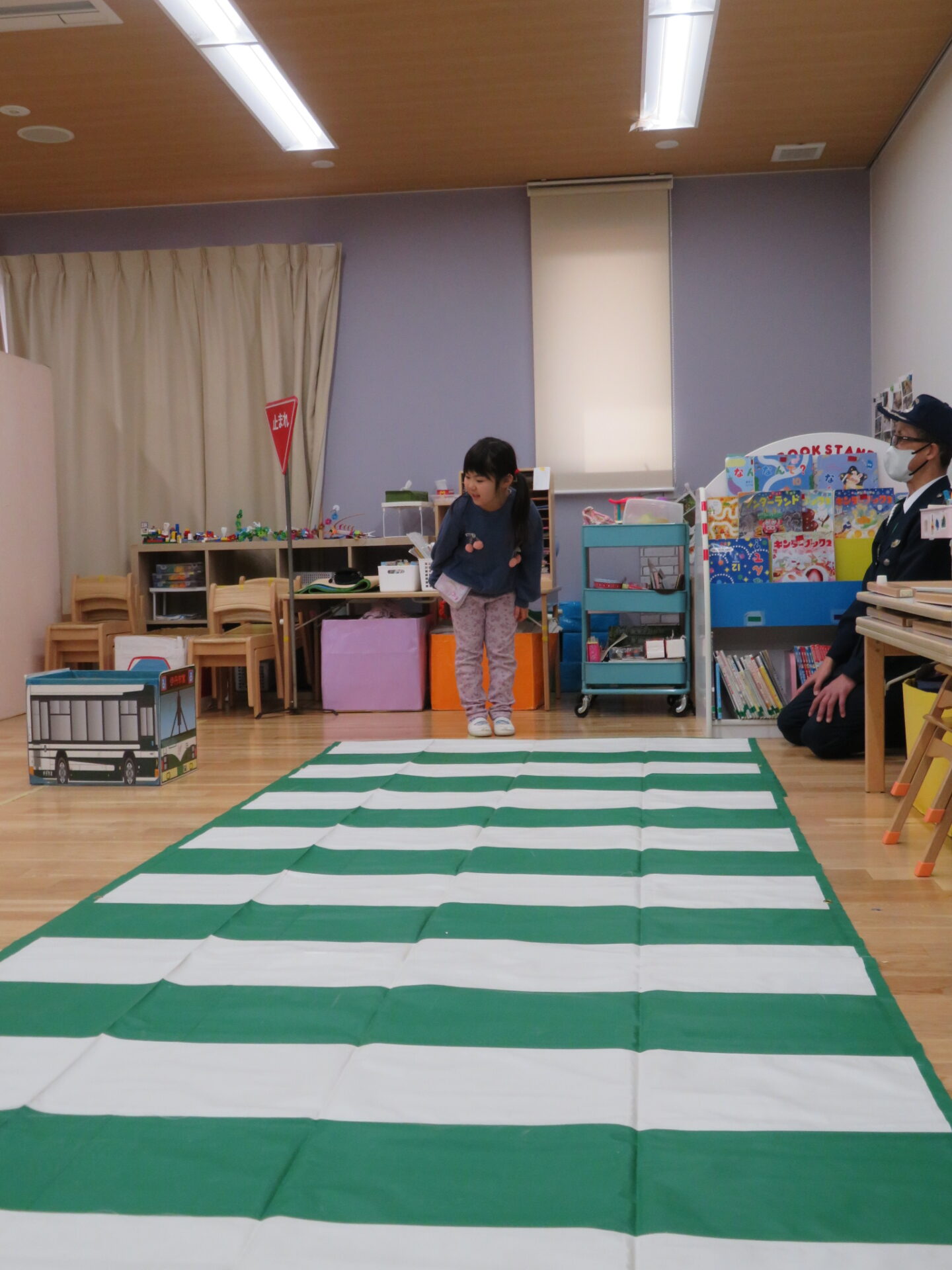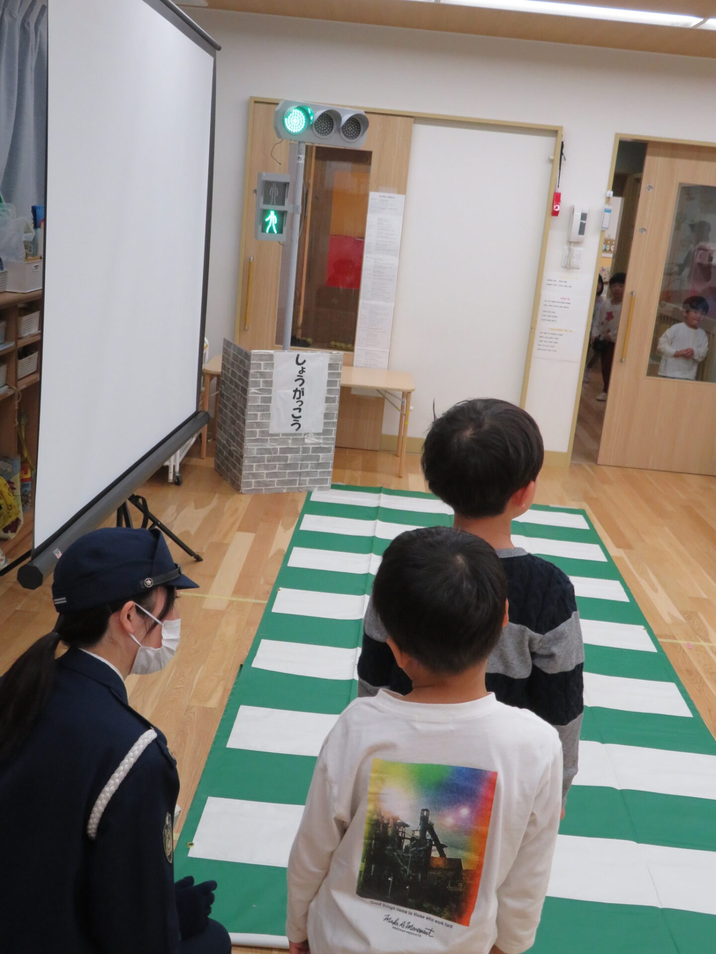 「どうするのかな?」と優しく訪ねてくれる警察官の言葉に「車が来てるから行っちゃだめ」「青になったから、確認する」と答え行動します。