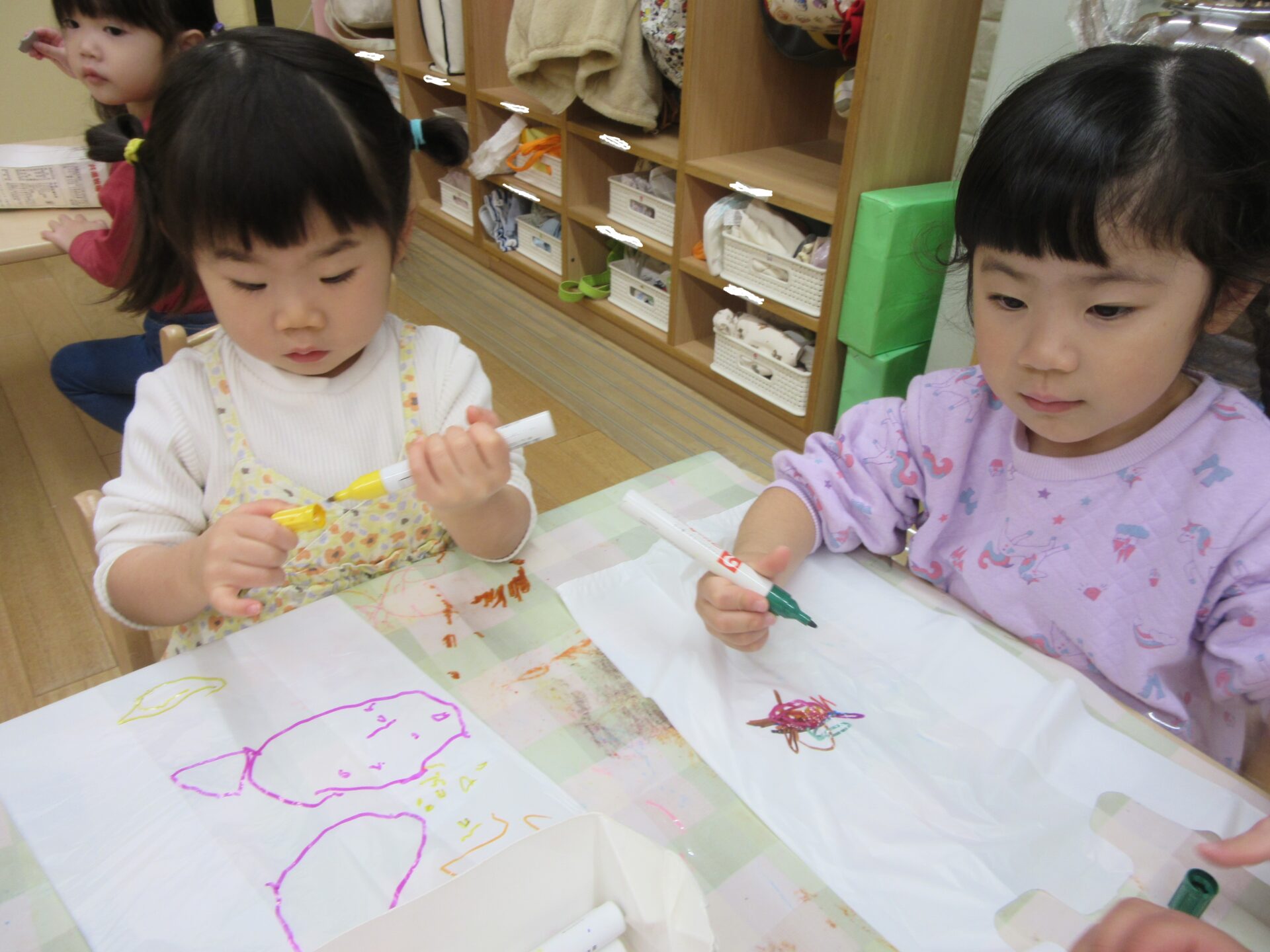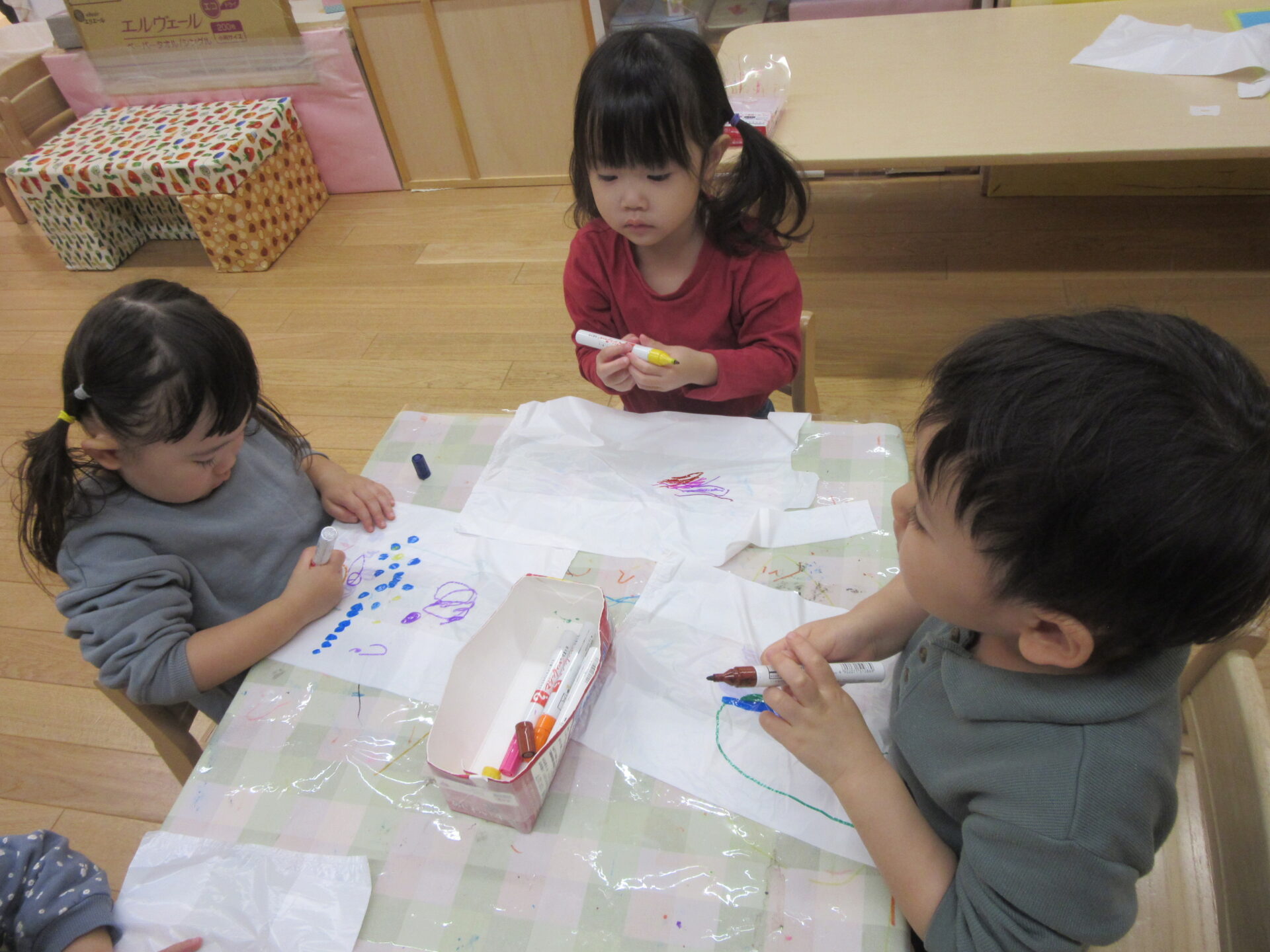 次に、ビニール袋に好きな絵を描いて凧を製作しました。