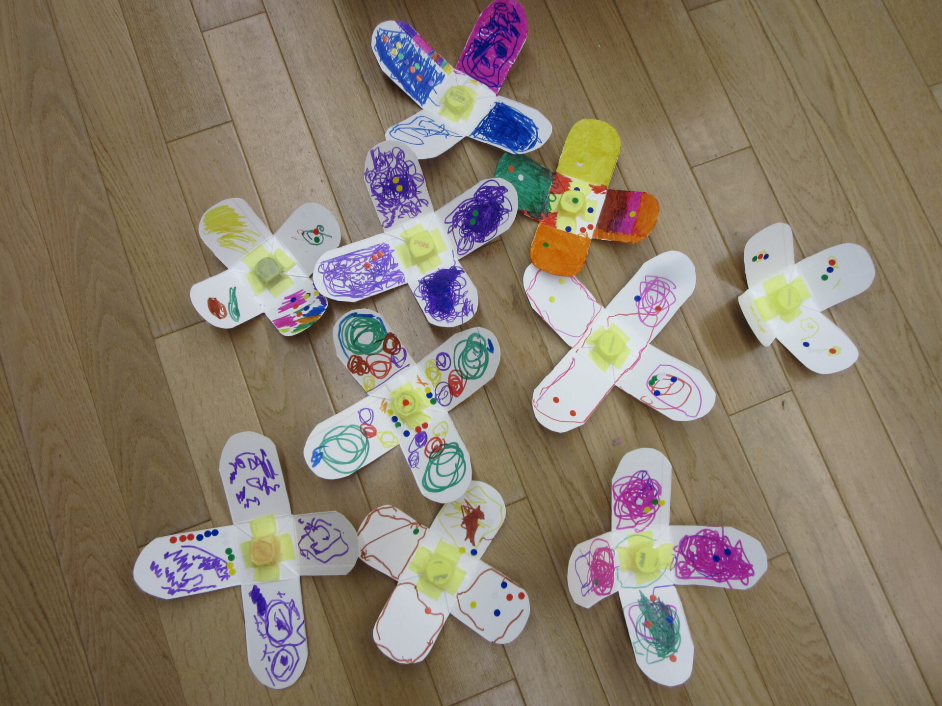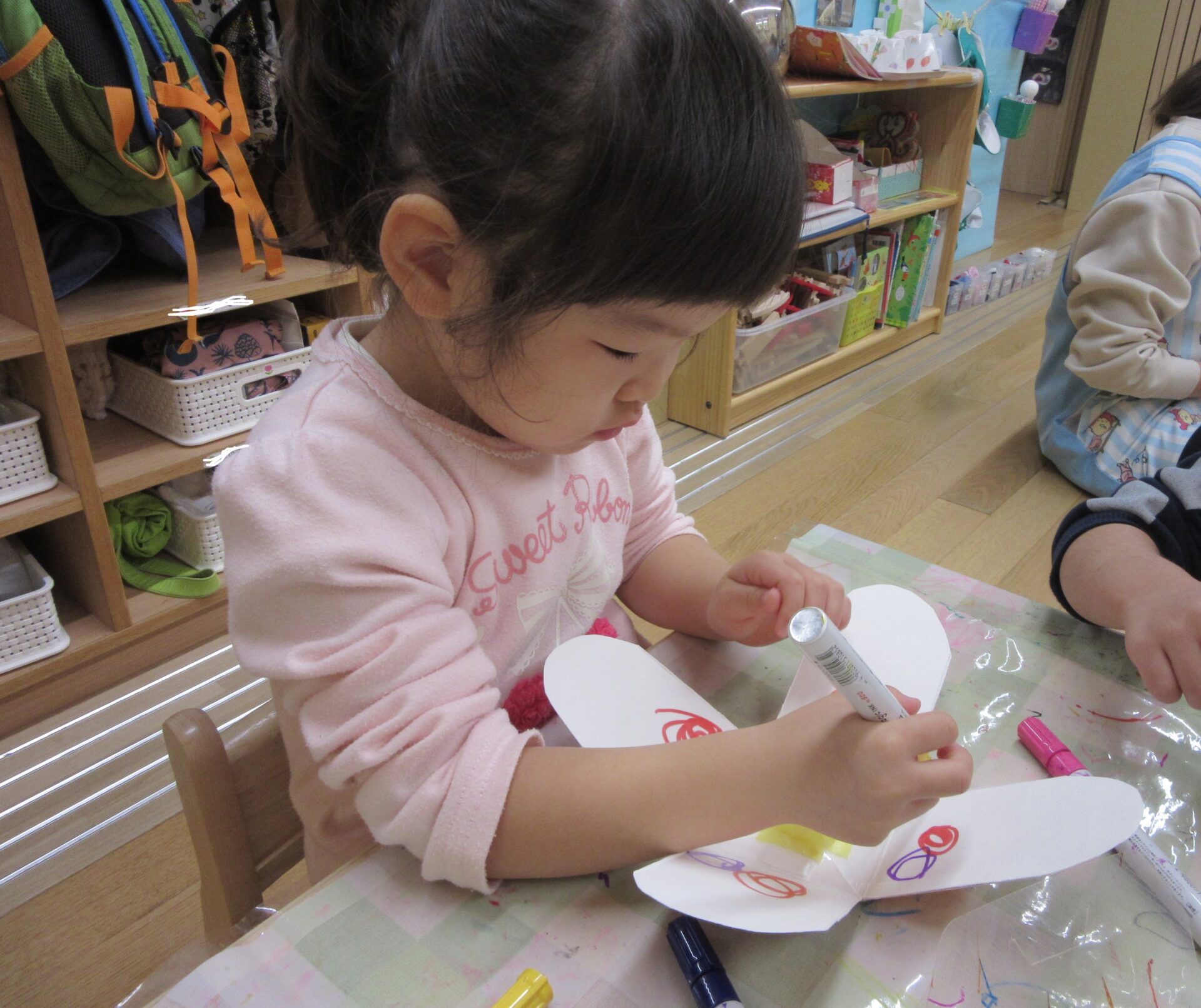 ペンを使って一人ひとり好きな絵を描いた後は、シールも貼って飾りつけしました。