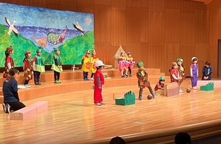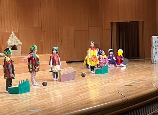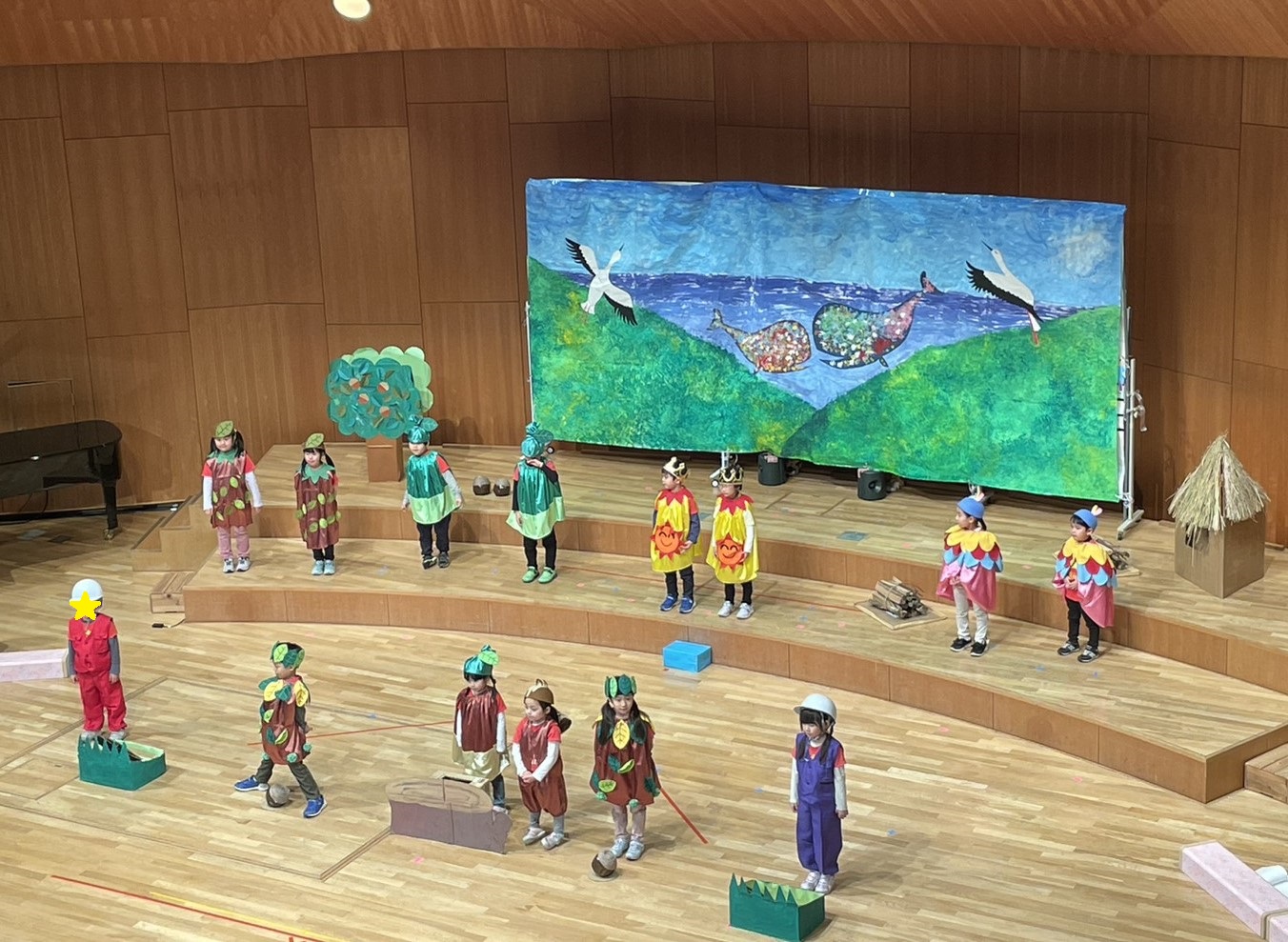 今回行ったオペレッタとは、オペラやミュージカルのように歌や台詞が入り混じった構成になっていて、海→陸→空に関する内容のオペレッタをそれぞれの園が披露することになり、梅ノ木くじら保育園が担当したのは「陸」で、陸から連想される「里山物語」をオペレッタの題目に選びました。