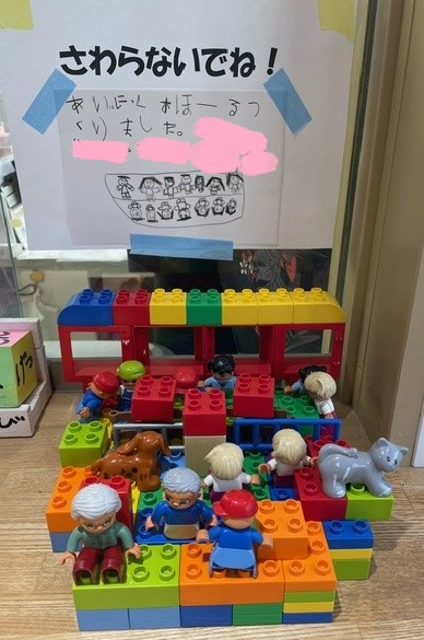 こちらはオペレッタの練習がまった頃から「里山ってどんな所かな?」と興味を持ち始め、さらにそこから自分たちでブロックなどを用いて表現する姿が見られ始めました。