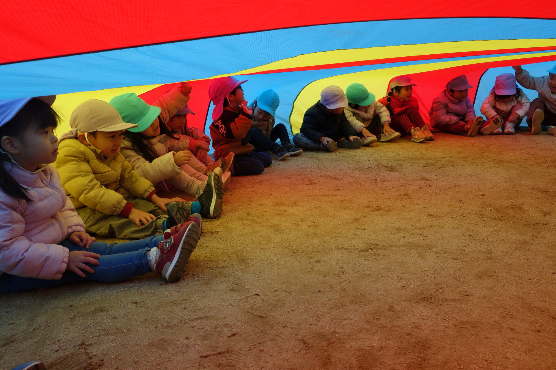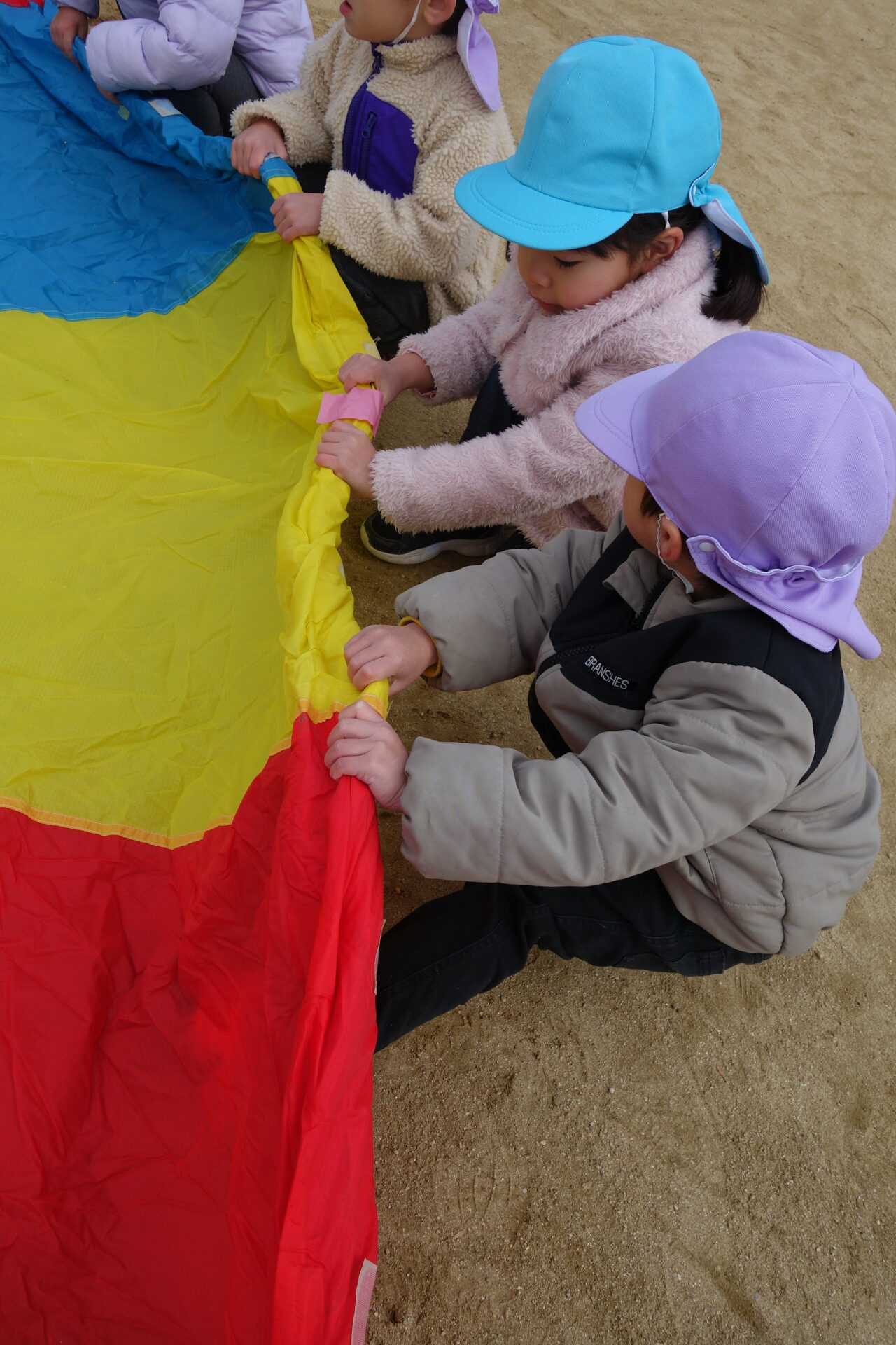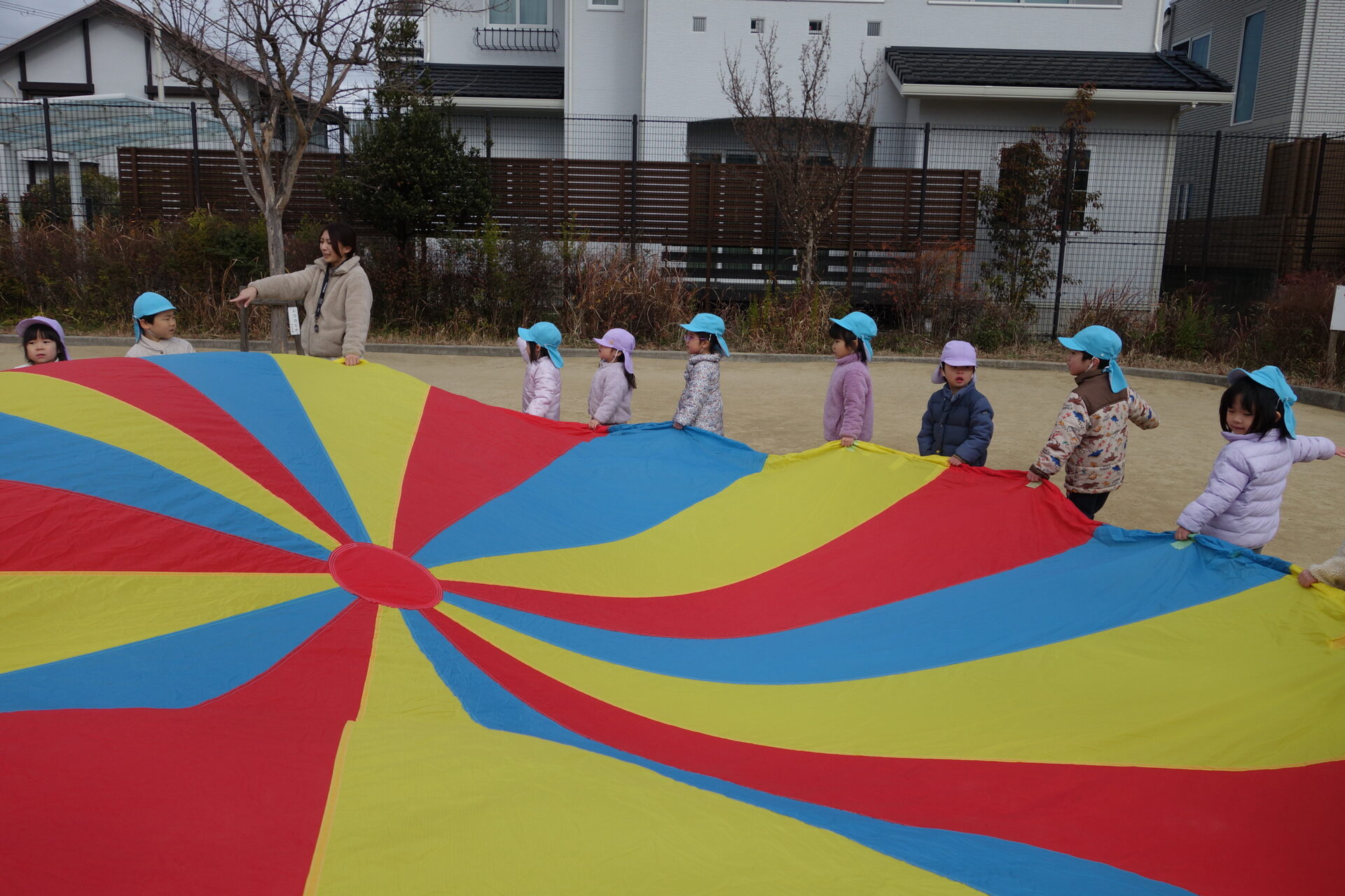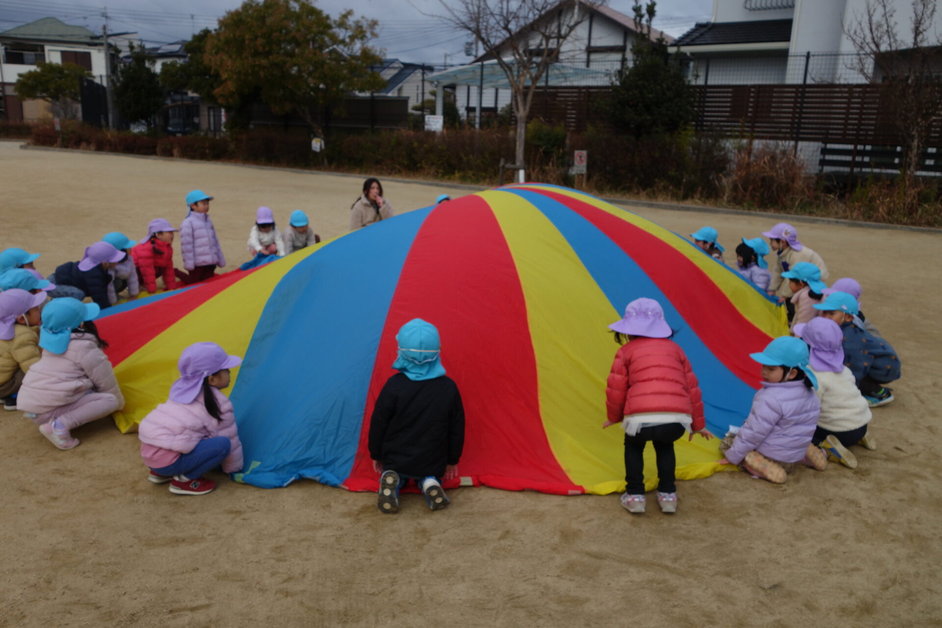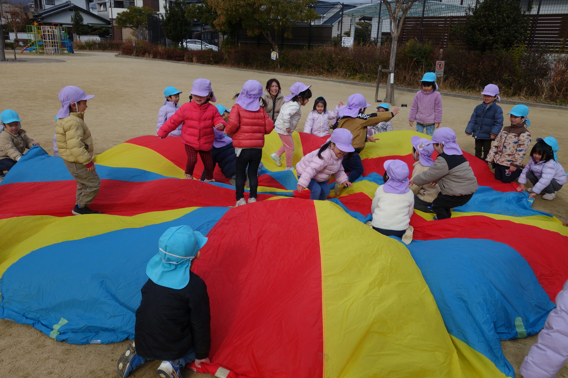 今日は3歳児と4歳児が一緒に公園でパラバルーンをしました。