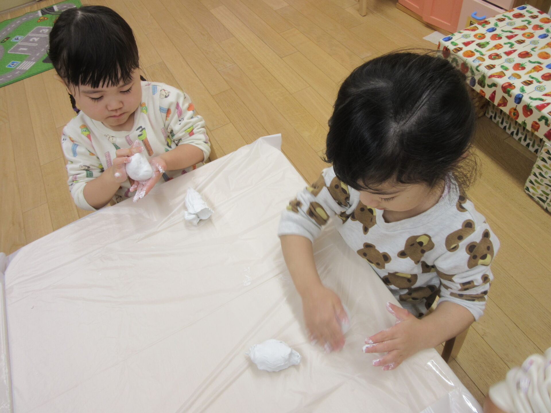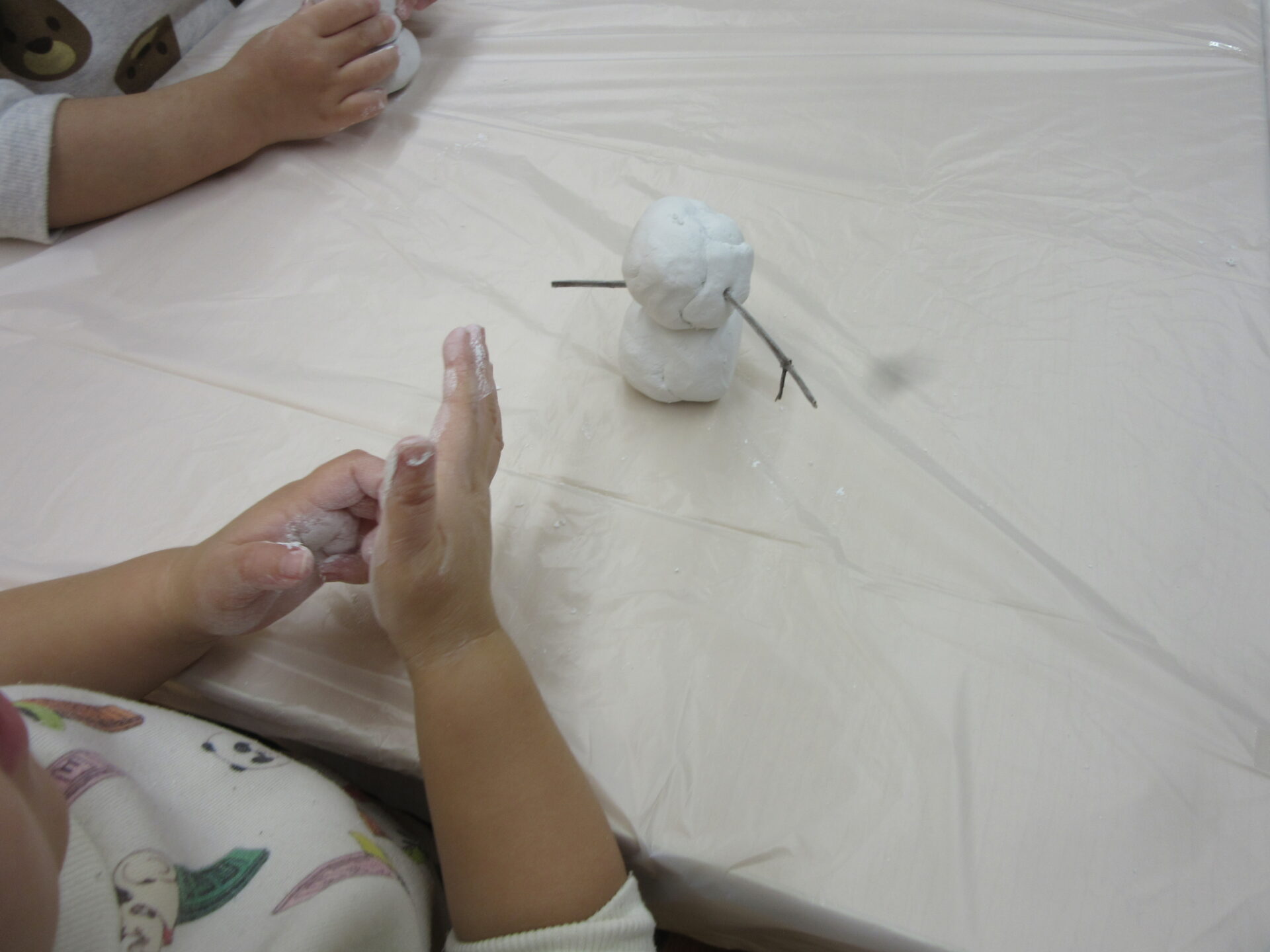 子ども達は何かが分からず「ん?」と不思議そうな表情!そこで保育者が「ゆきだよ~!」と言うと「わぁ!」と気付き「ゆきゆき~!」「せんせいの服に白いのついているよ~」と一気に大興奮でした。
