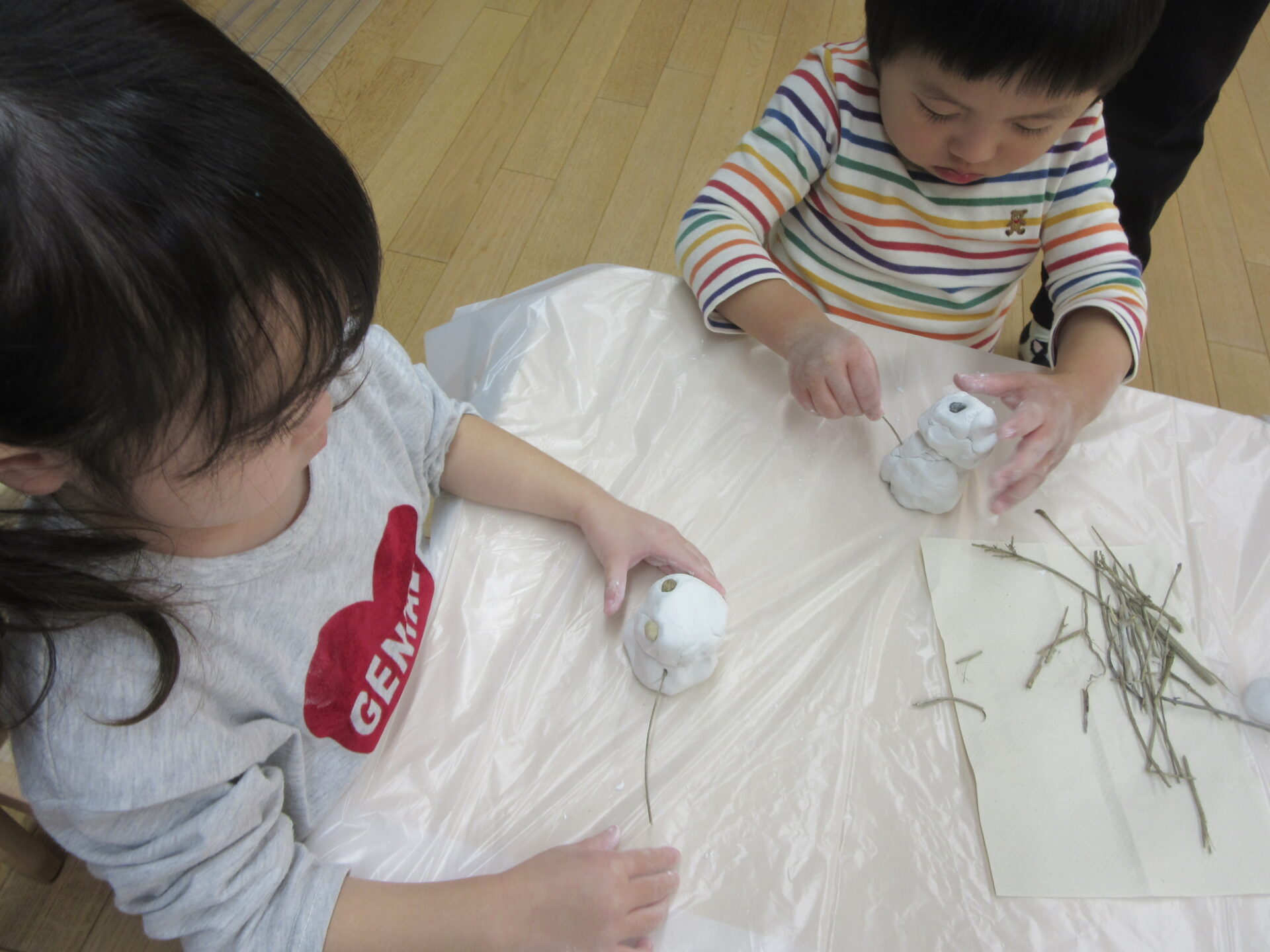 出来たら紙粘土を2つ重ね、園庭で拾った小枝や石、貝殻を使って目や口、手を付けました。